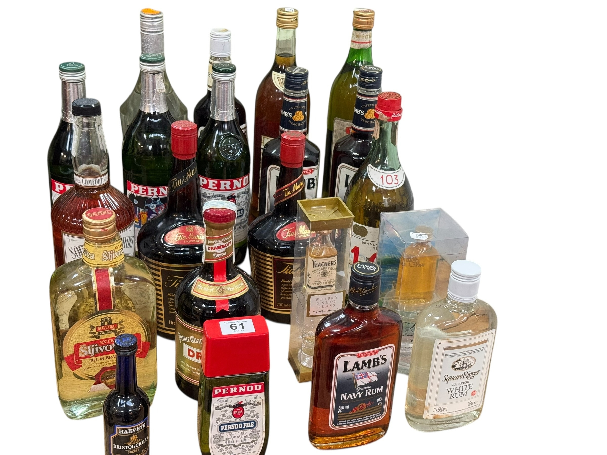 Bottles of spirits including Lambs Navy Rum, Pernod, Tia Maria, Southern Comfort, etc.