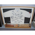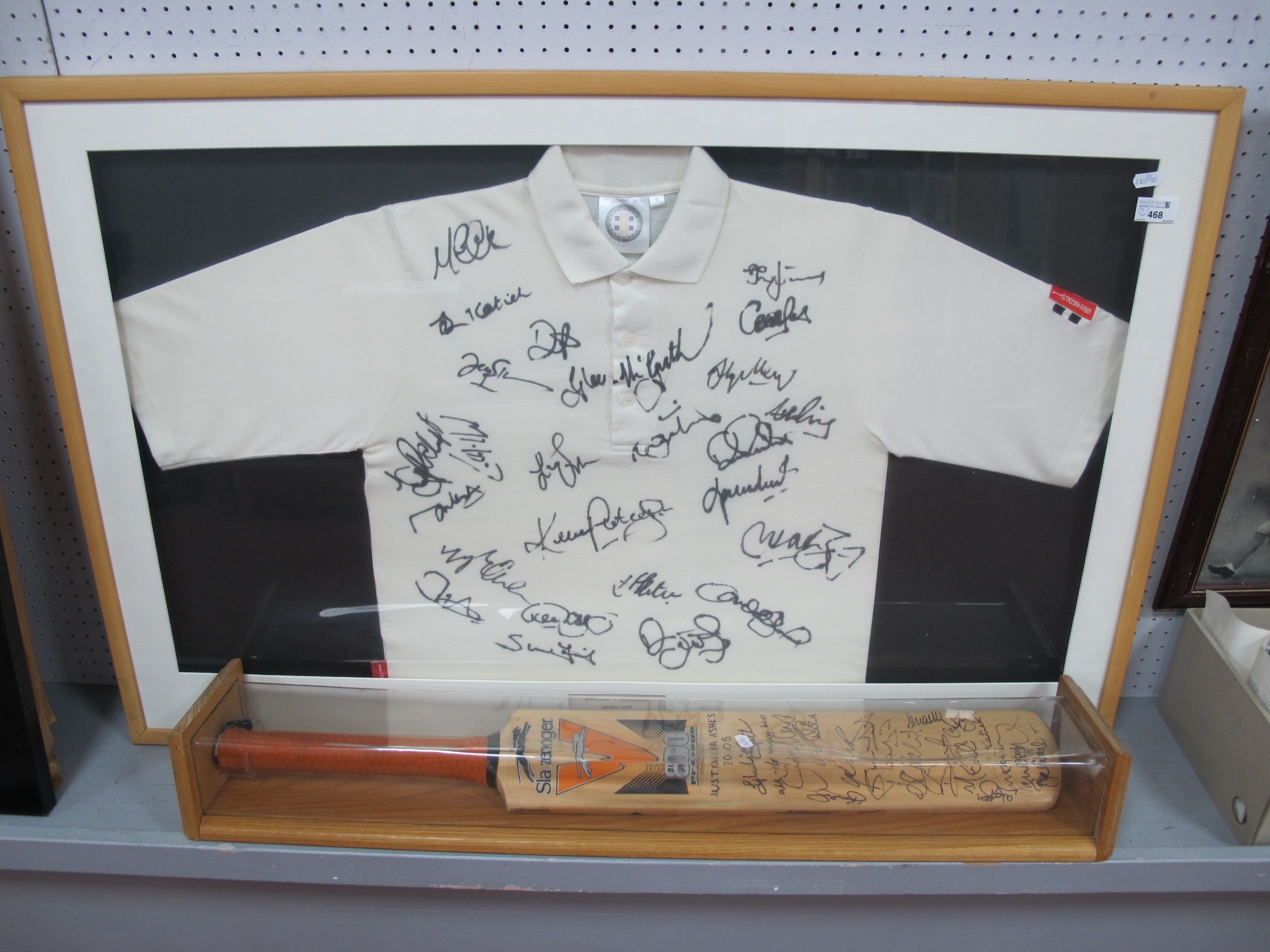 Cricket - The Ashes 2005 Gray Nichols White Shirt, black pen signed by approximately twenty-five players, including McGrath, Pietersen and many others on a Slazenger bat, including Ponting, Lee, Gilchrist, Boon, Warne (all unverified), both framed. Two Whiskey glasses etched for details of game at Lord's. Two sets of programmes from the five Test Matches, some tickets, two tour ties.
