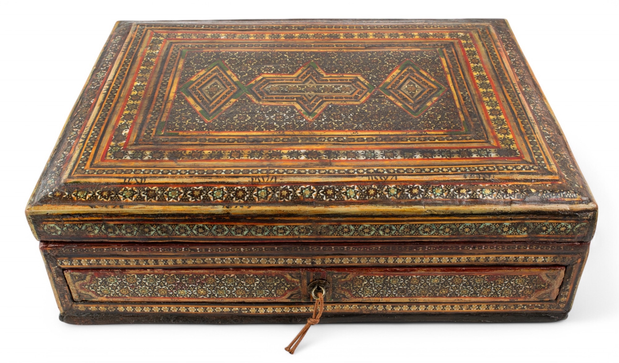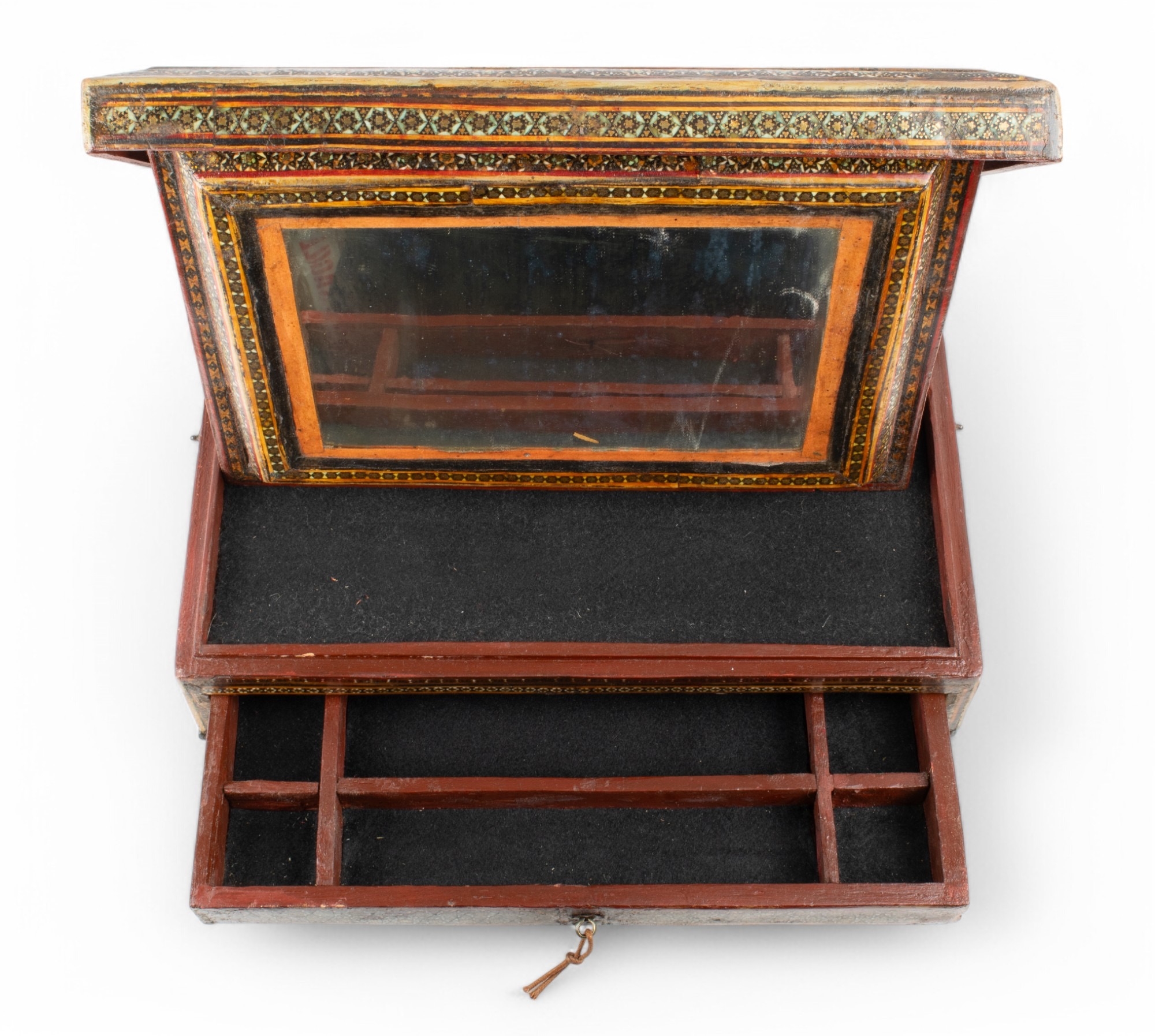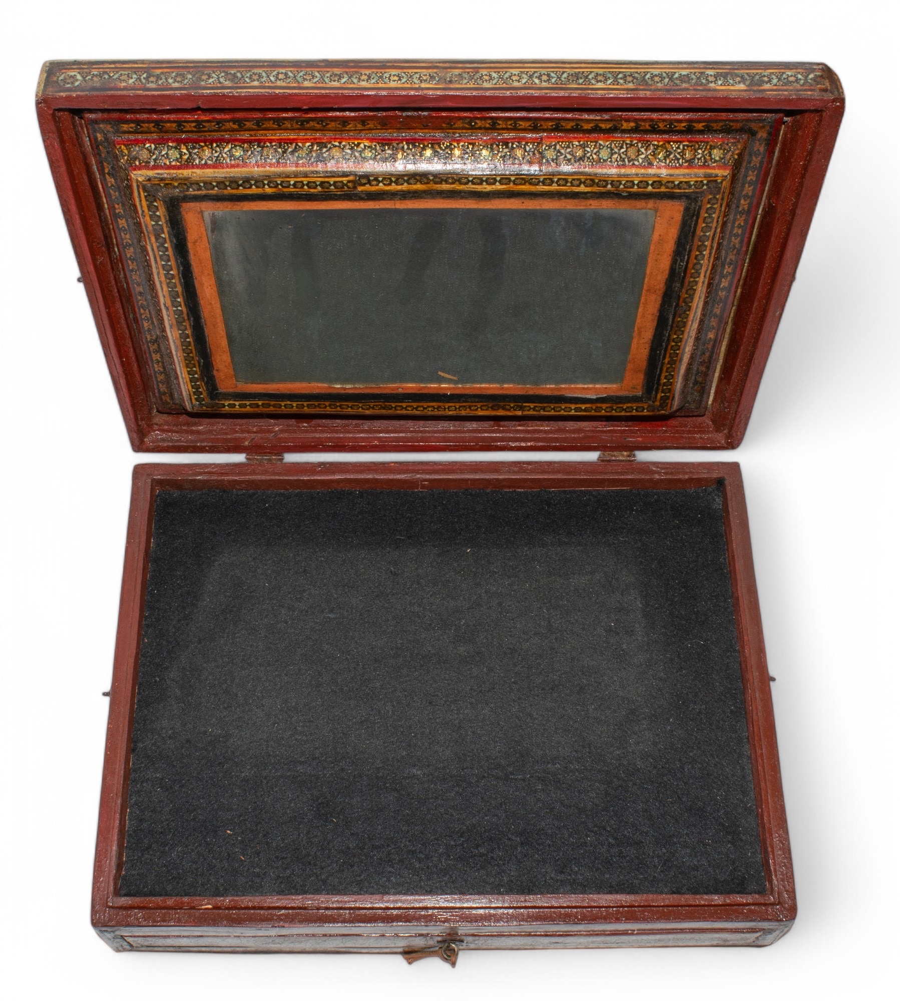 A vanity box, with khatamkari marquetry decoration, lacquer finish and internal folding mirror and single drawer