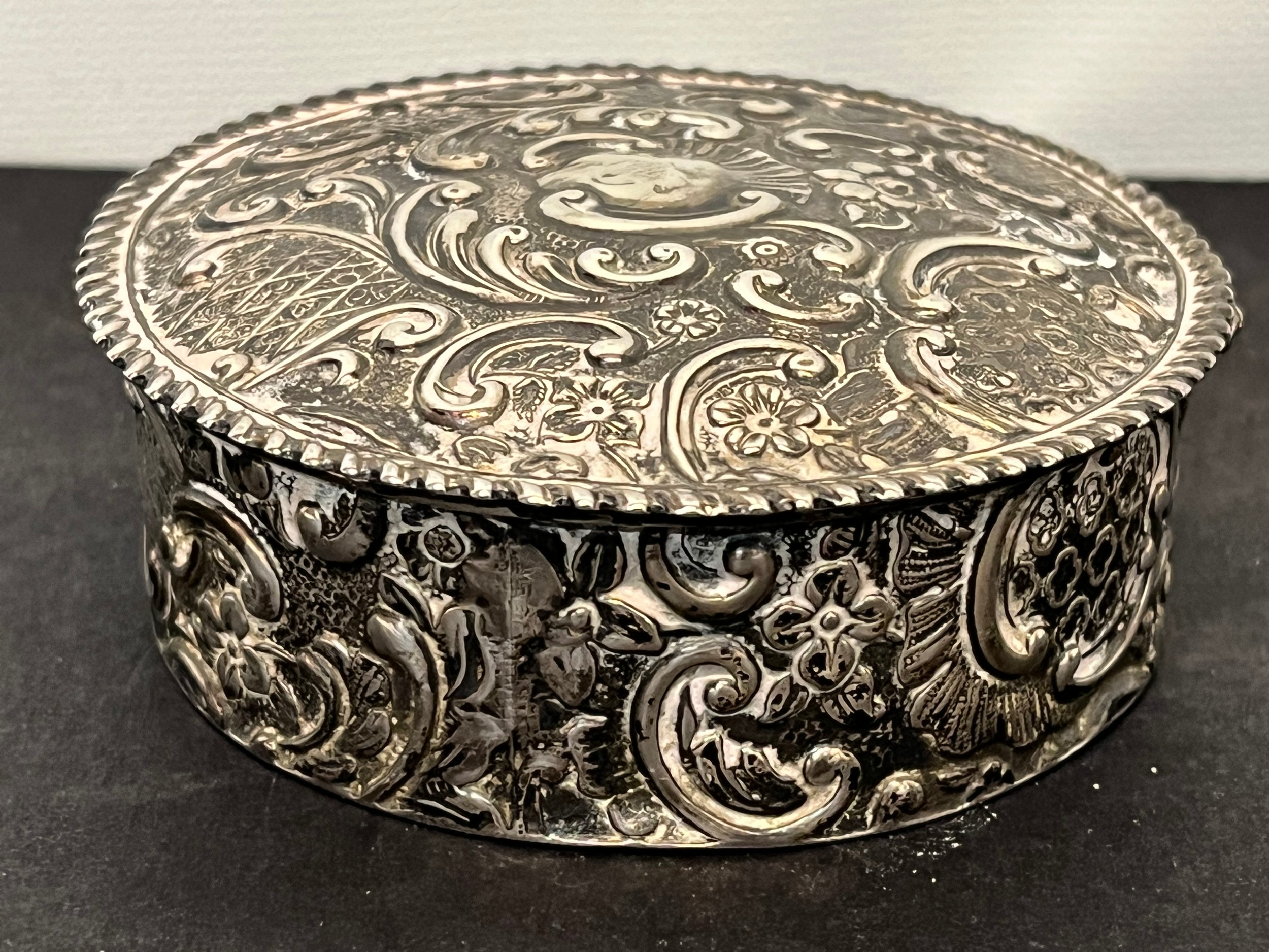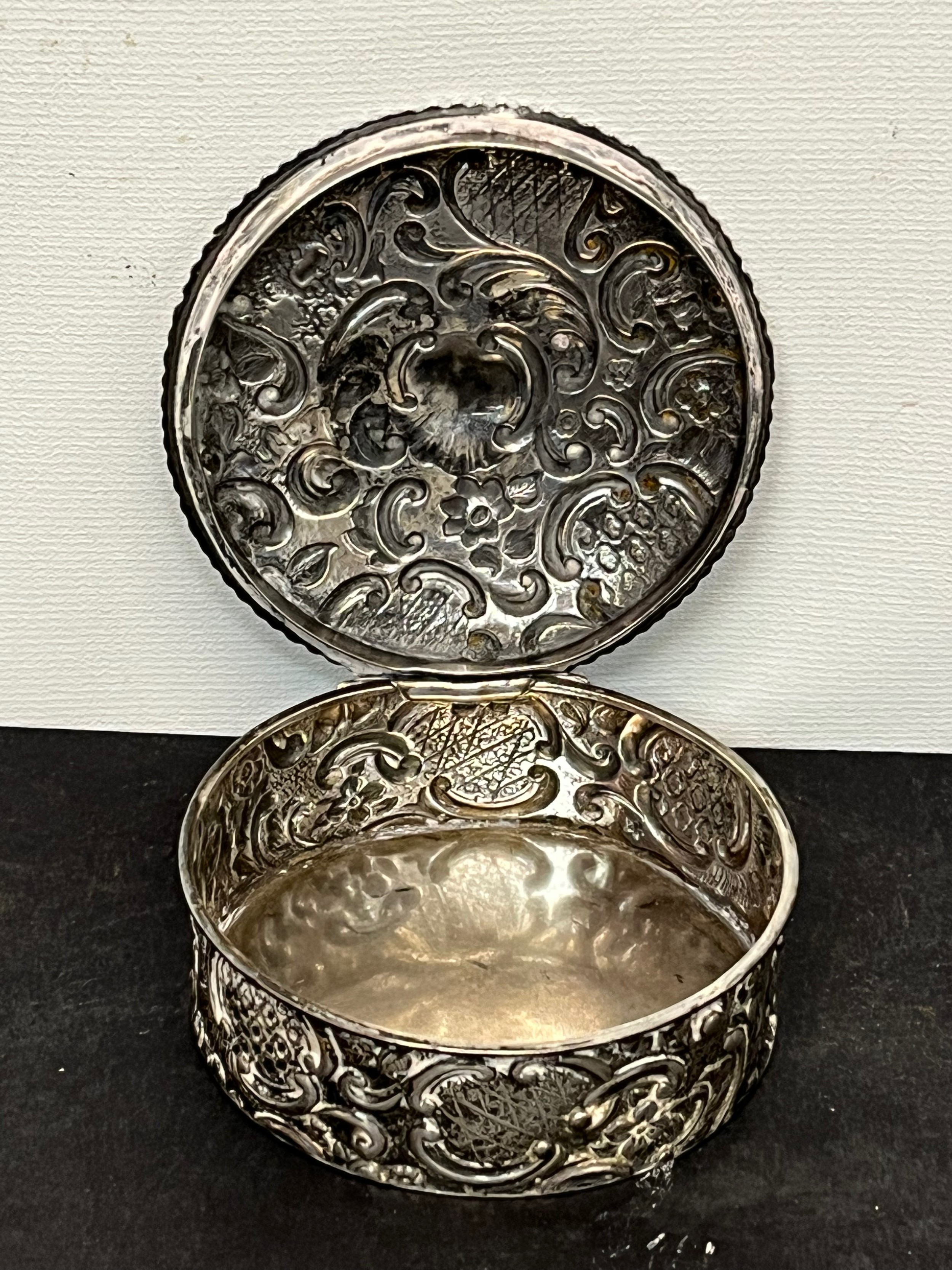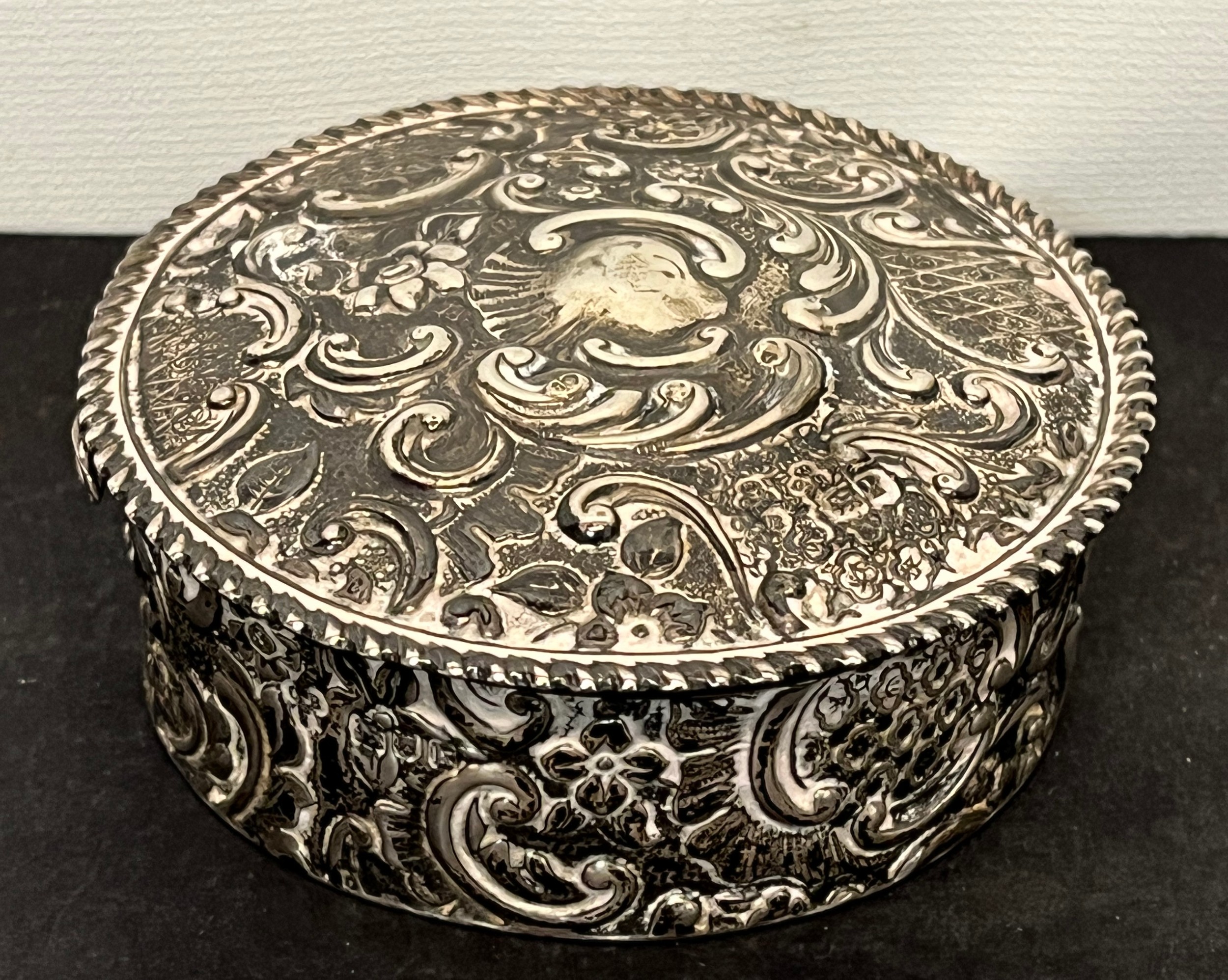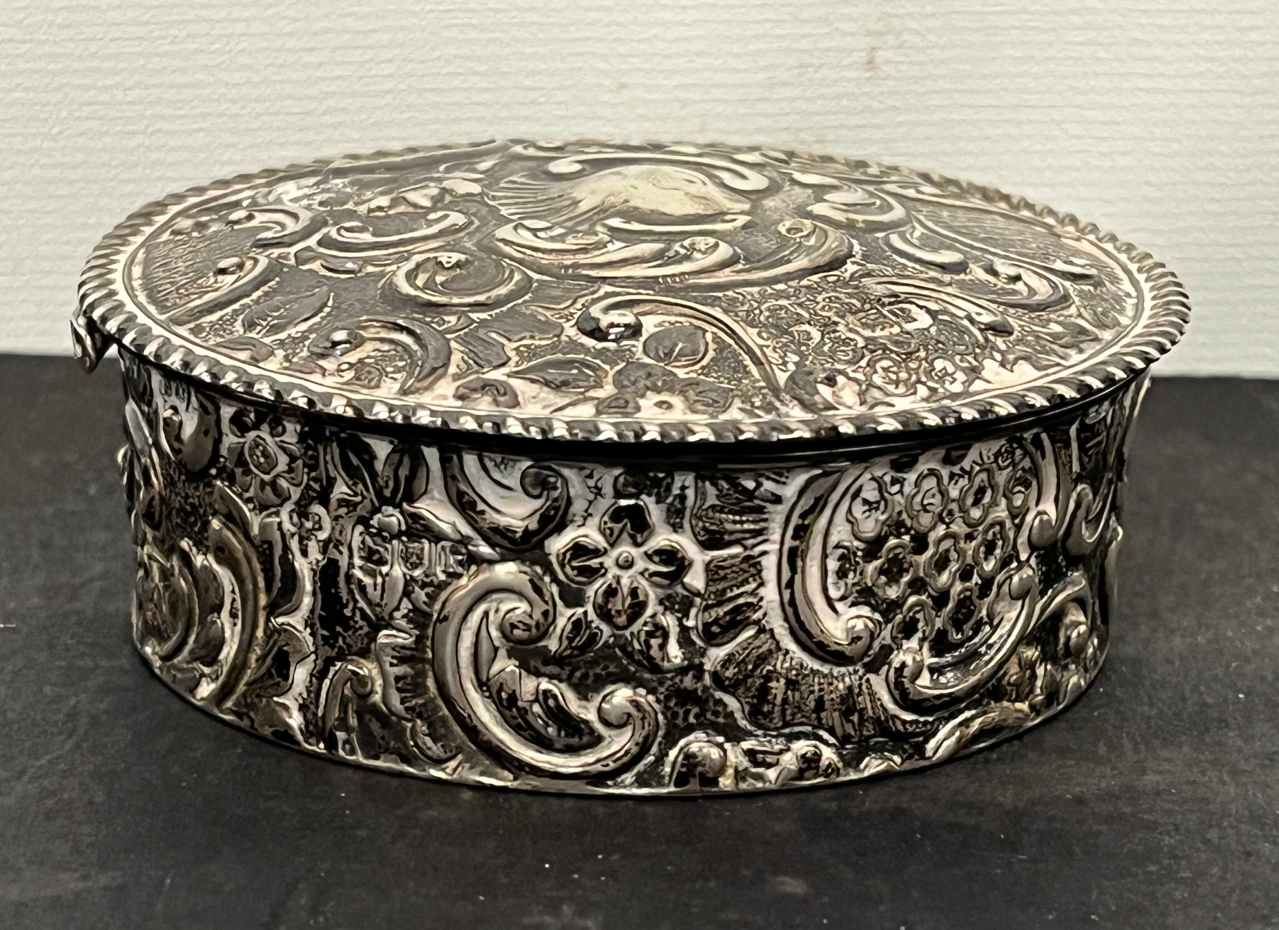 Hallmarked Edwardian silver trinket box with embossed decoration.This lot is available for in-house shipping