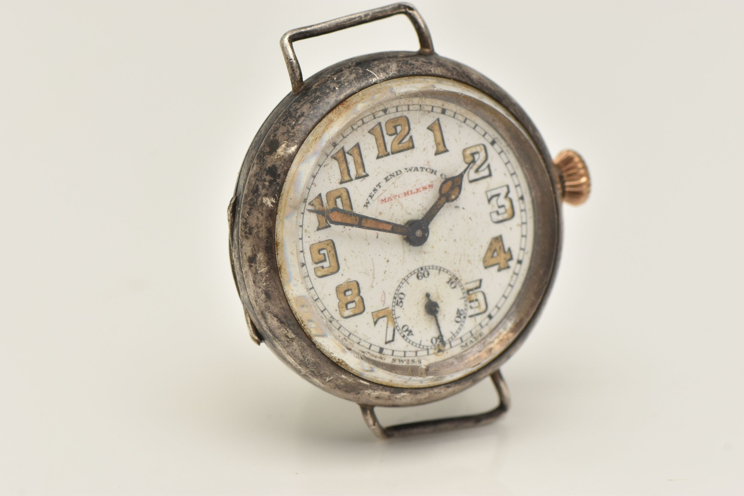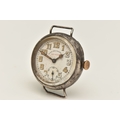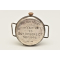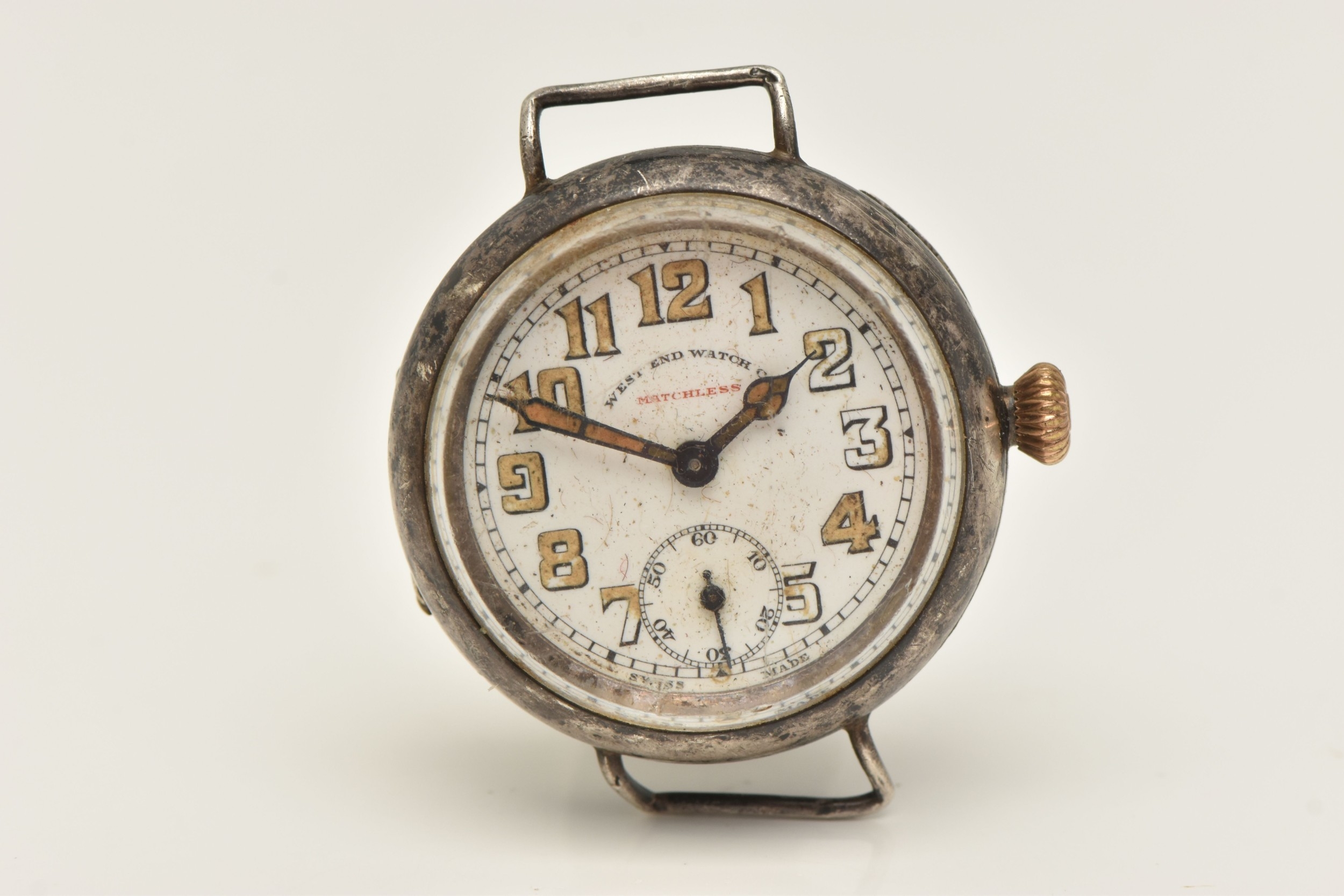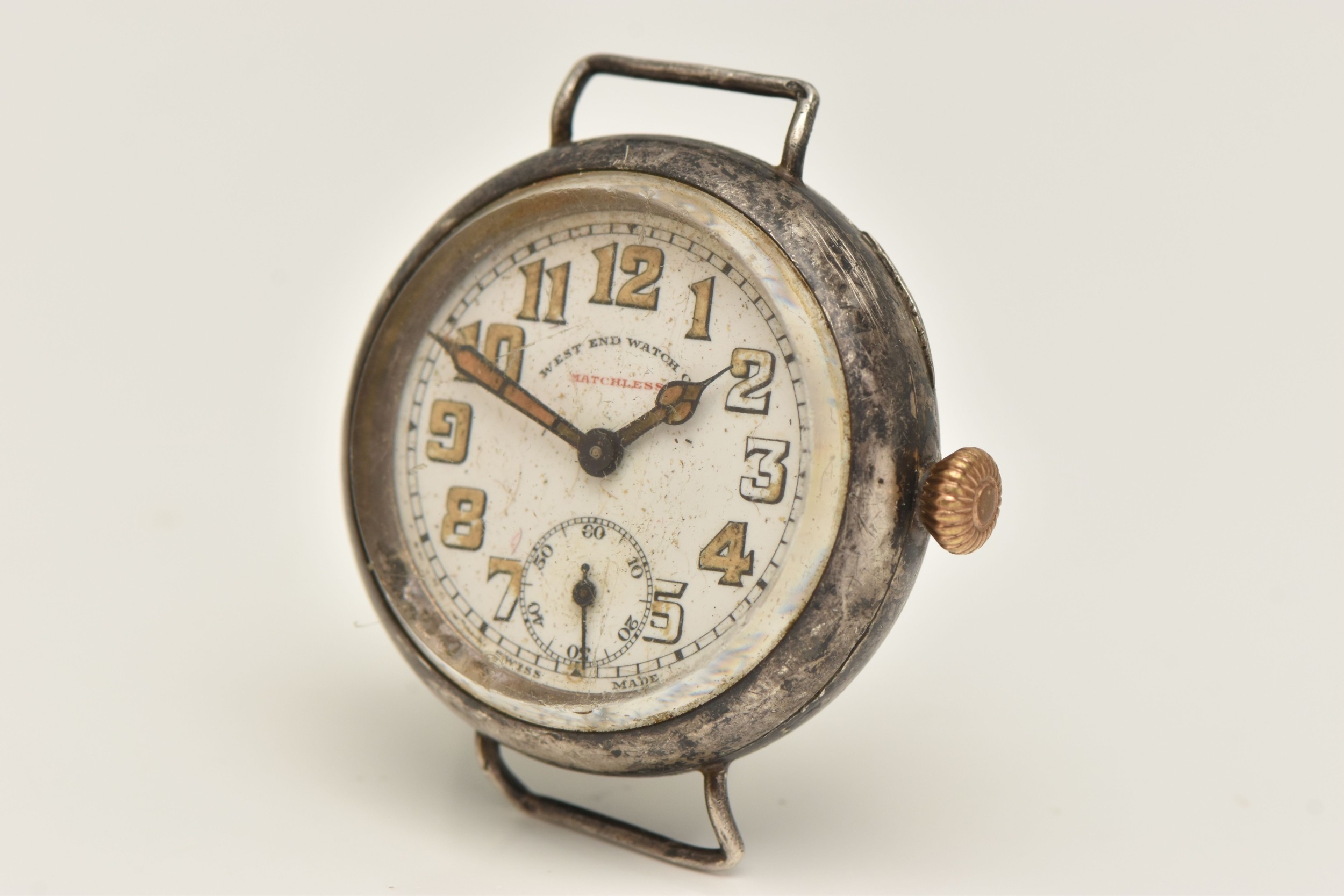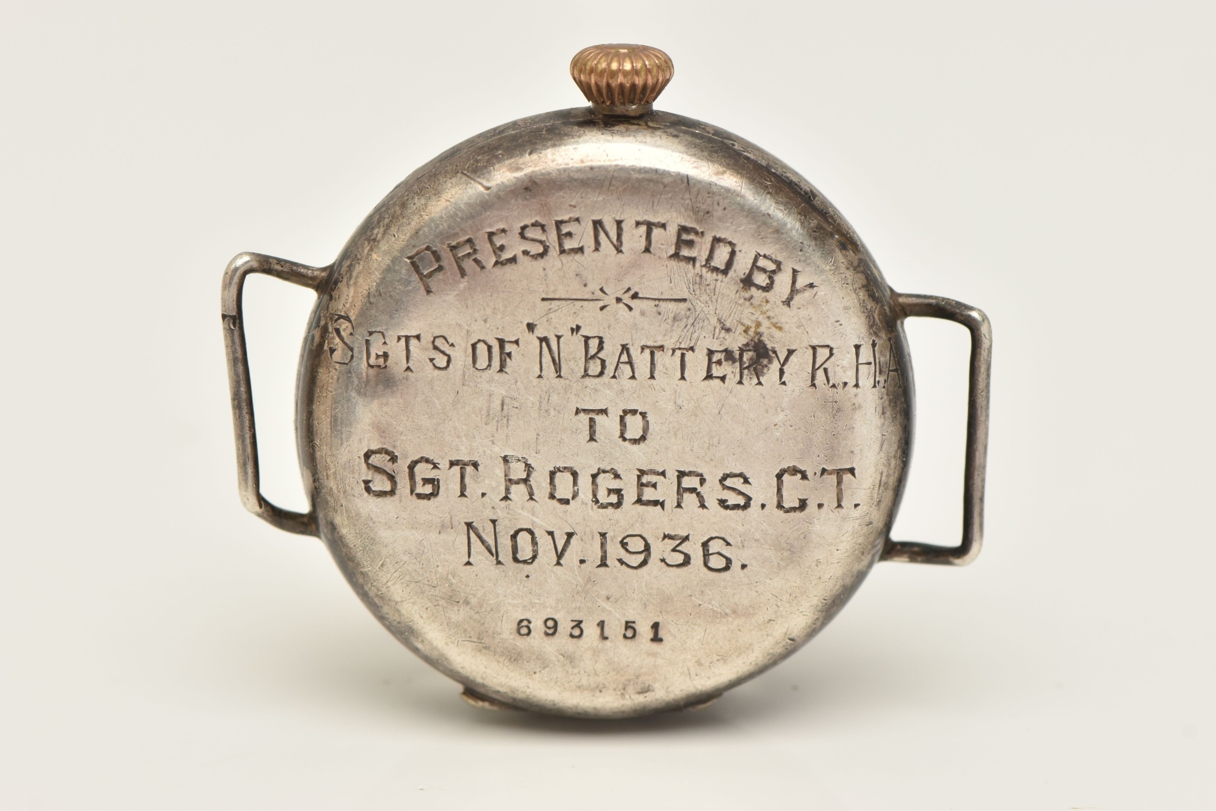 A 'WEST END WATCH CO' TRENCH WATCH HEAD, manual wind, worn luminescent Arabic numerals and hands, subsidiary dial at the six o'clock position, within a white metal case, engraved to the case back reads 'Presented By Sgts of N Battery R.H to Sgt Rogers C.T Nov. 1936', numbered 693151, approximate case width 34.0mm, inside case back stamped 0.900 Swiss control marks, approximate gross weight 34.8 grams (condition report: watch winds, sets and runs at time of cataloguing, although time keeping has not been tested, we cannot guarantee the working order of any watch)
