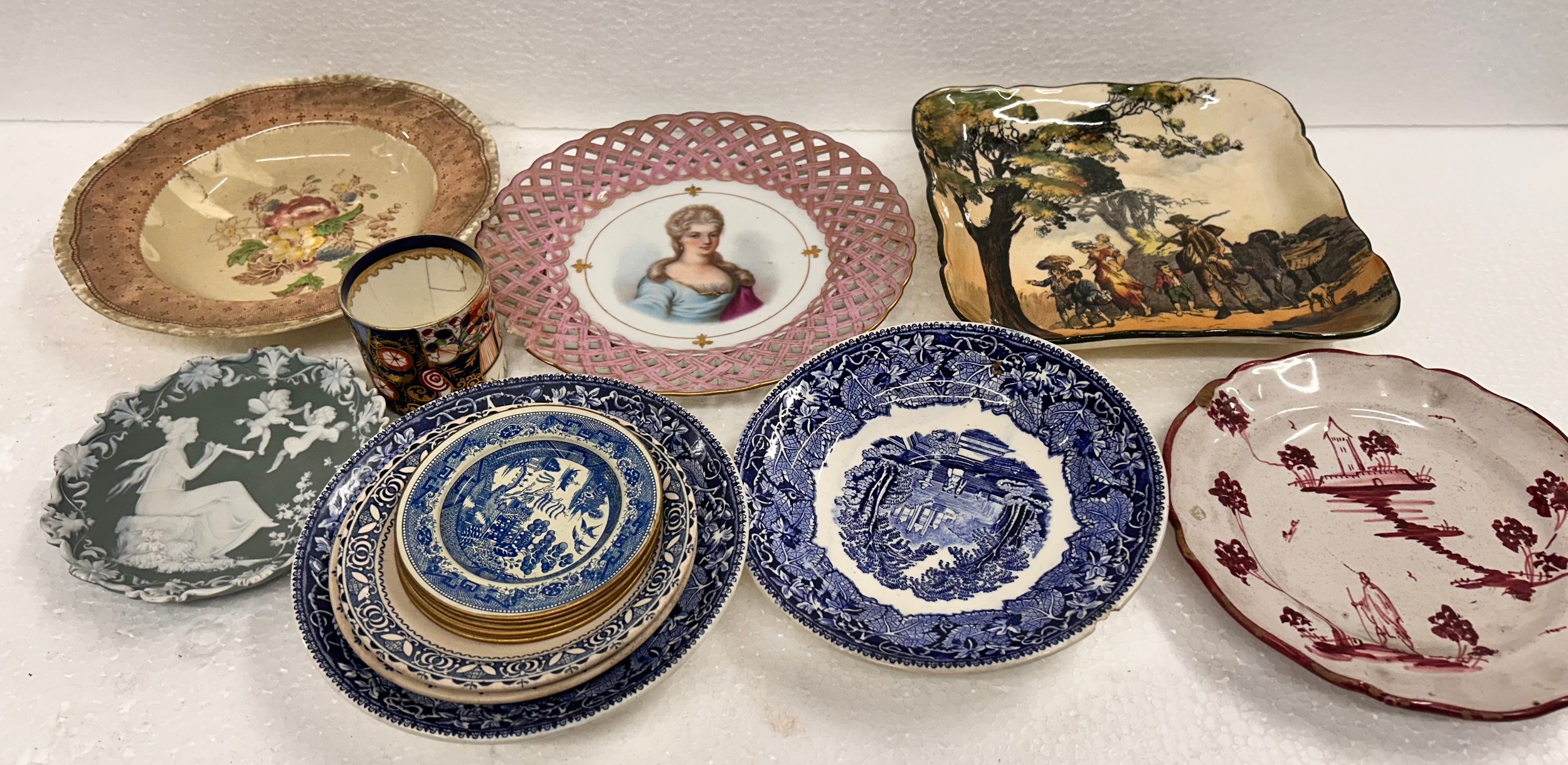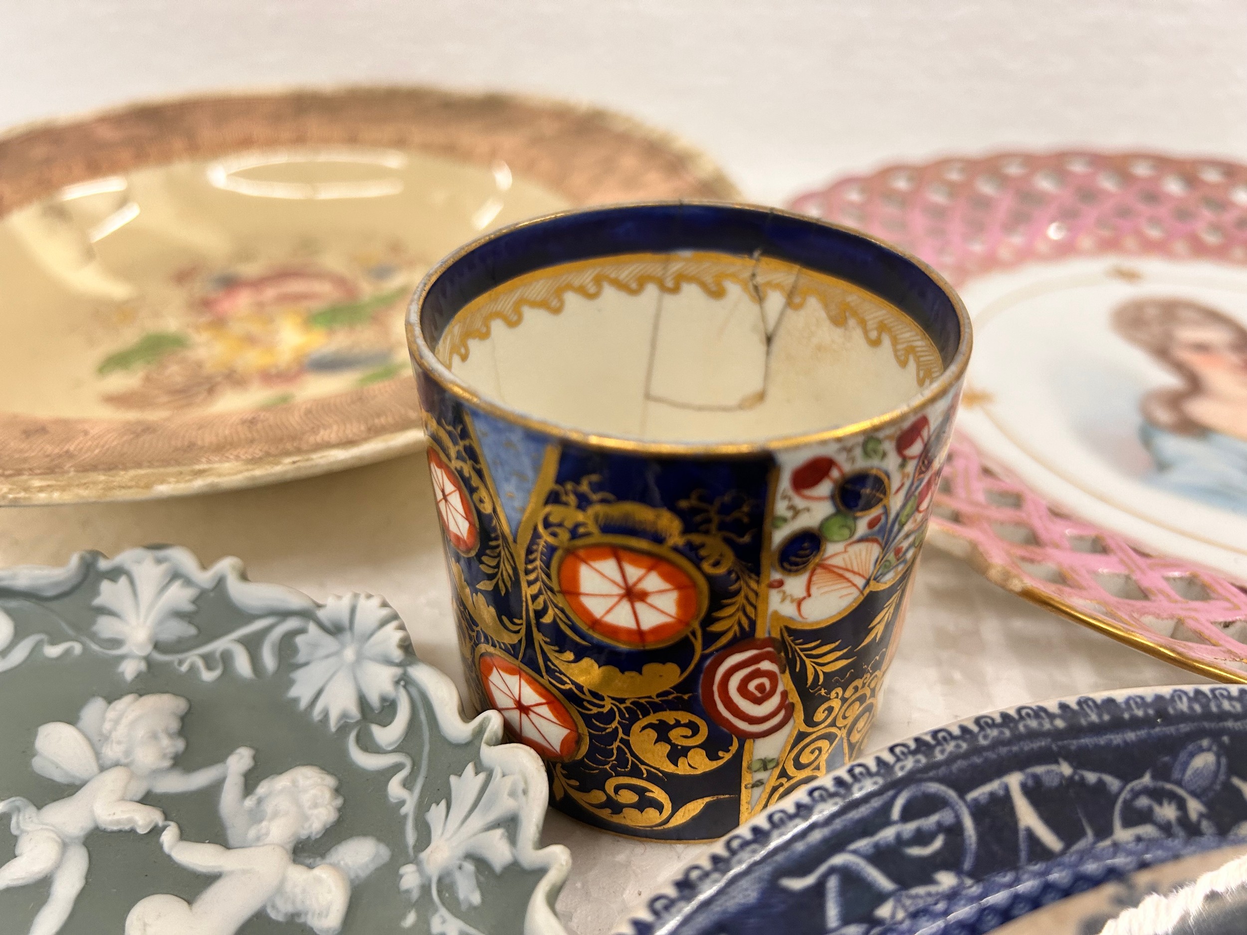 A collection of 19th century and later plates to include a Royal Doulton The Gypsies plate, a Sevres pierced plate (a/f) and an early 19th century Crown Derby cup (a/f), with other examples