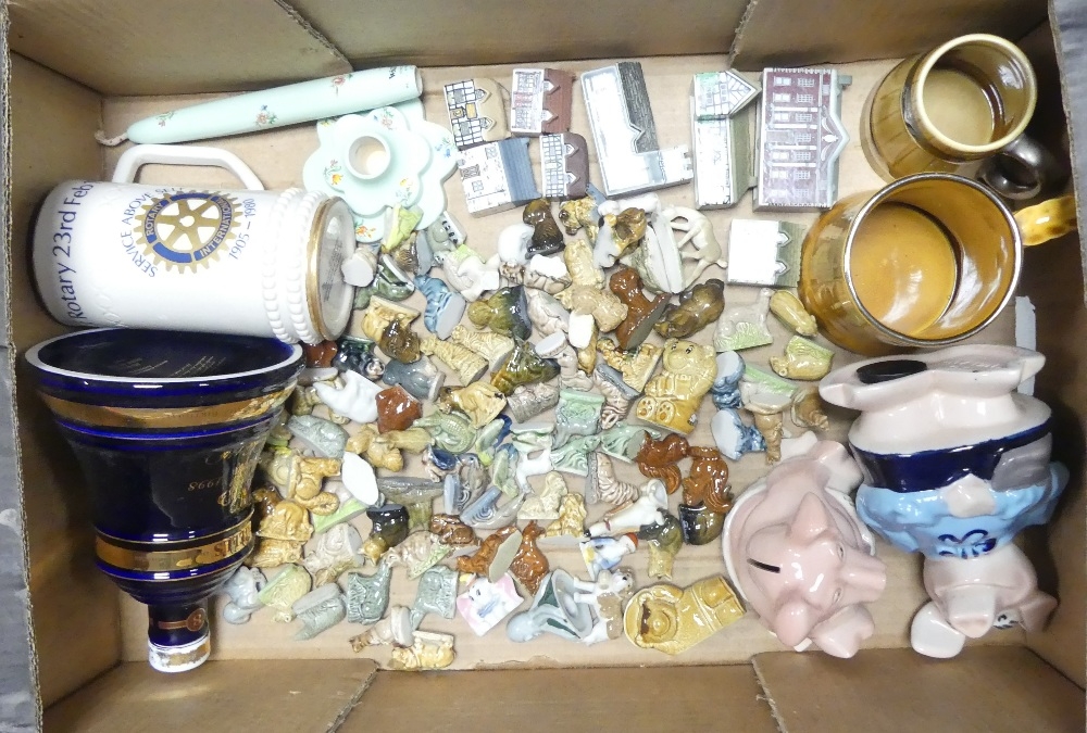 A collection of Wade to include tankards, Natwest Piggy Bank, candle and holder, miniature cottages and large collection of Whimsies. (1 Tray)