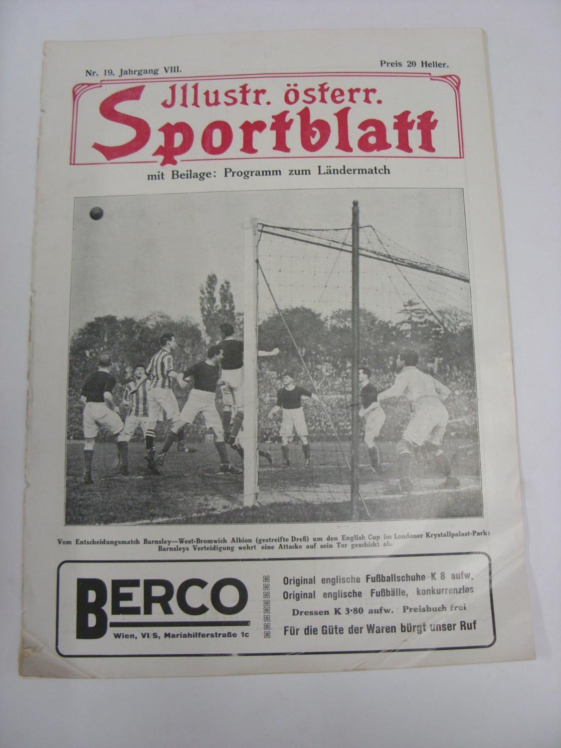 AUSTRIA, 1912, an official football programme from the game versus Hungary, played on 04/05/1912, published within the 'Illustr Osterr Sport Blatt' Magazine, ex bound volume, split spine, includes pictures and reports of the 1912 FA Cup Final, Barnsley v West Bromwich Albion game played at the Crystal Palace (including front page picture). Estimate: £100/£120 - Opening Bid: £90