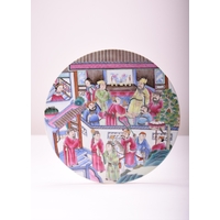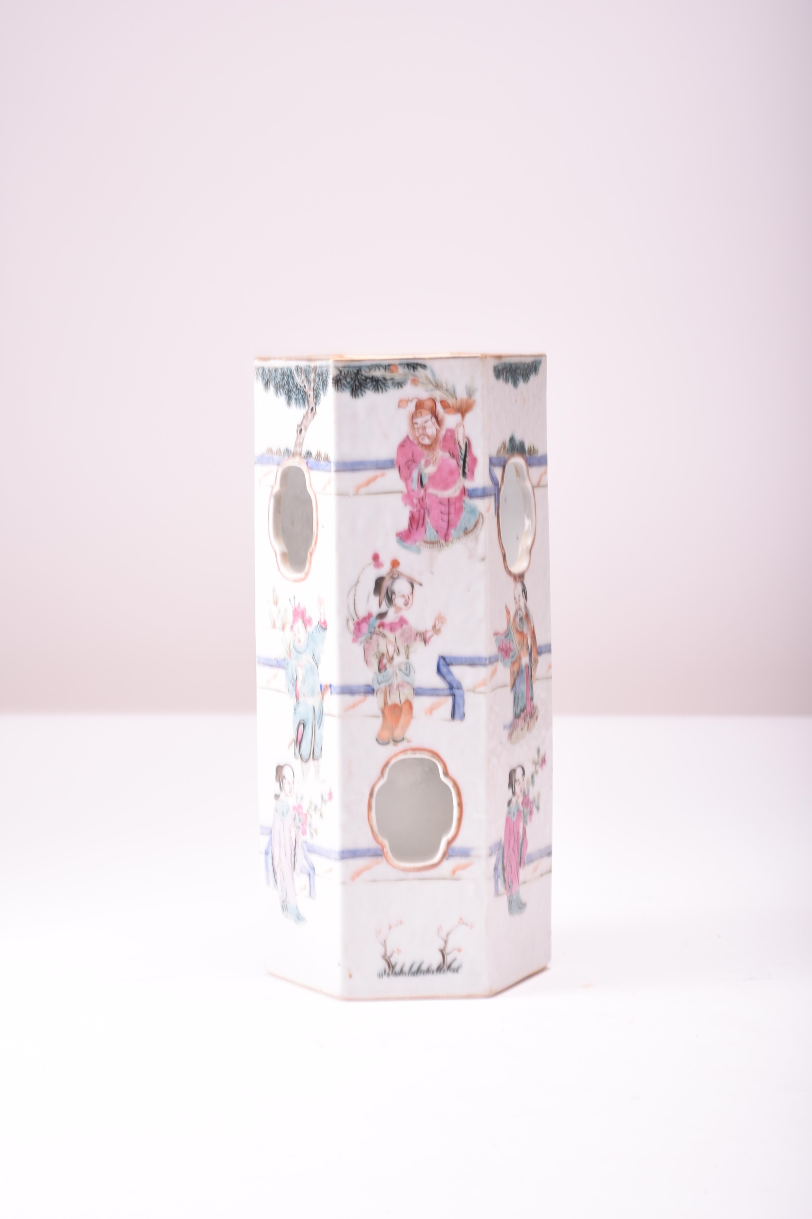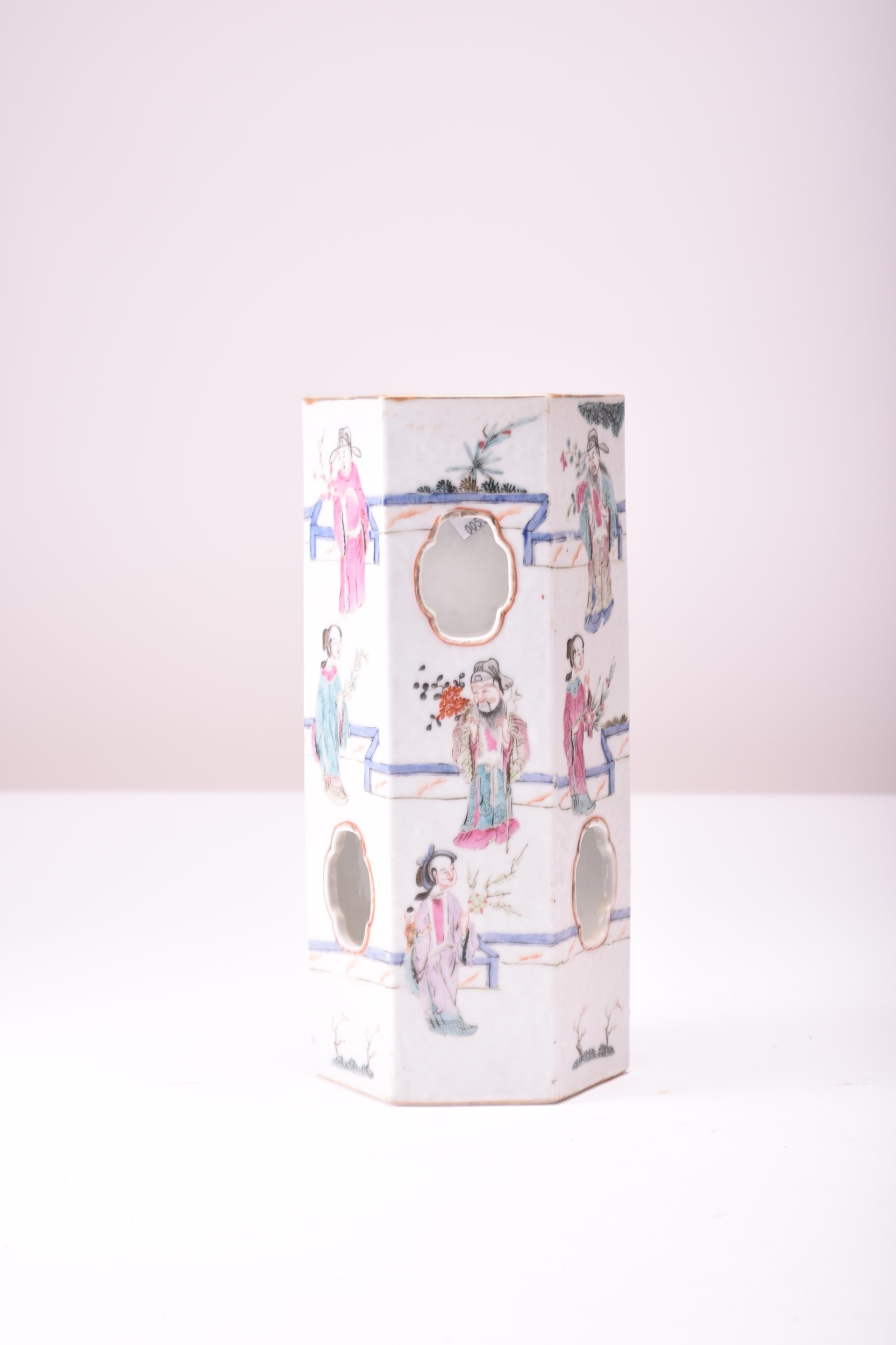 A Chinese famille rose wig stand, 19th century Of hexagonal section and decorated with noble figures at leisure. 28cm high