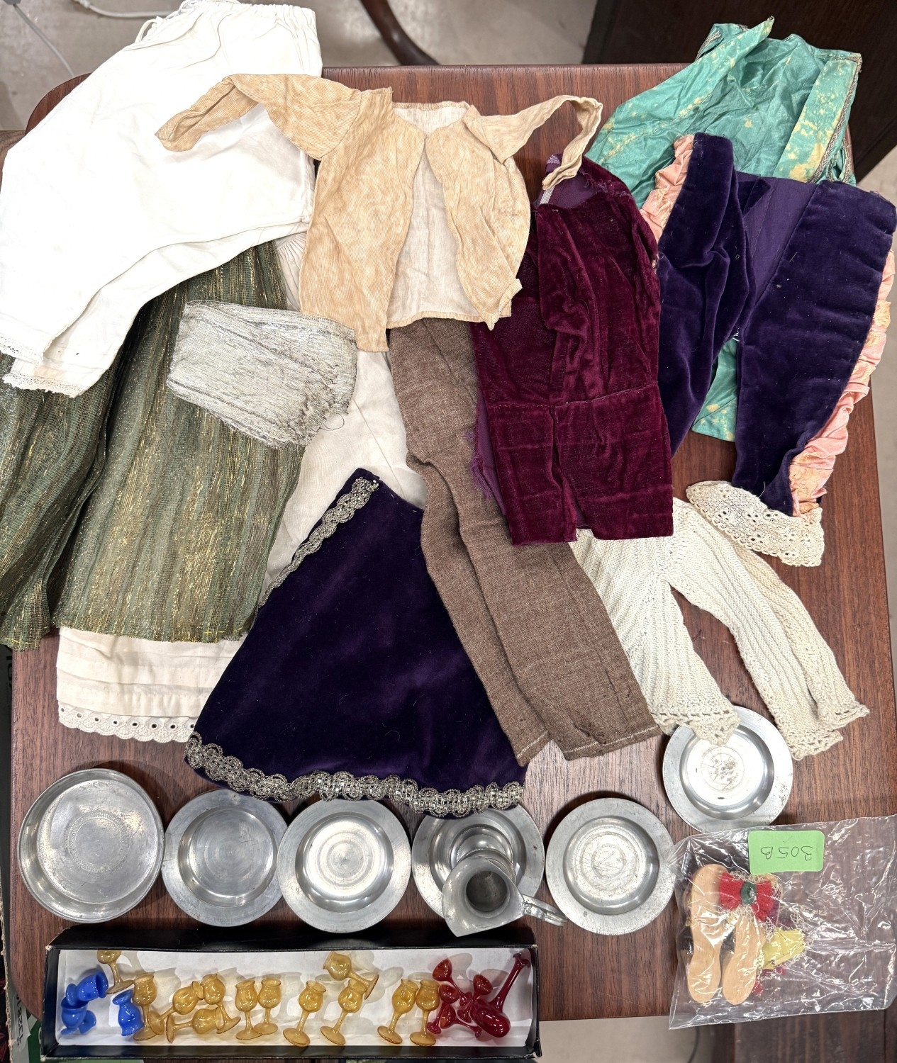A small collection of interesting doll's clothes and glass goblets