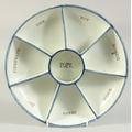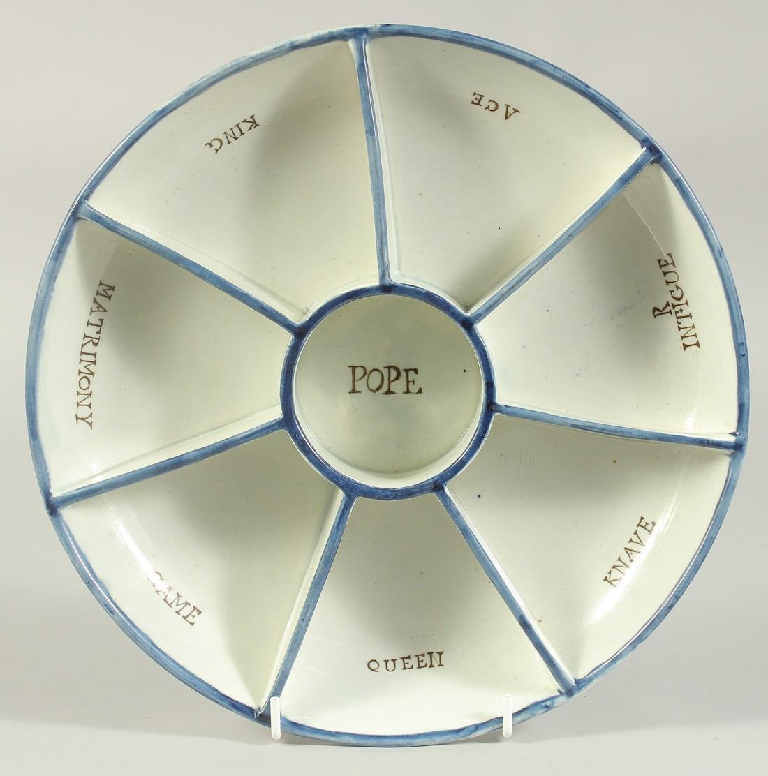 A RARE EARLY 19TH CENTURY PEARLWARE DISH SHAPED POPE JOHN GAMING DISH with centre segments, Pope and other segments, Matrimony, Game, Queen, Knave, Intrigue, Ace, King.