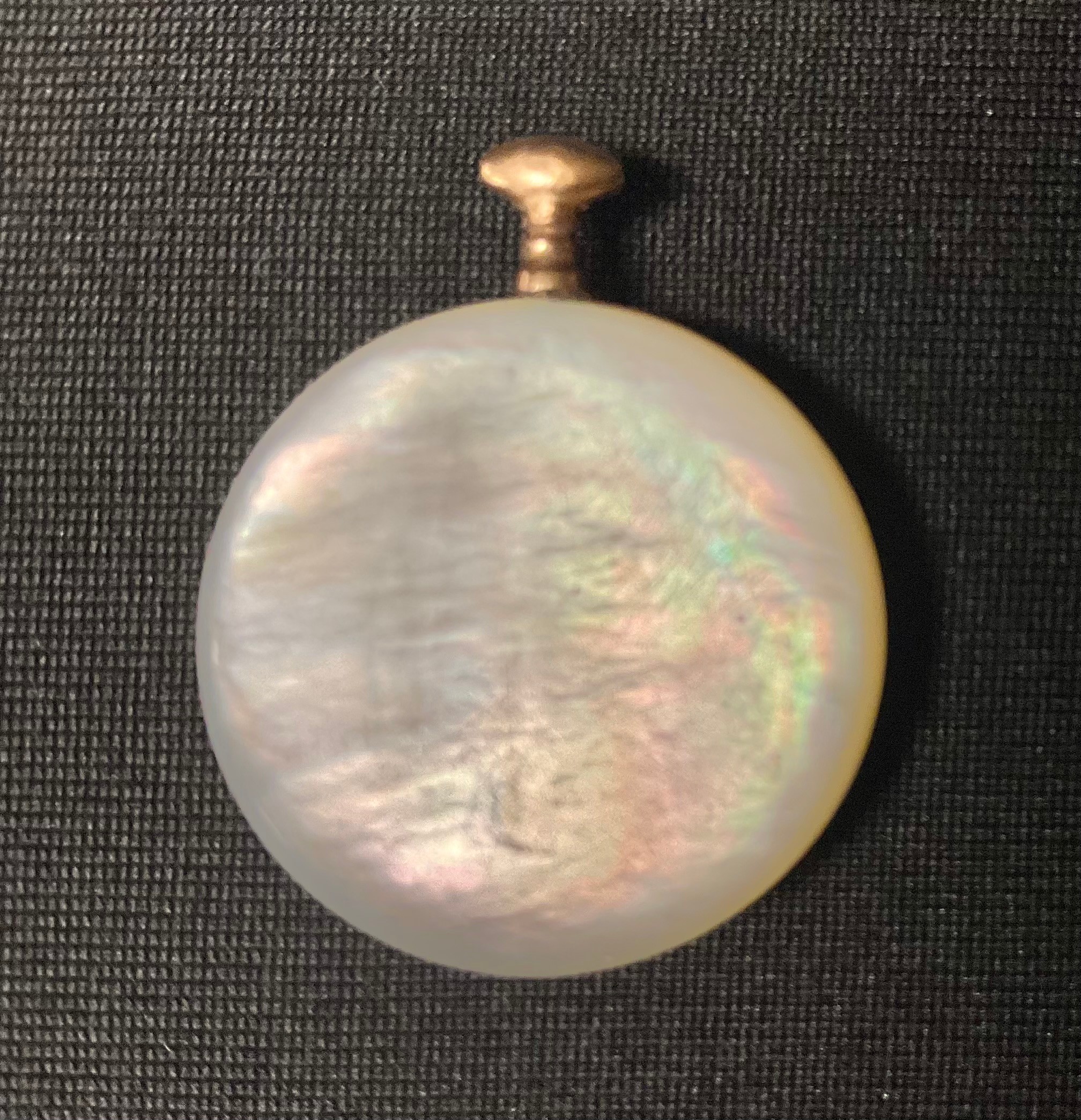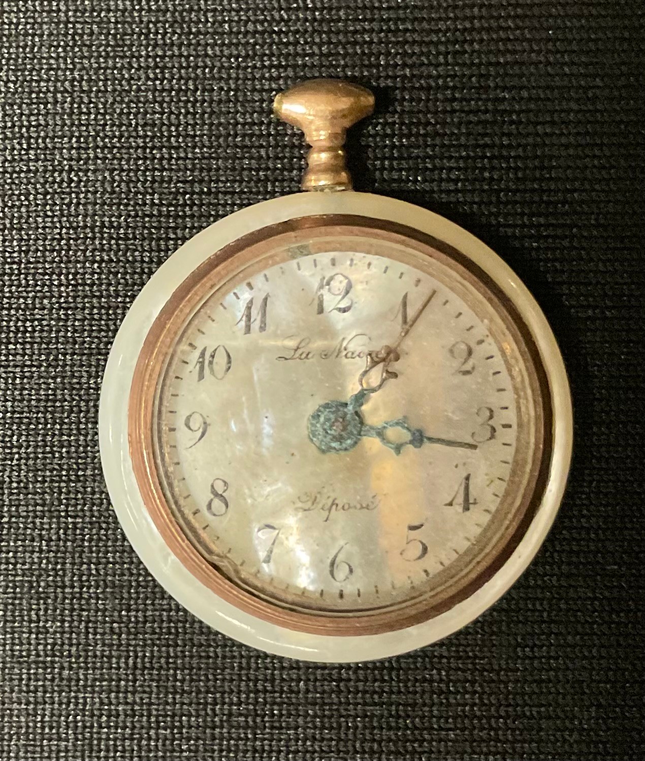 An early 20th century French gold coloured metal mounted mother of pearl miniature fob or pocket watch, the dial inscribed La Nacre, Depose, 3cm over loop