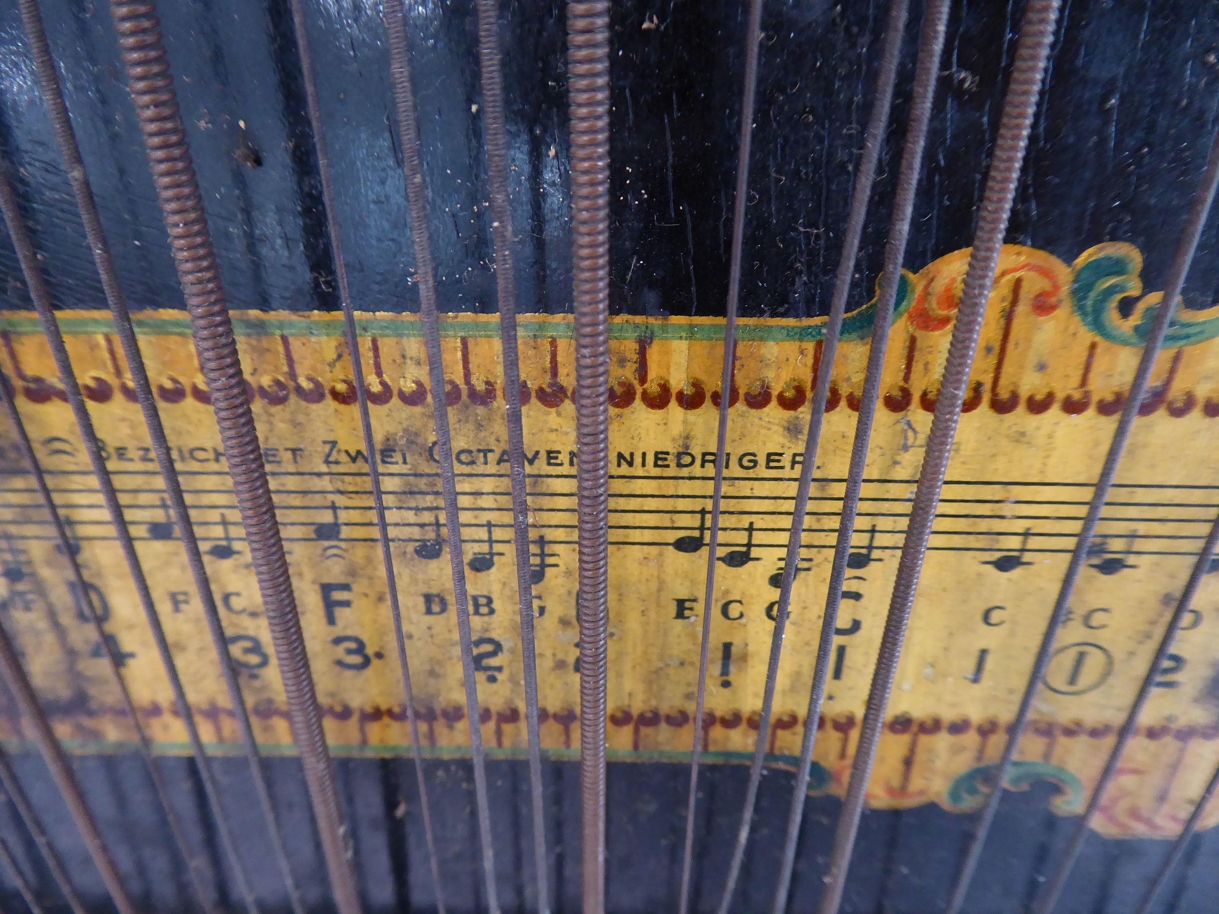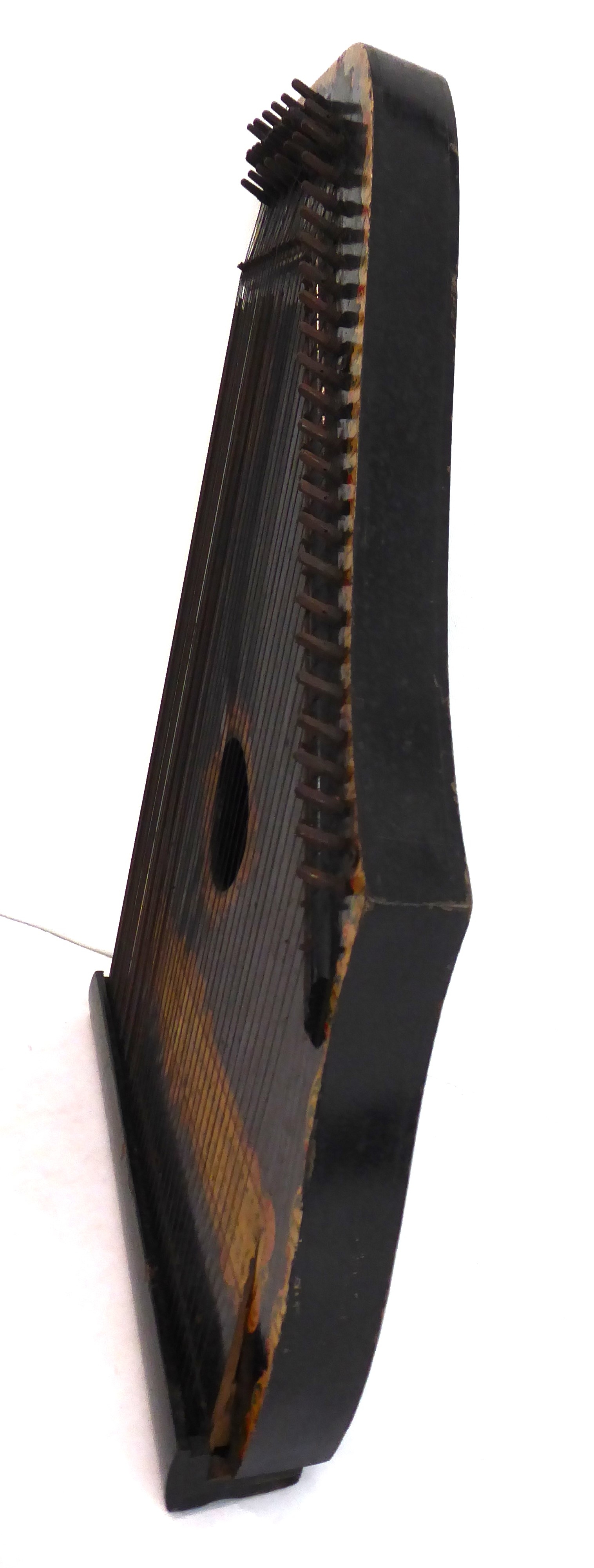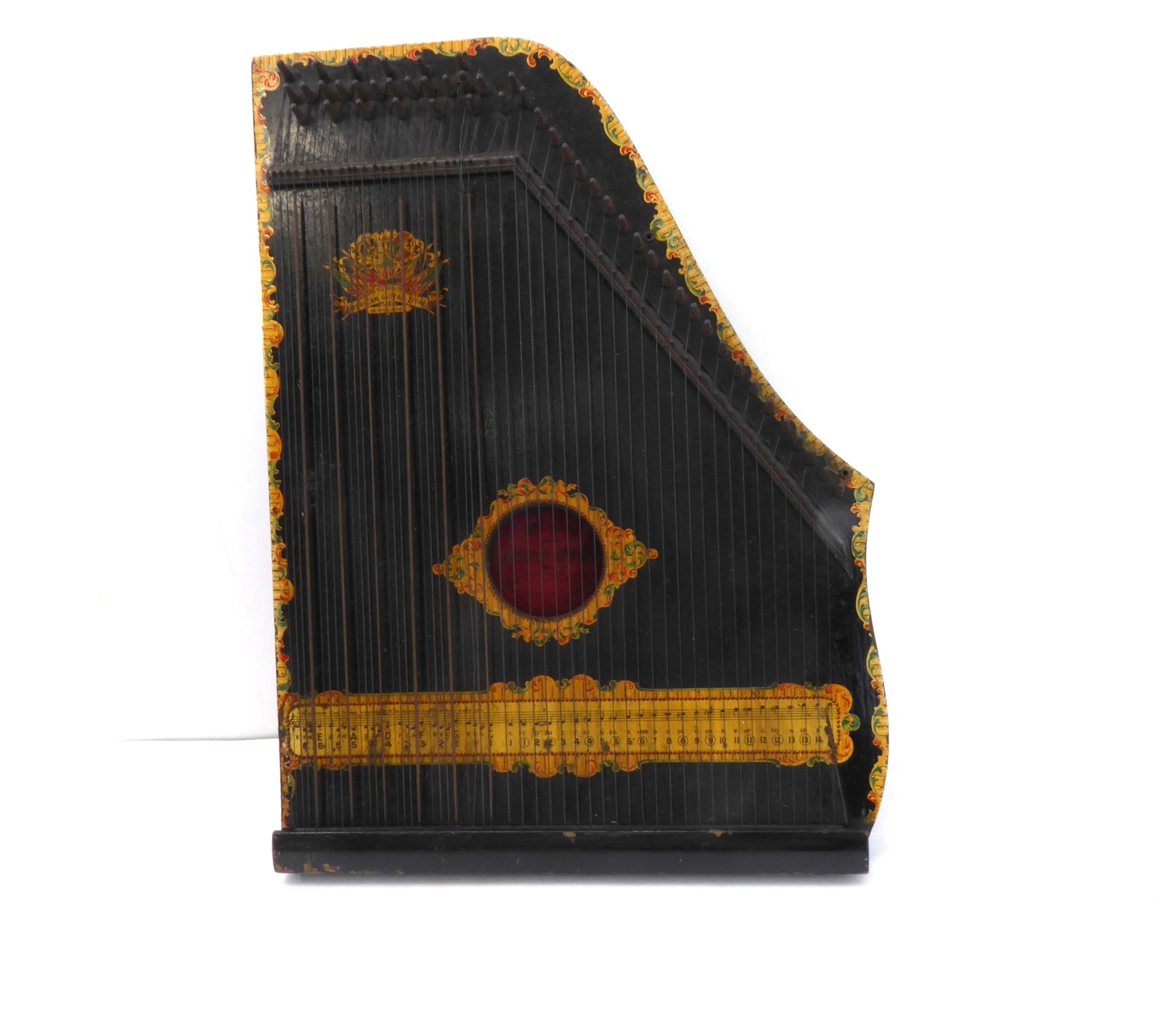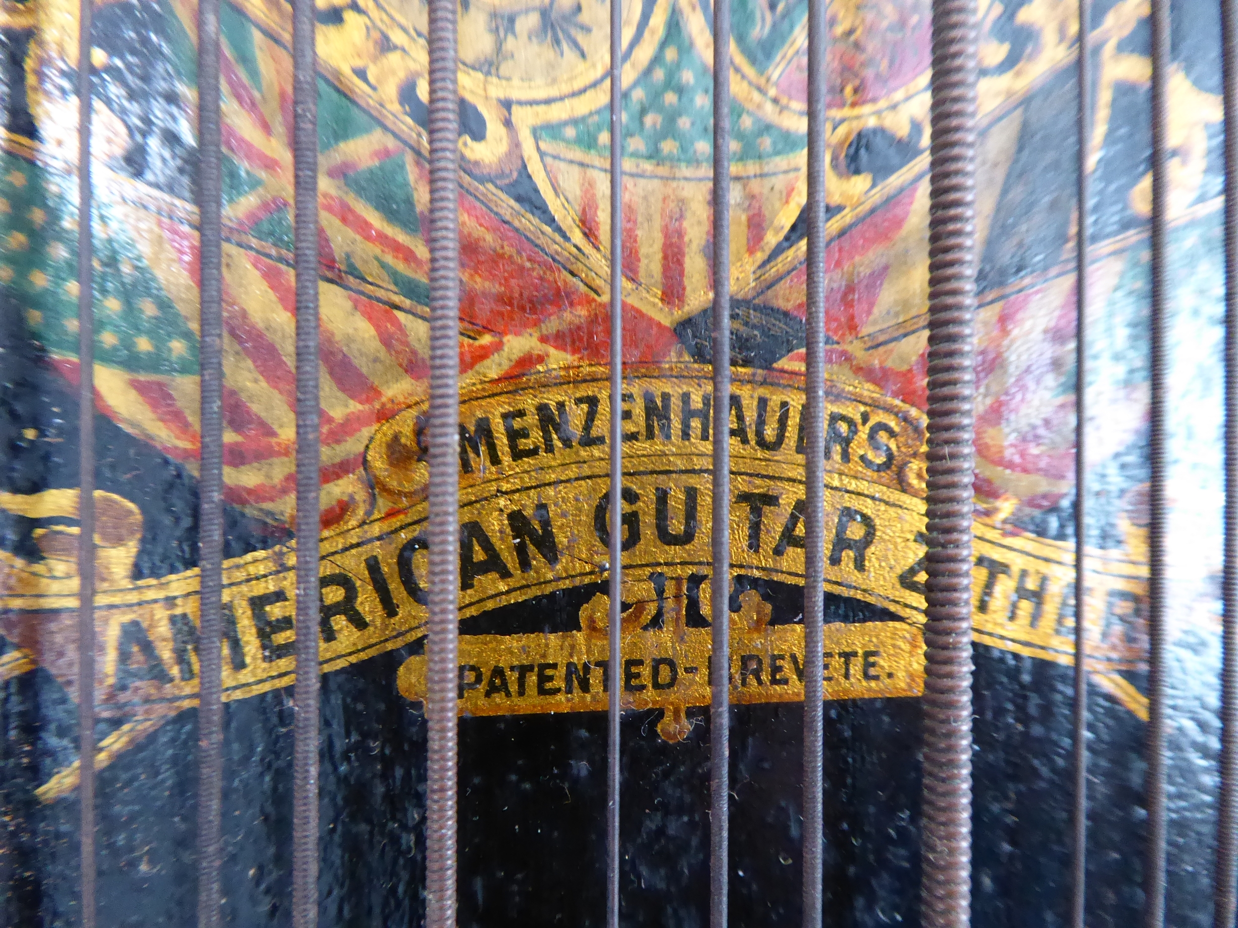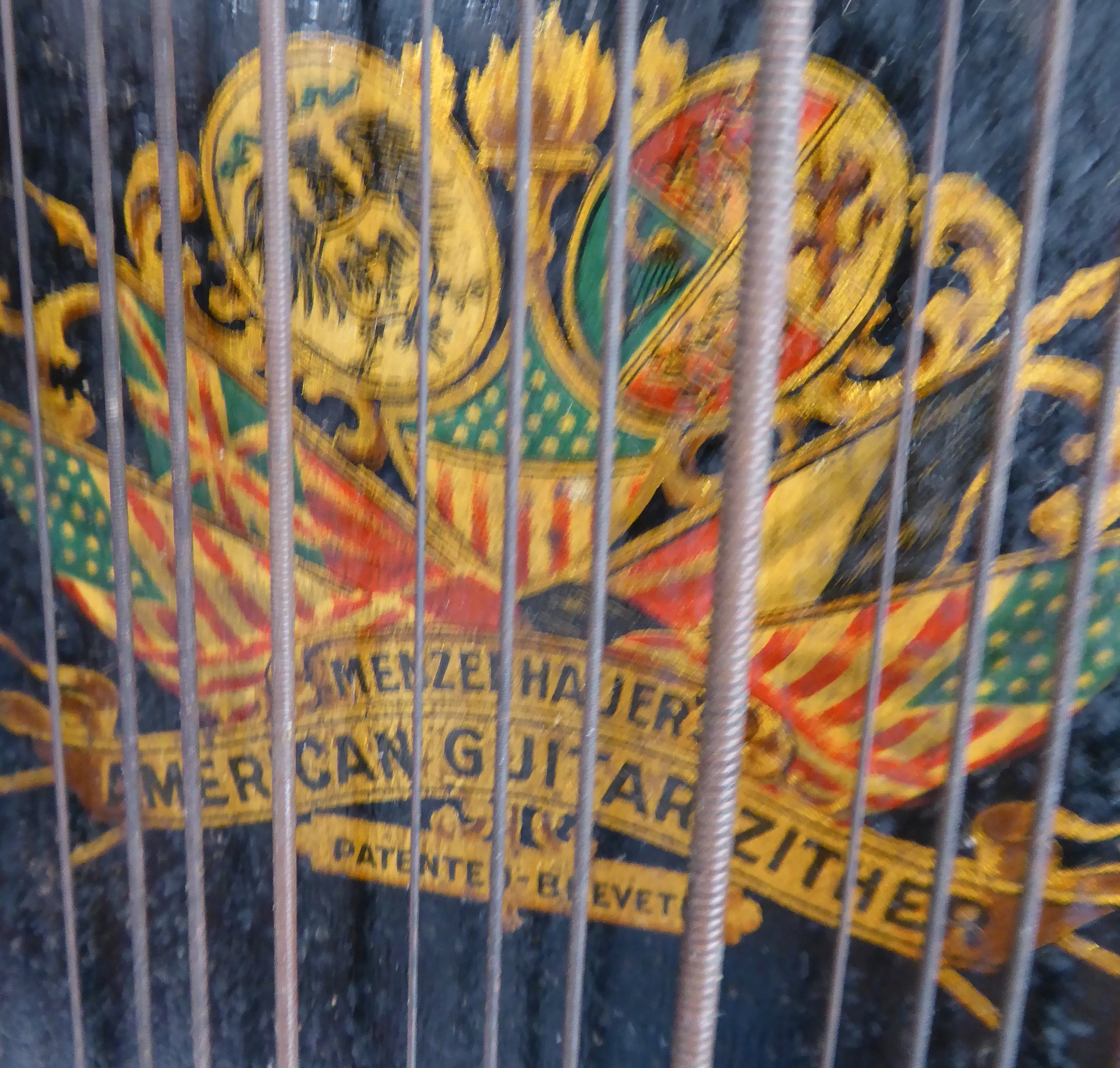 A circa 1900 century guitar zither marked 'Menzenhauer's American Guitar Zither - Patented - Brevete' (55 cm high x 41.5 cm wide)