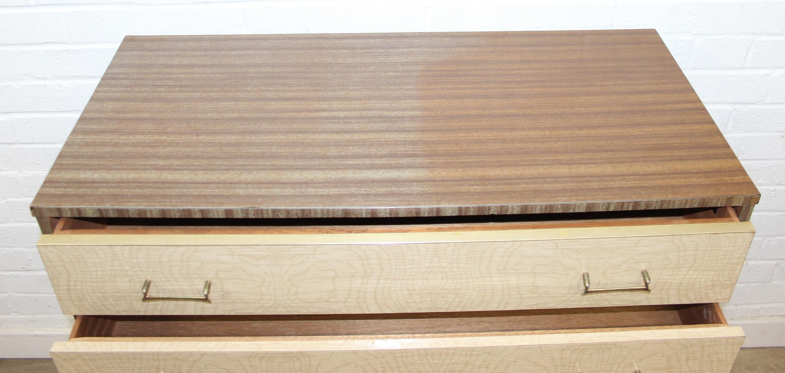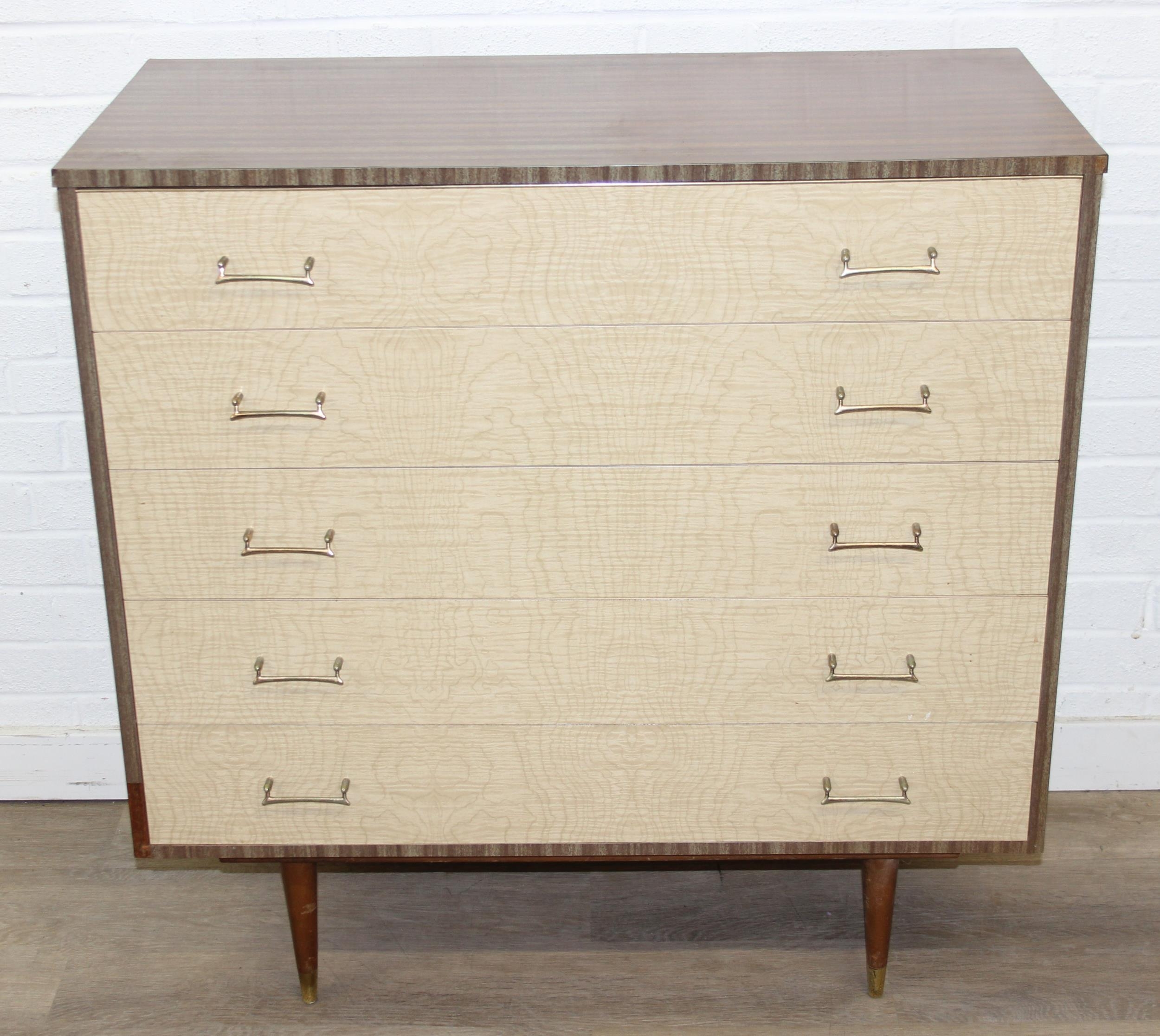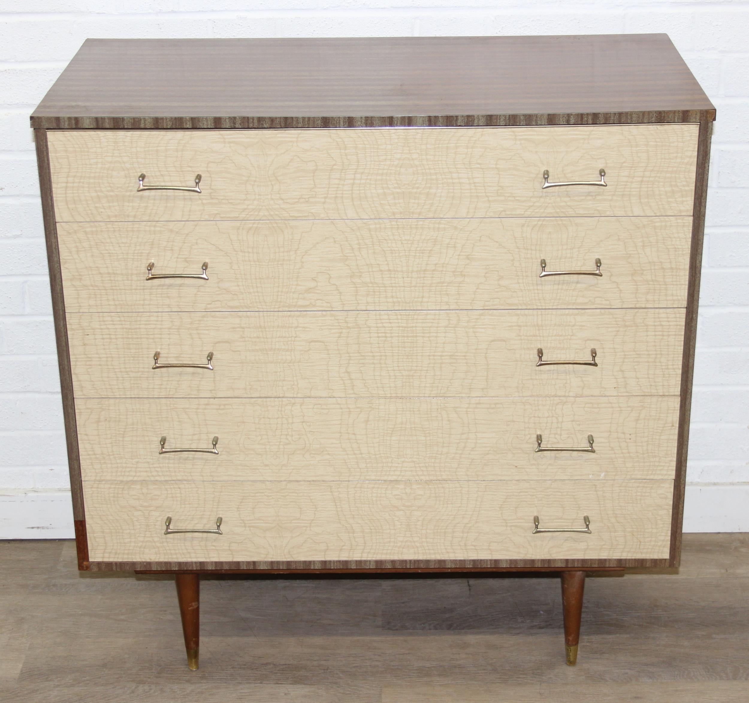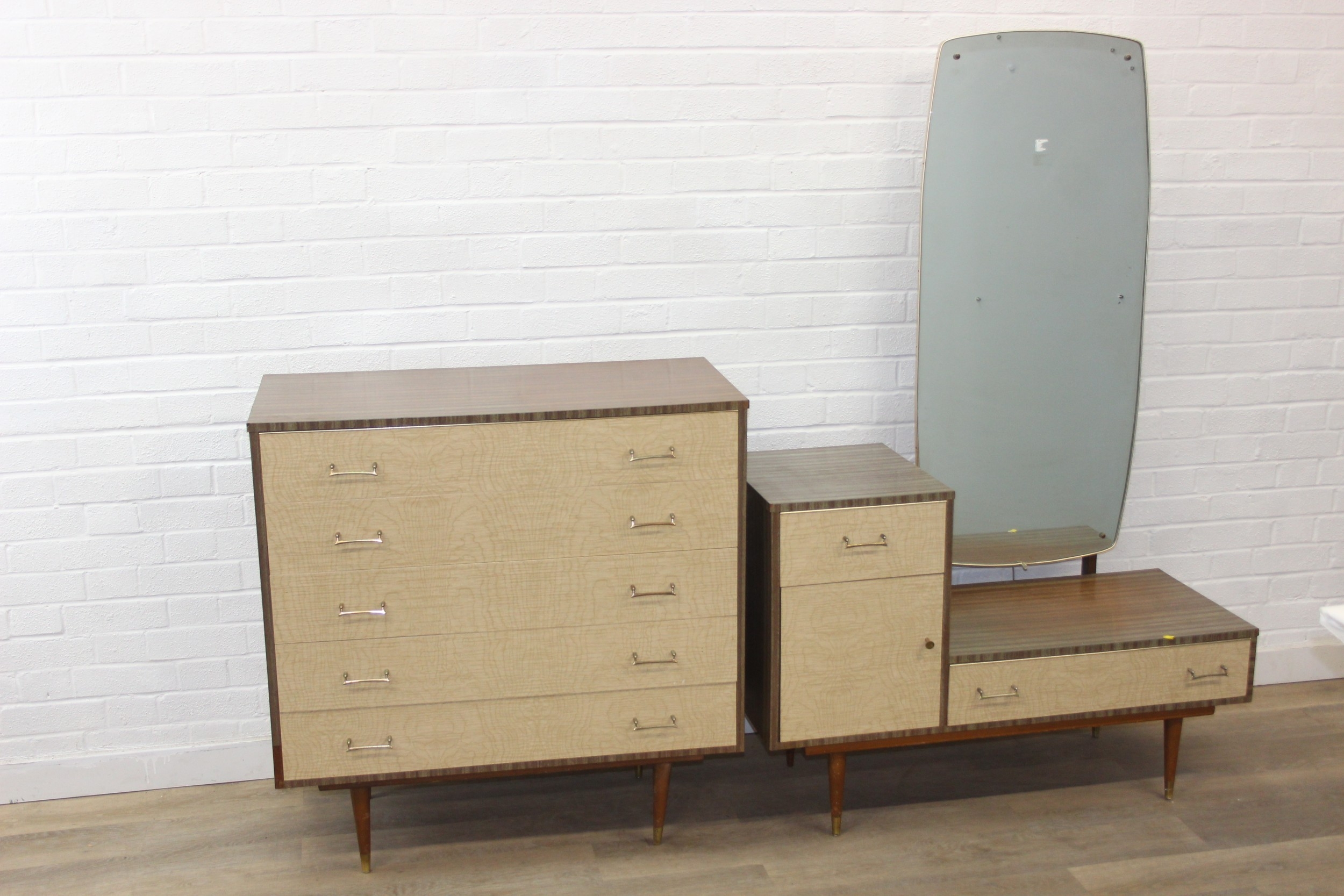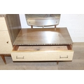 A retro 1950's five drawer chest of drawers and dressing table with two drawers and small cupboard to base by MelaFurn, faux wood effect with metal handles, dressing table 118cm x 50cm x 162cm [2]