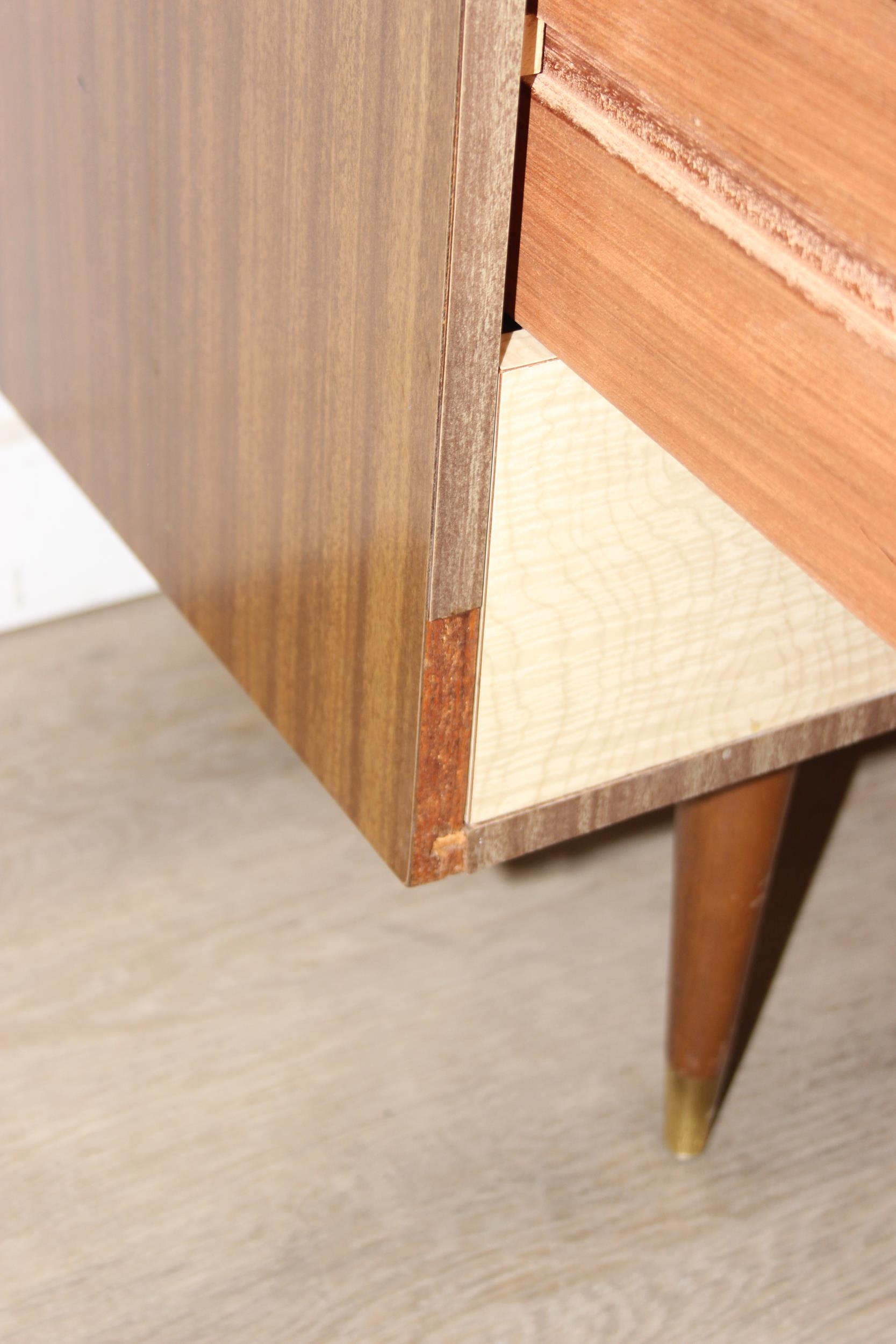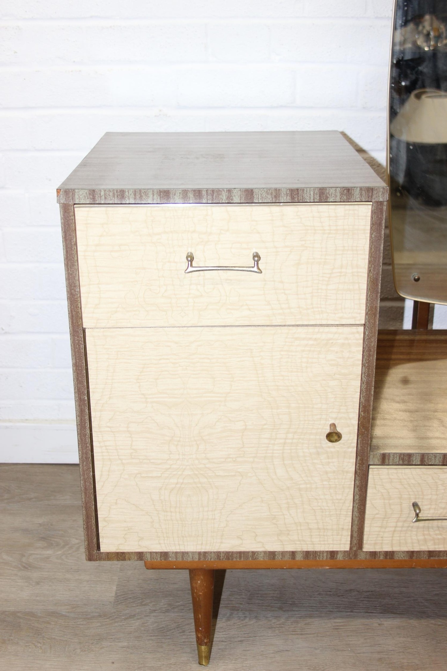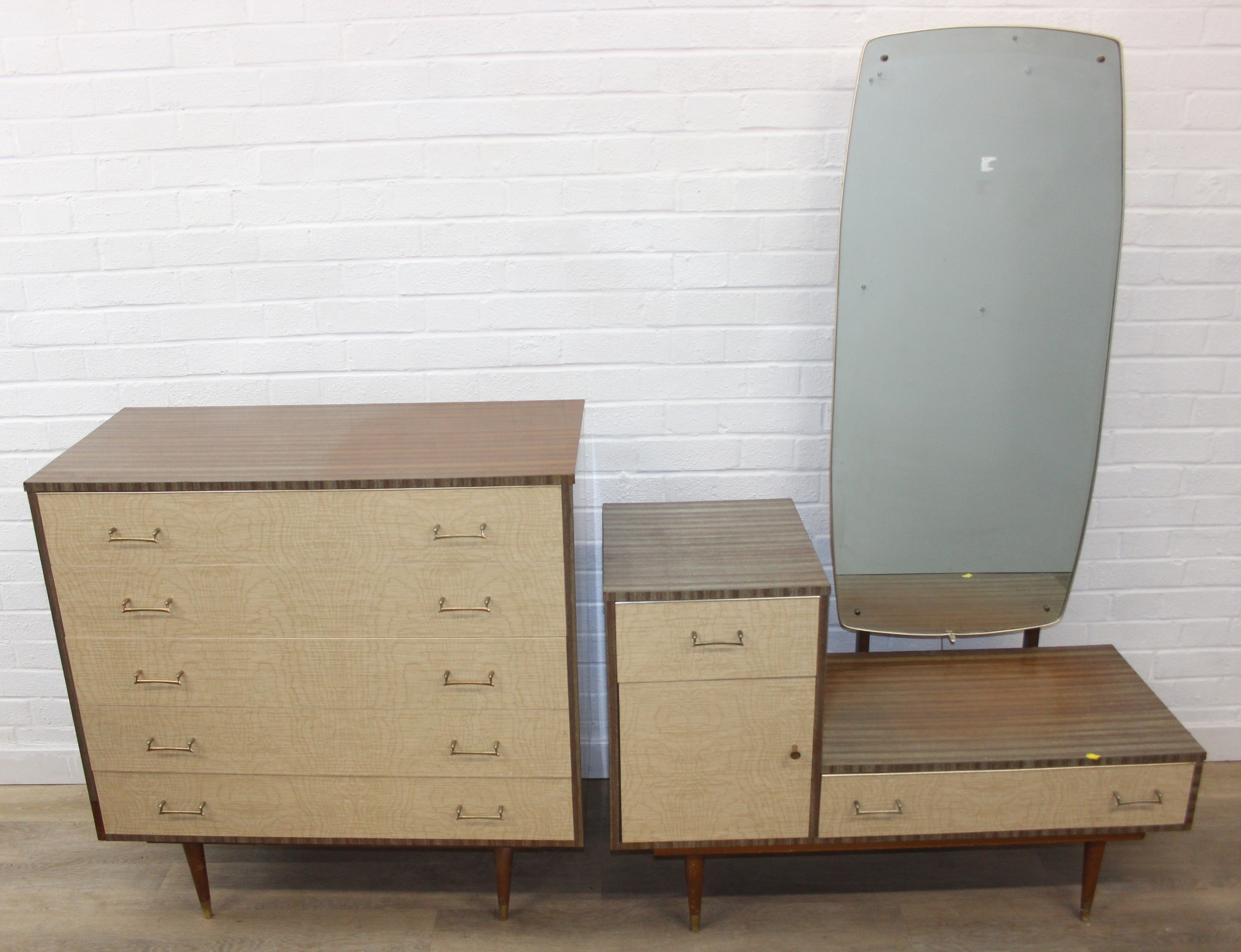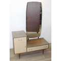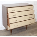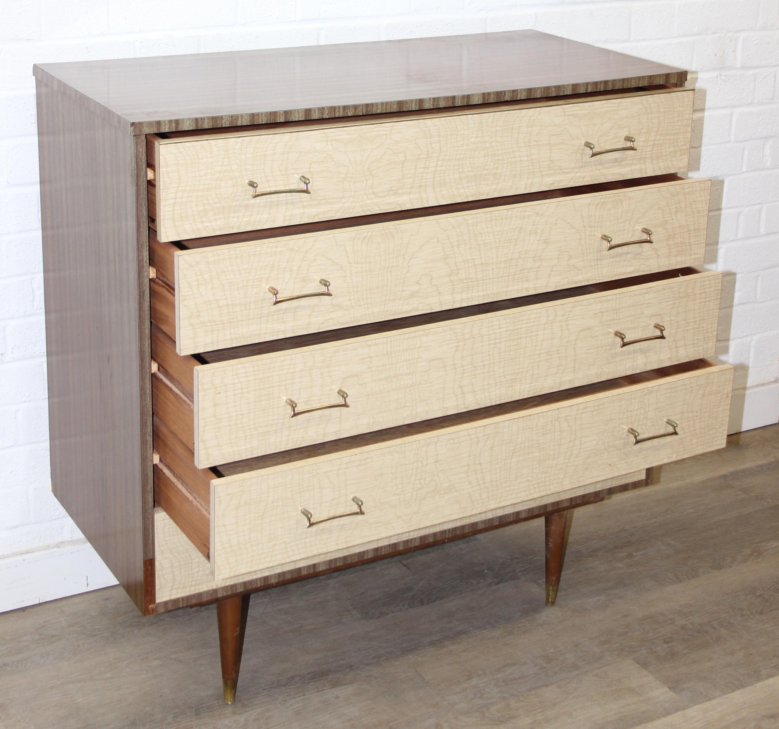 A retro 1950's five drawer chest of drawers and dressing table with two drawers and small cupboard to base by MelaFurn, faux wood effect with metal handles, dressing table 118cm x 50cm x 162cm [2]
