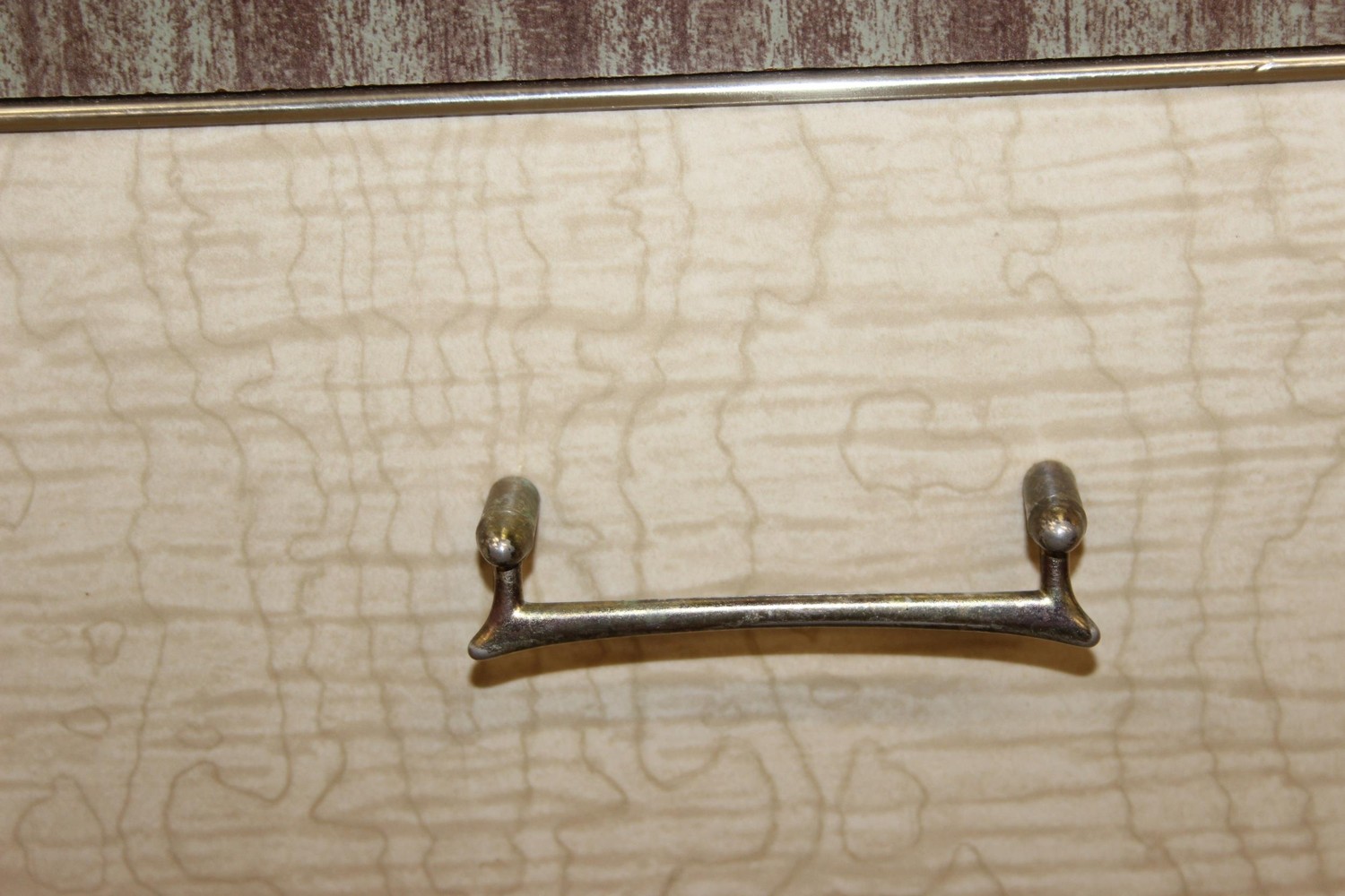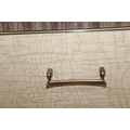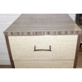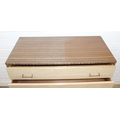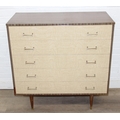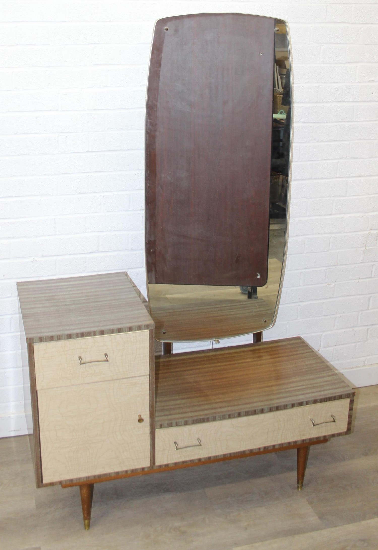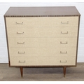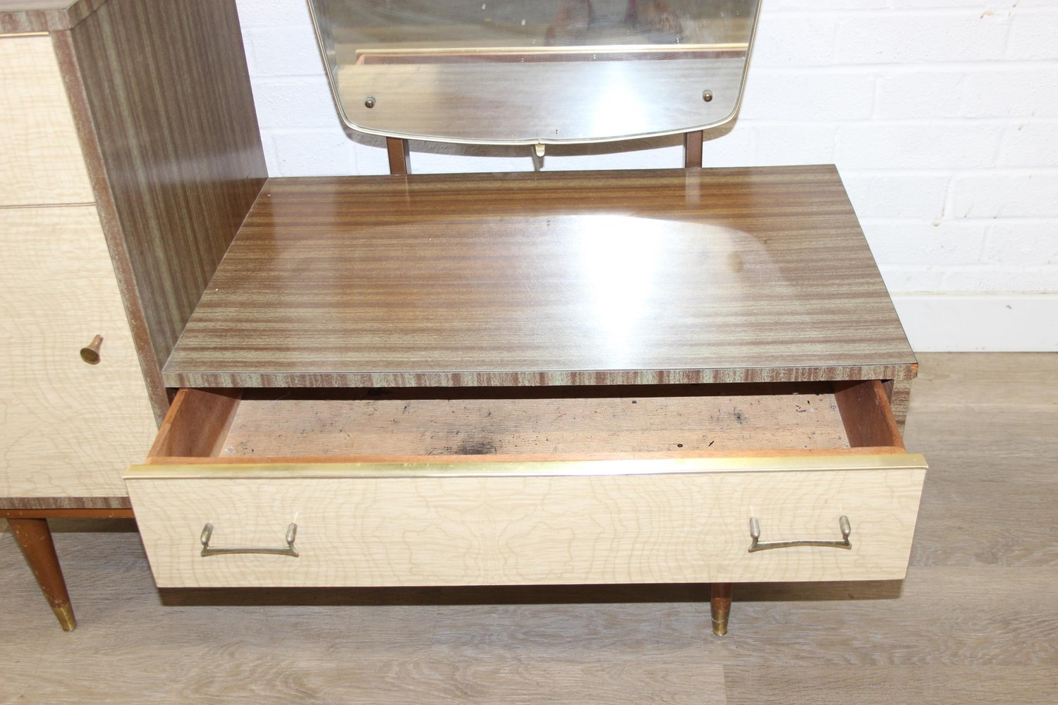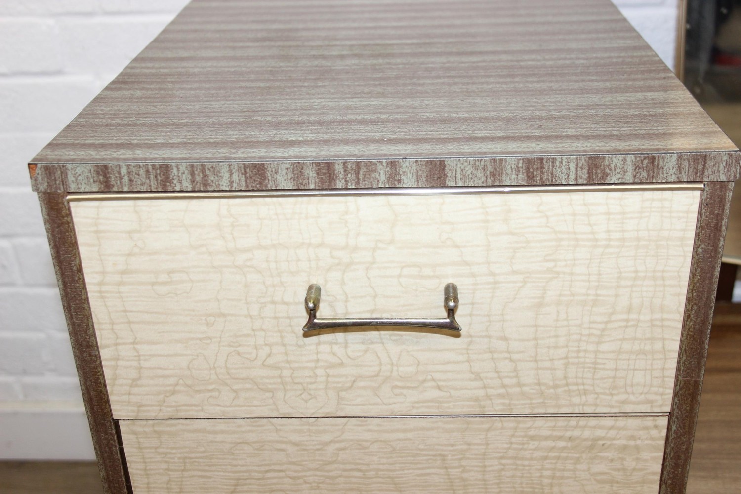 A retro 1950's five drawer chest of drawers and dressing table with two drawers and small cupboard to base by MelaFurn, faux wood effect with metal handles, dressing table 118cm x 50cm x 162cm [2]