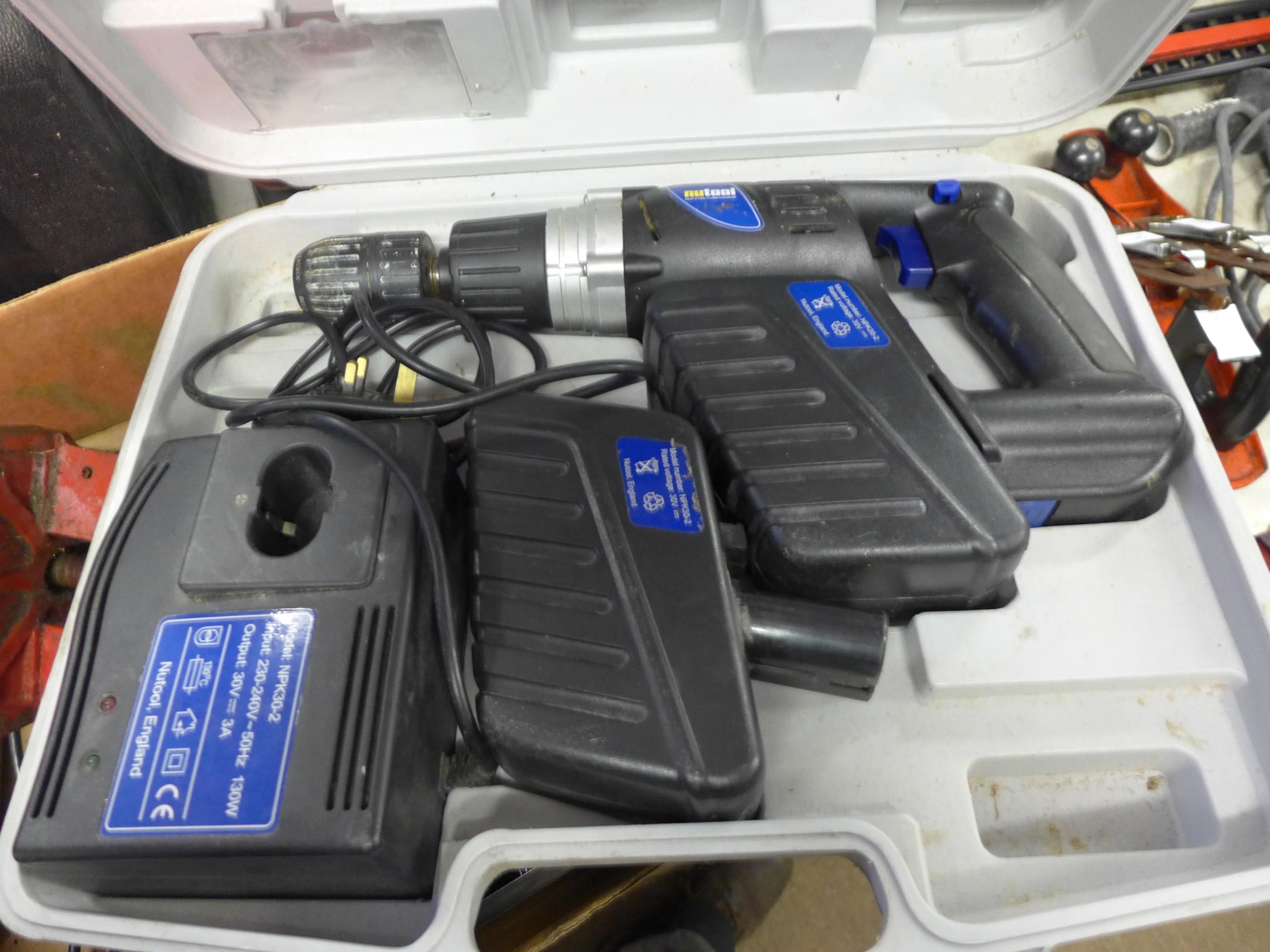 NuTool 30V cordless drill with batteries and charger in case