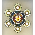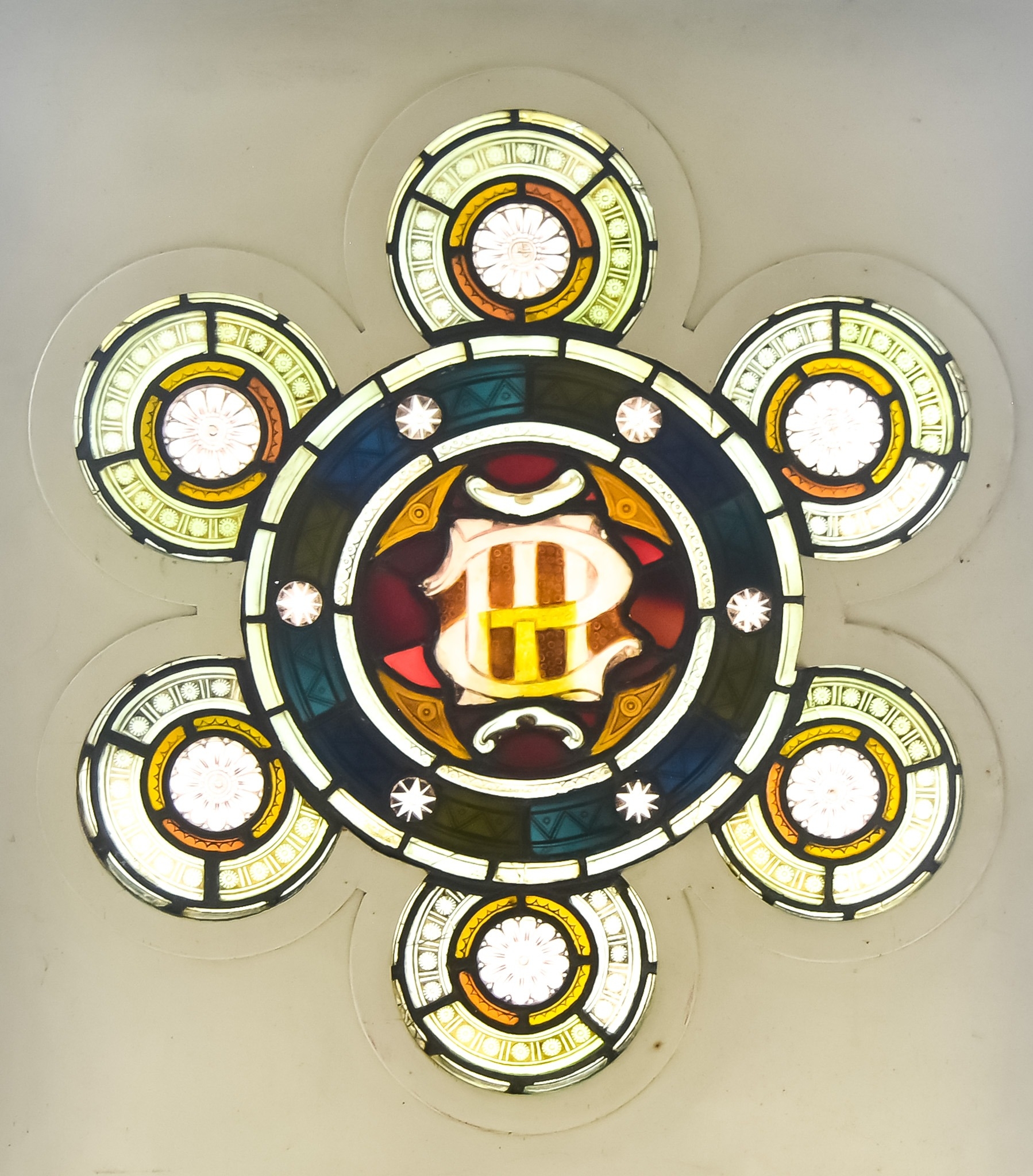 A Late 19th/Early 20th Century Stained Glass Panel, saved from a bombed out church in London during World War II, the centre circle branching out into six smaller conforming circles, 30ins diameter at longest point