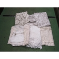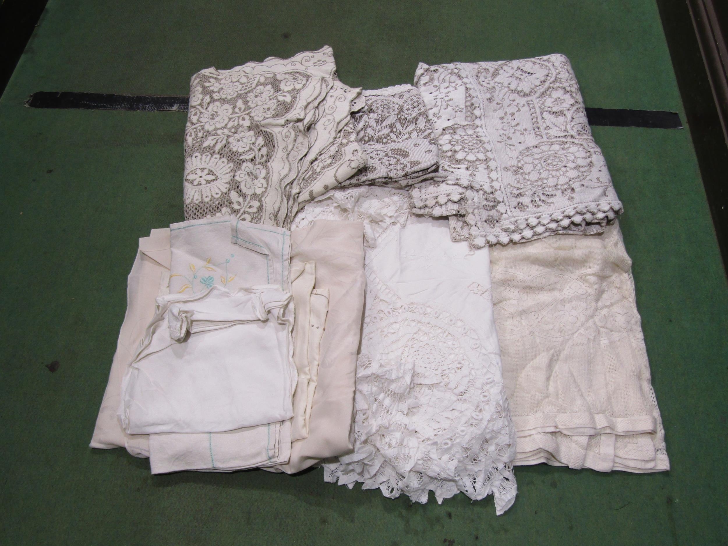 A quantity of lace and linen table clothes, variety of style...