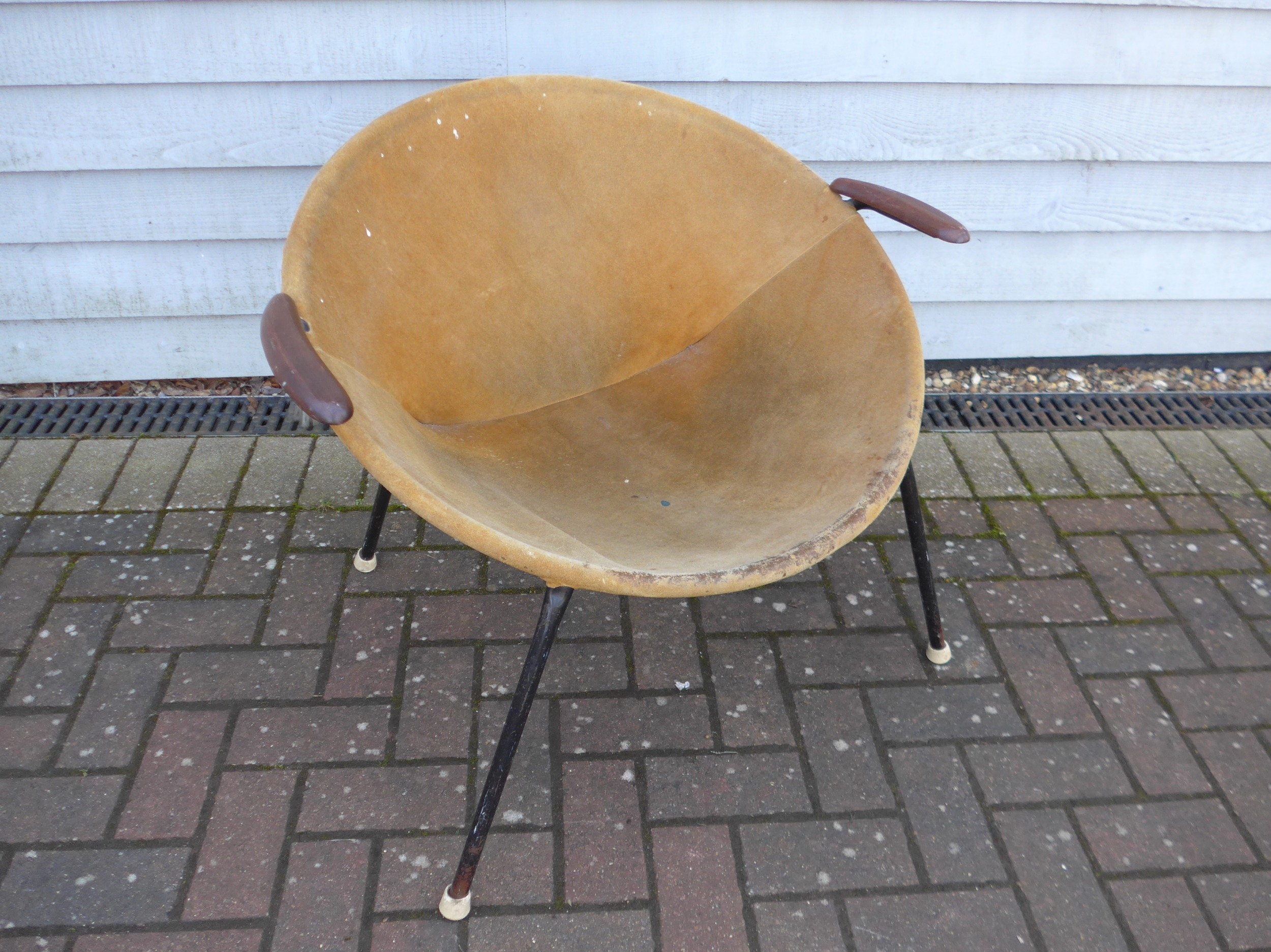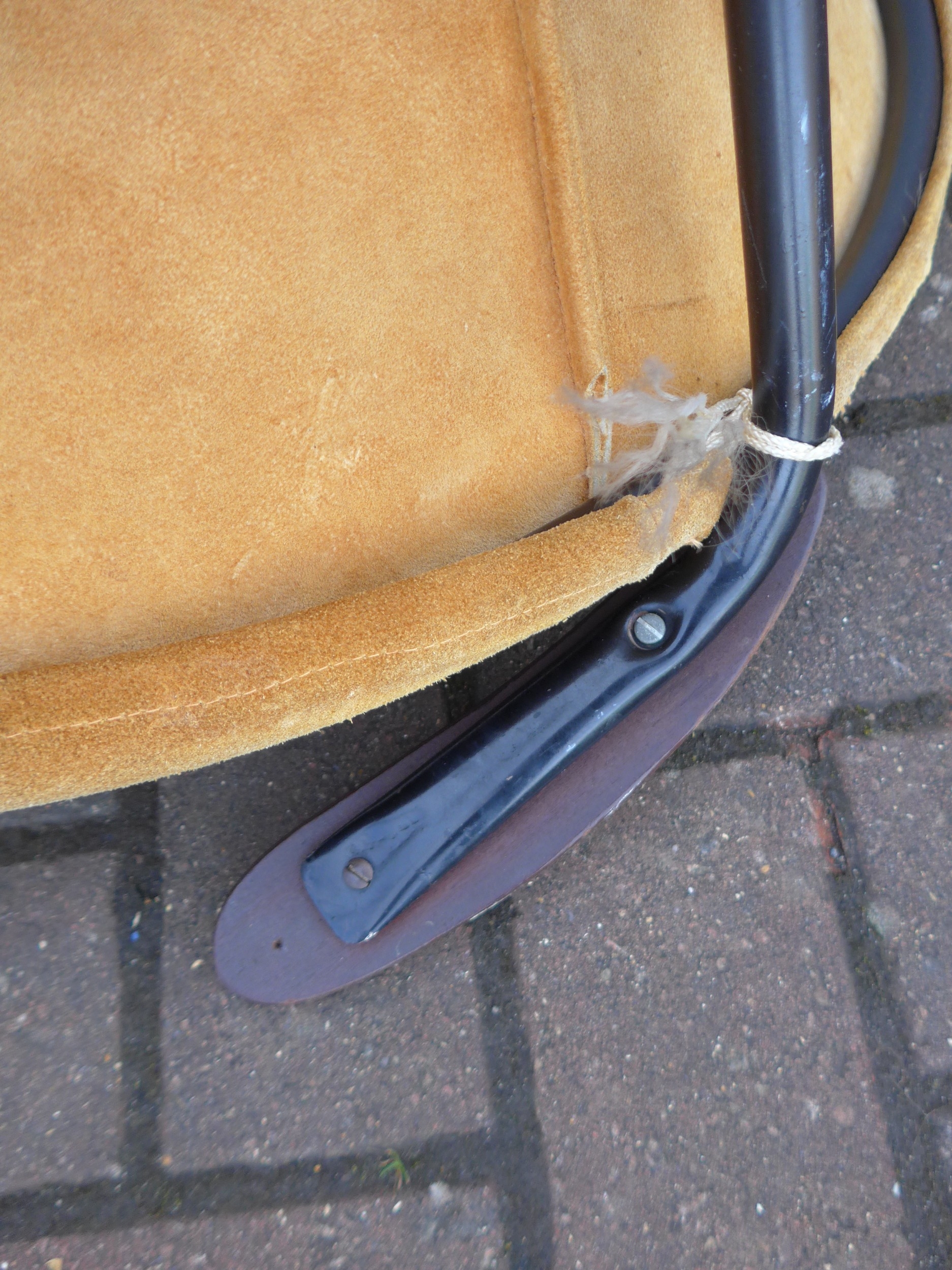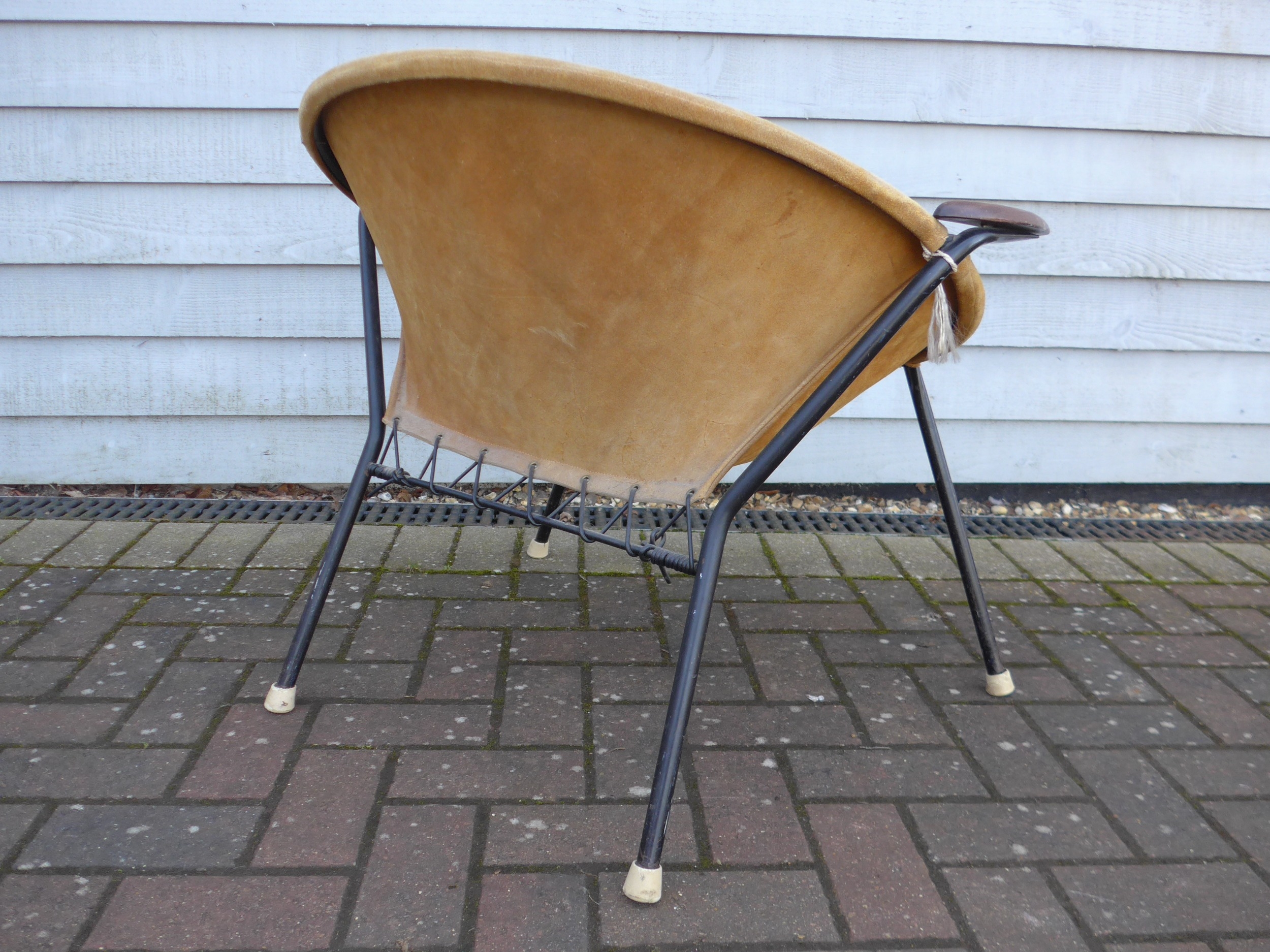 A "Balloon" chair by Hans Olsen for Lea Design circa 1960's, tubular black metal frame, teak arms and suede seat and back, 76cm wide x 69cm x 65cm high
