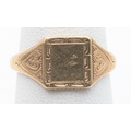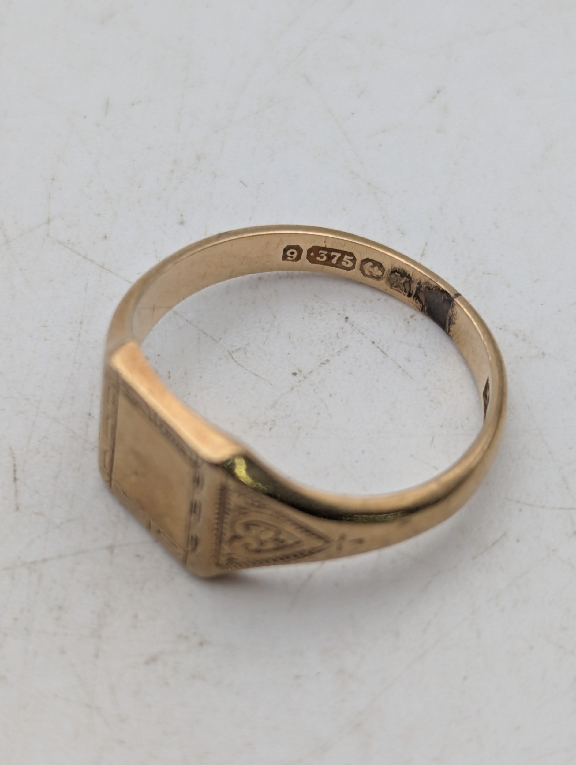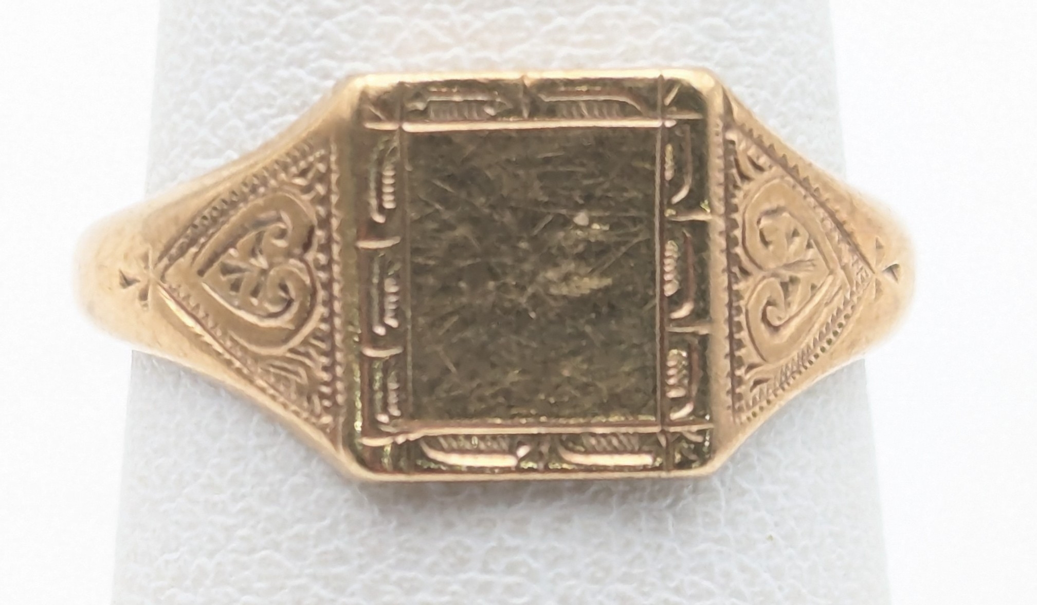 A 9ct yellow gold signet ring with engraved decoration, size L 1/2, 3g