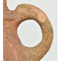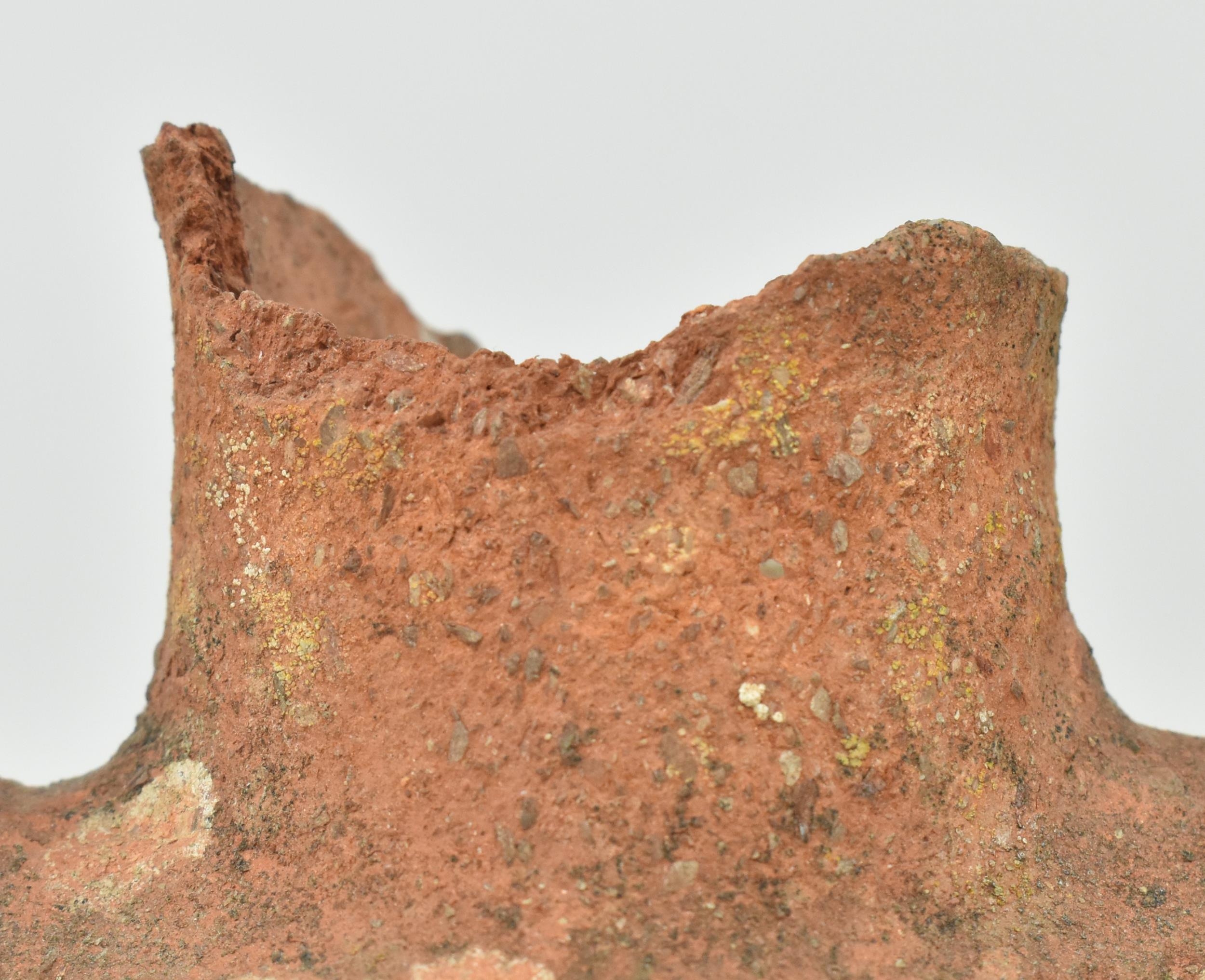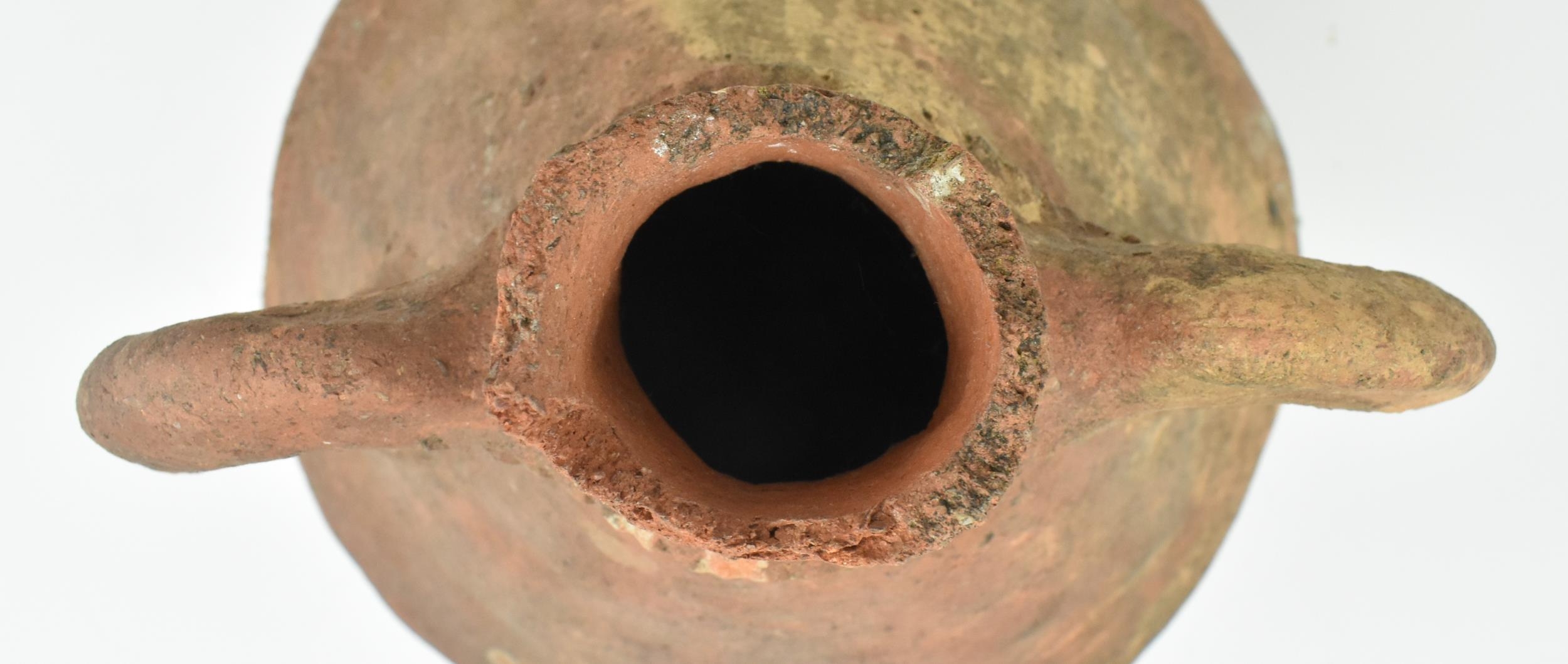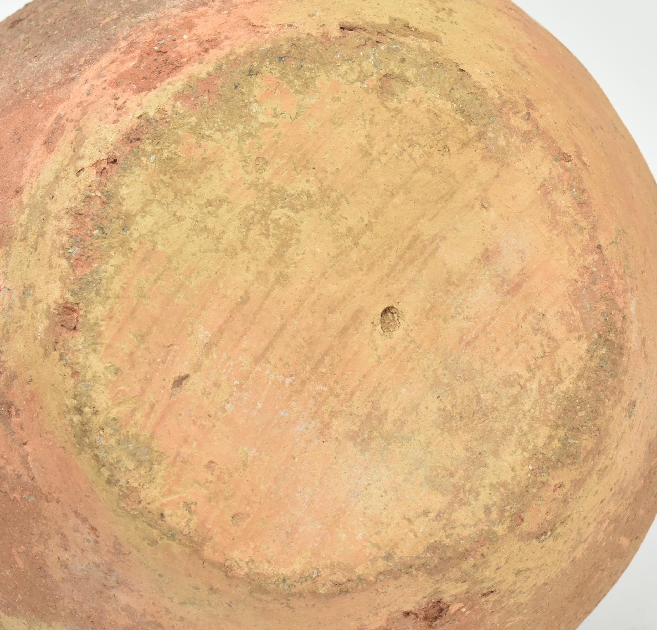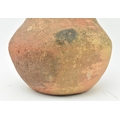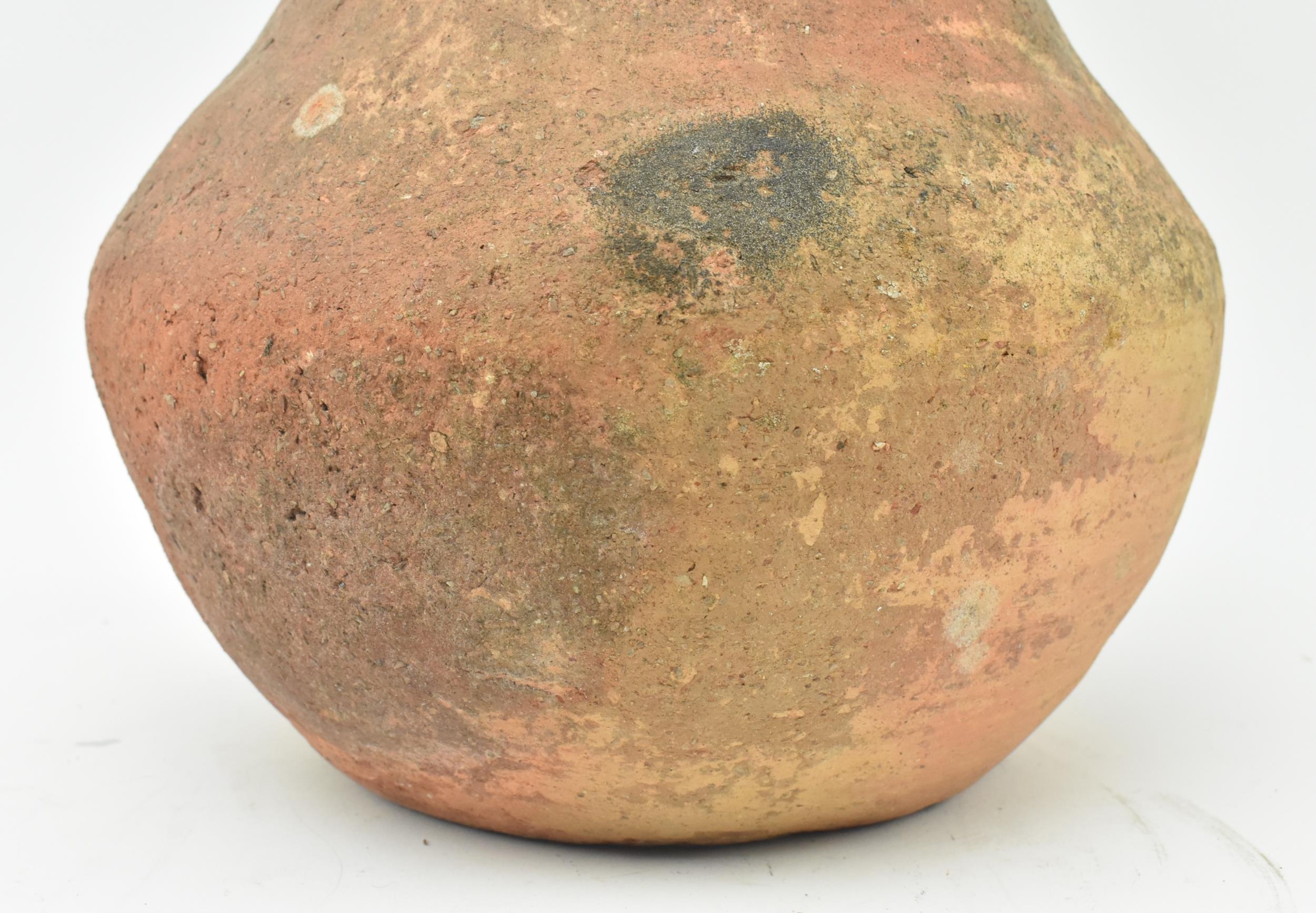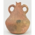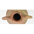 A Mesopotamia large Roman / North African/ Greek/ terracotta storage amphora. The bulbous shaped body amphora has a twin loop handle with carved details on the neck. Damage to the mouth rim. Measures approx. 32cm tall.
