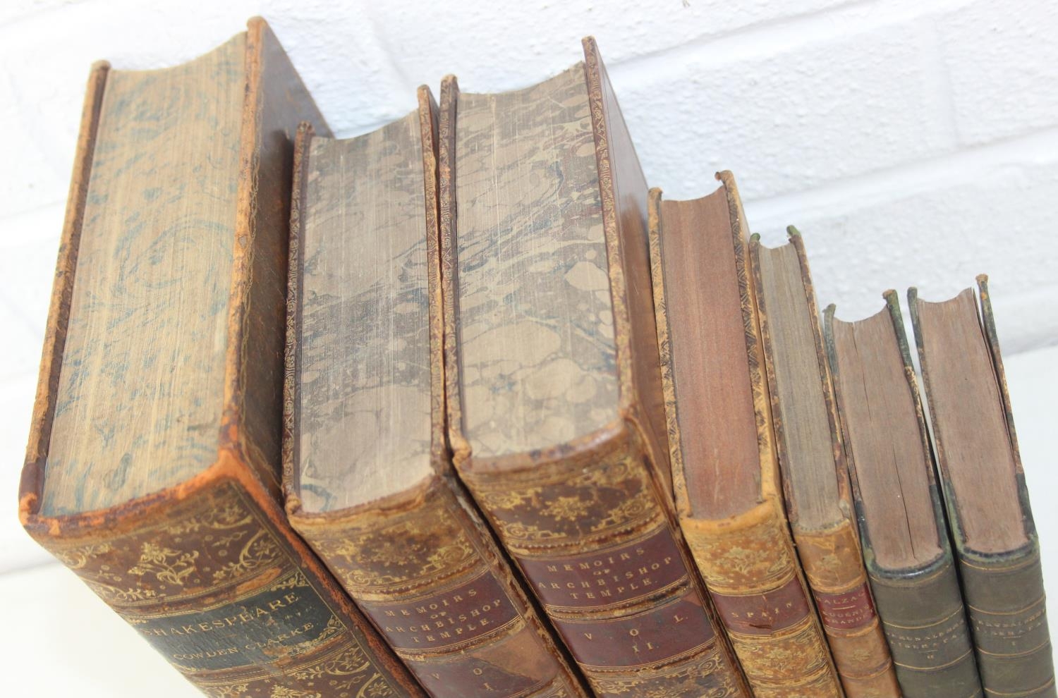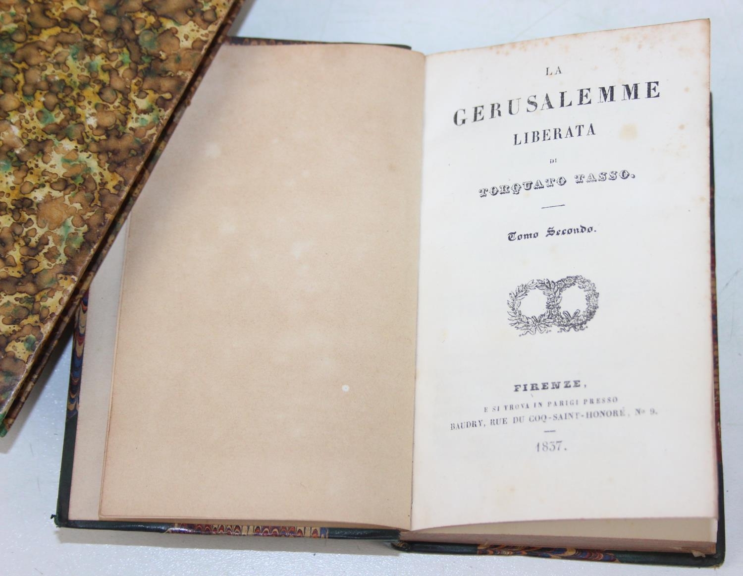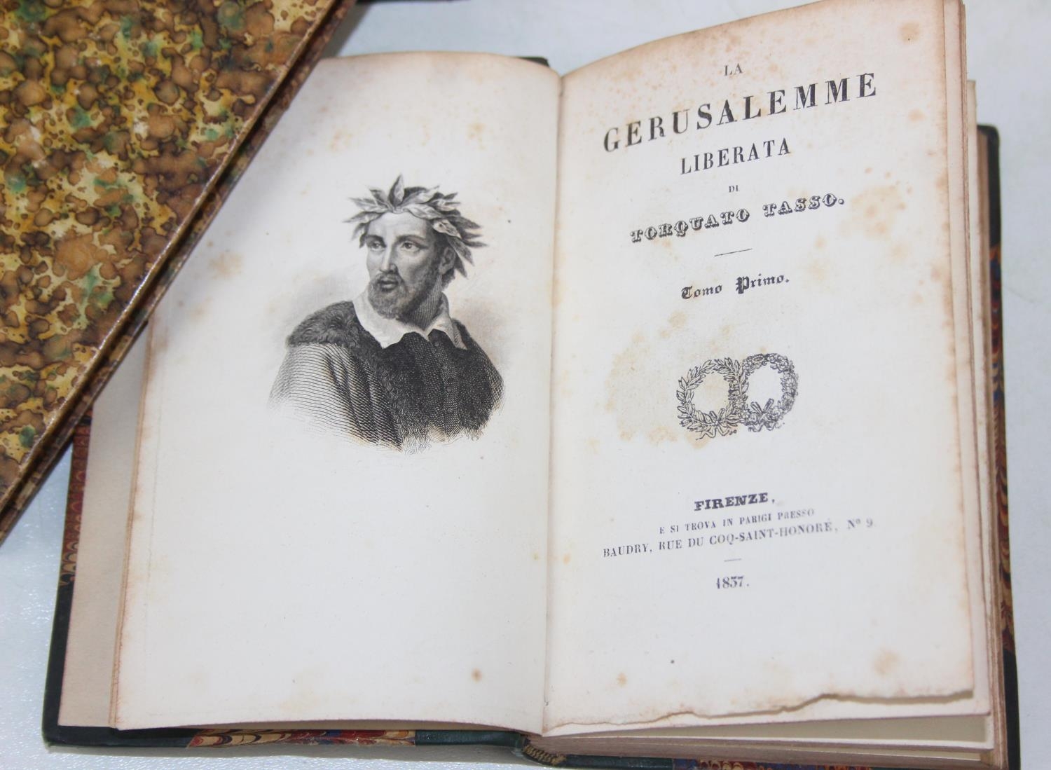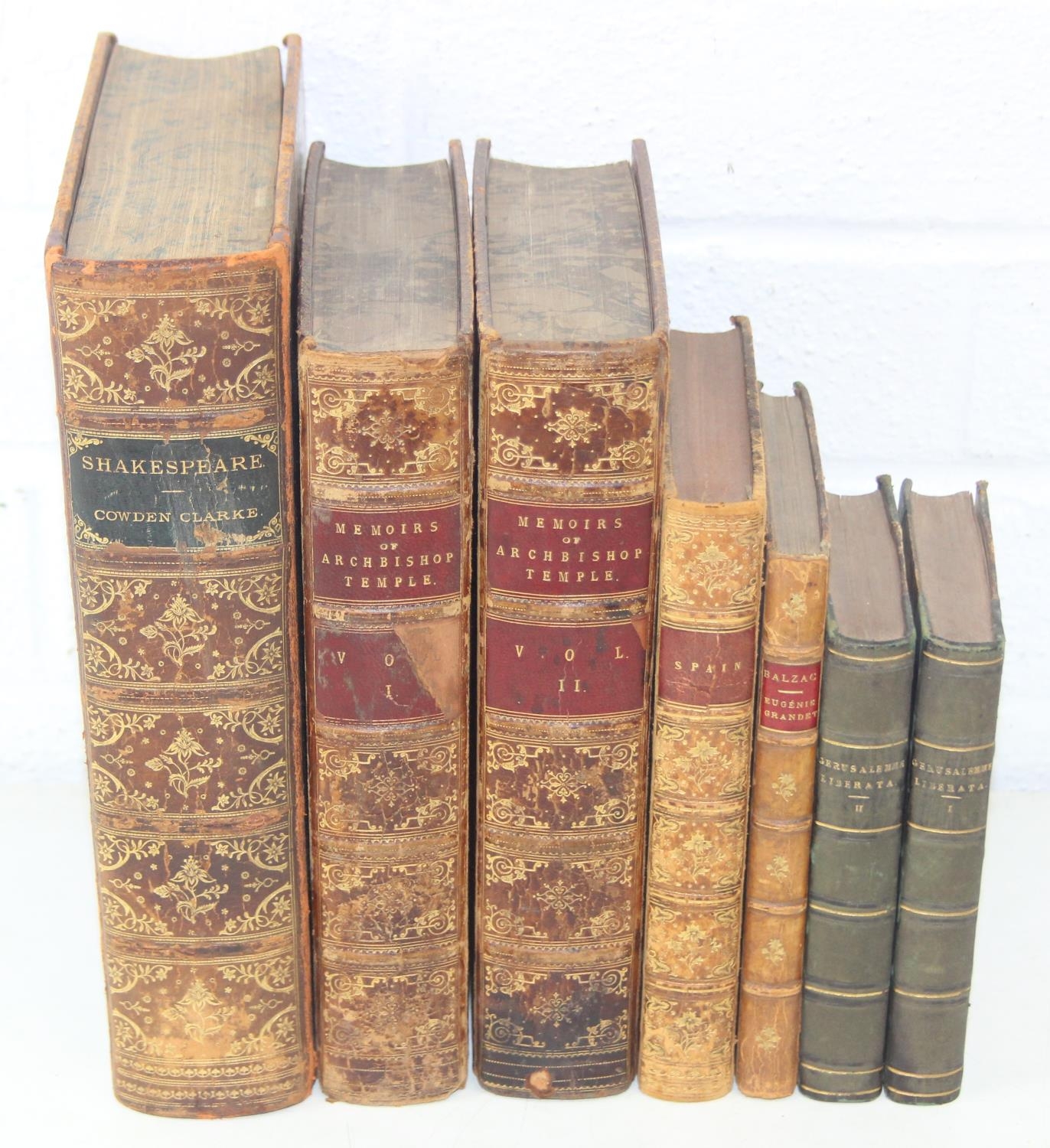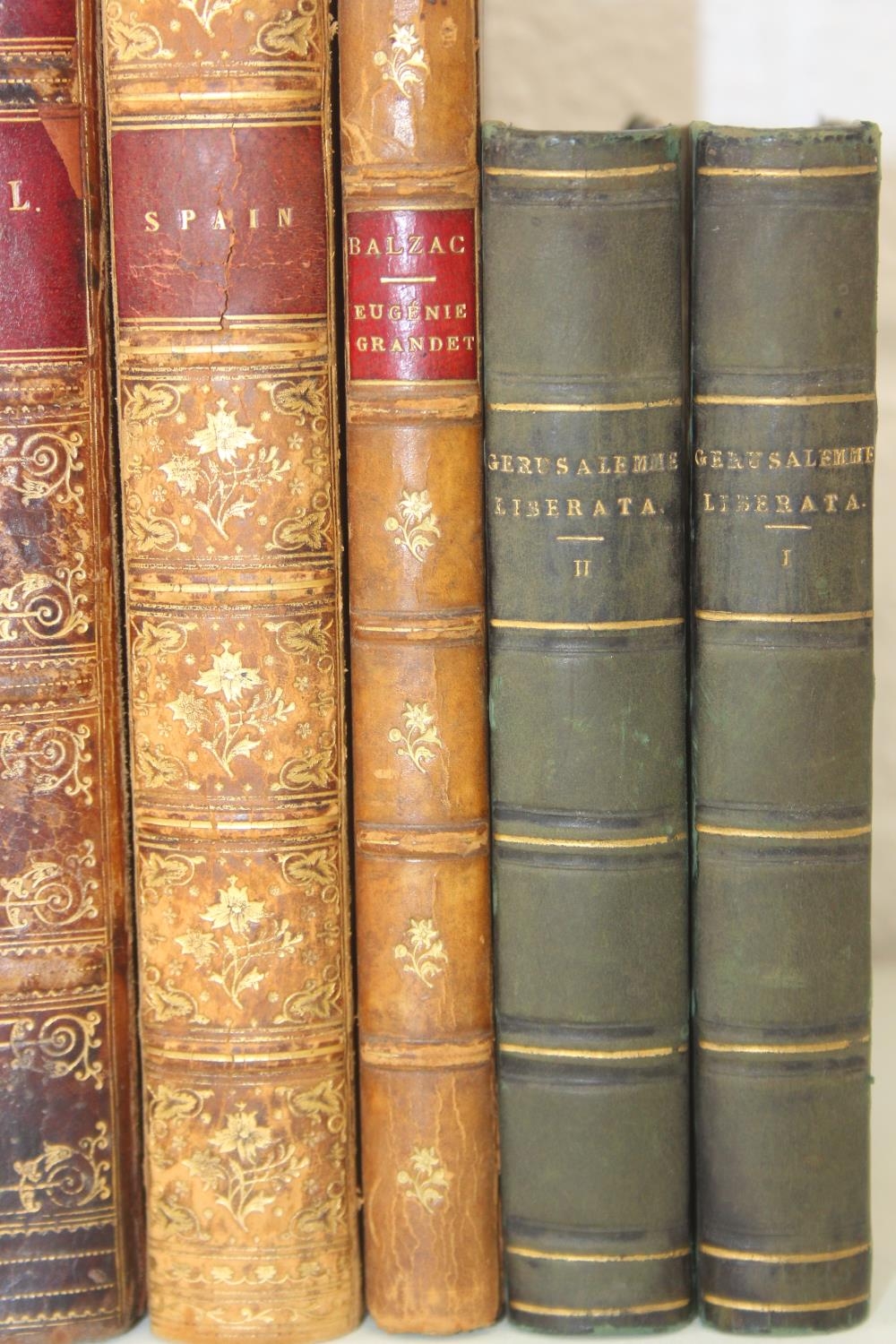 Seven assorted antique leather bound books to inc La Gerusalemme Liberata 1837 in 2 volumes, Gatherings From Spain 1846 etc [7]