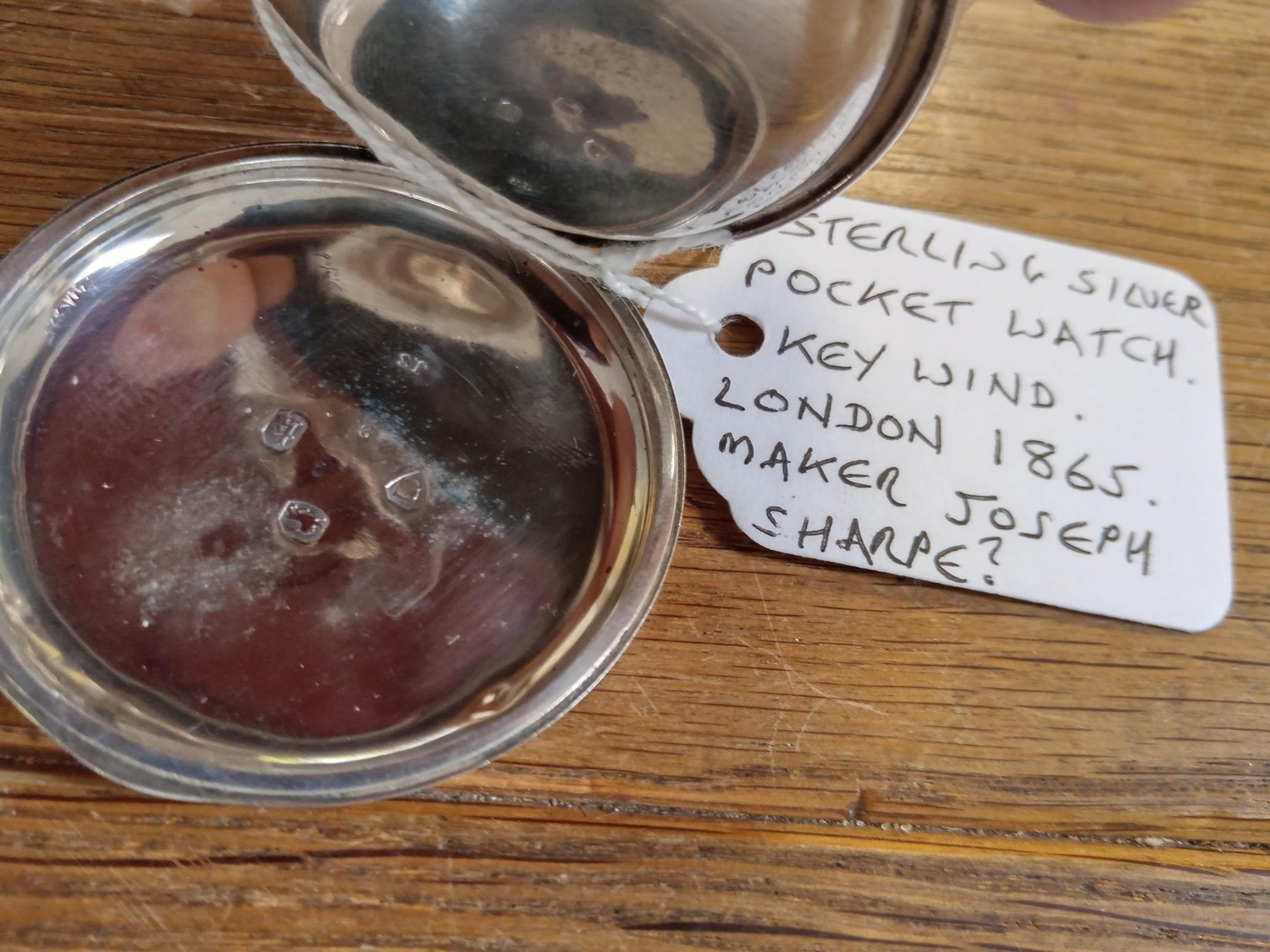 Sterling silver pocket watch key wind. London believed 1865 maker Joseph Sharpe?