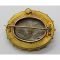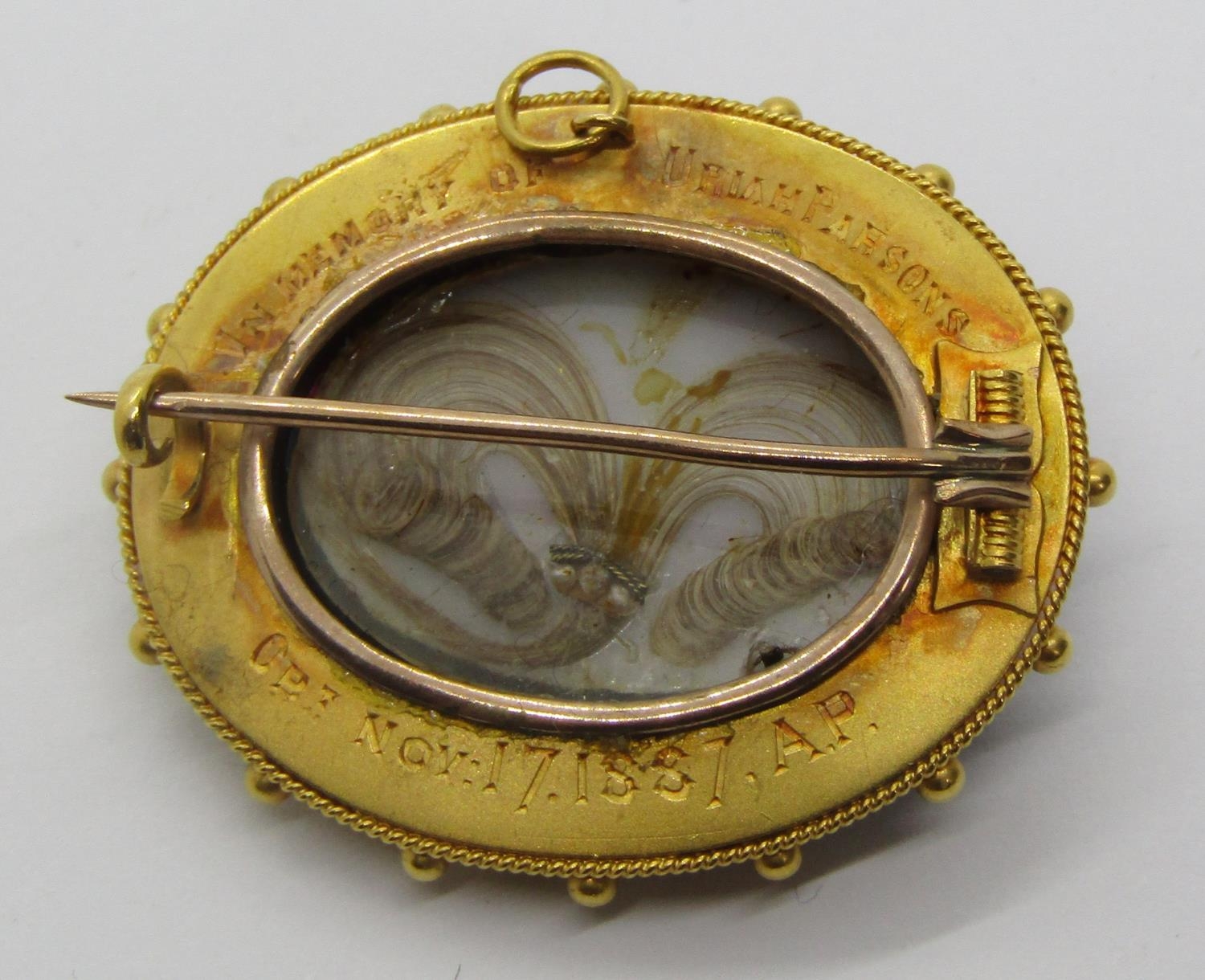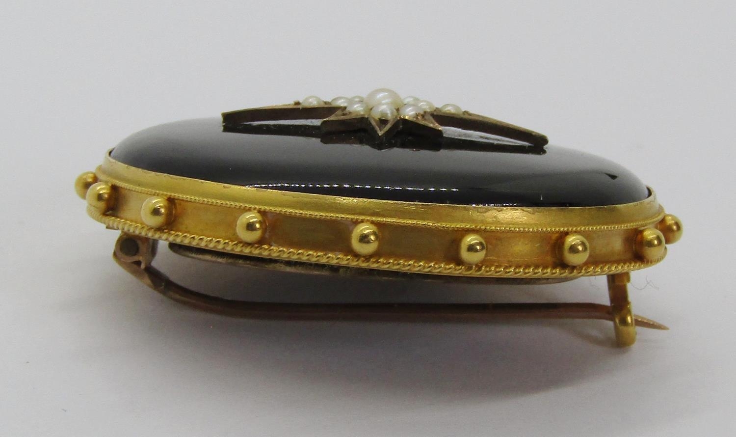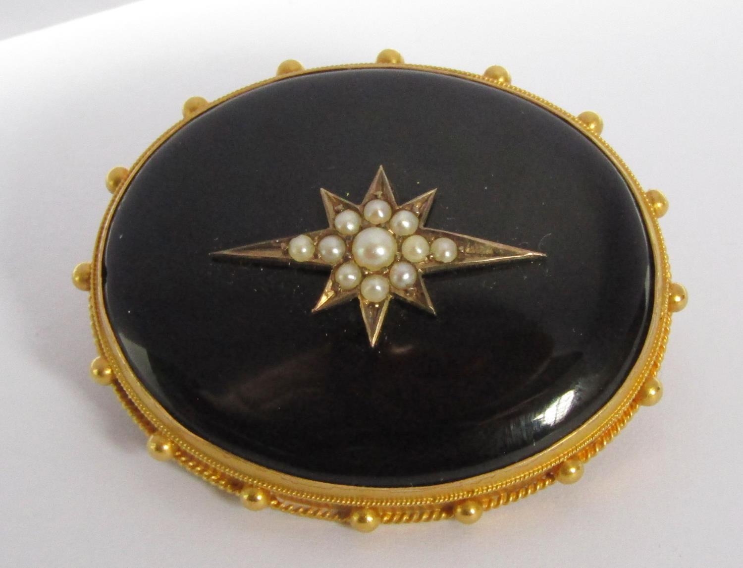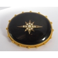 Victorian yellow metal onyx mourning brooch with central star motif set with seed pearls and beaded outer frame, the reverse containing a lock of hair and inscribed 'In Memory of Uriah Parsons Obt Nov: 17. 1887. A.P.', 14.4g