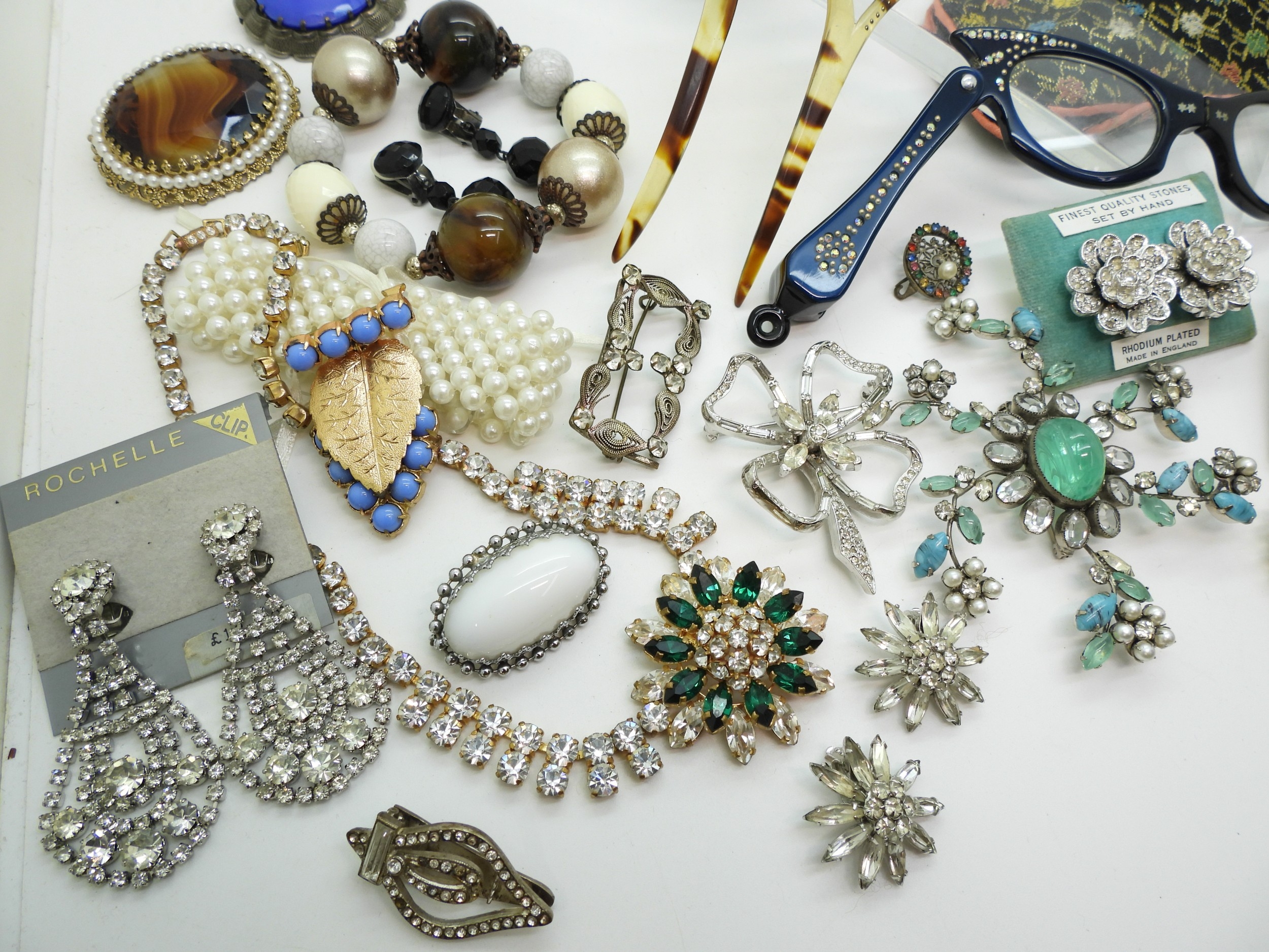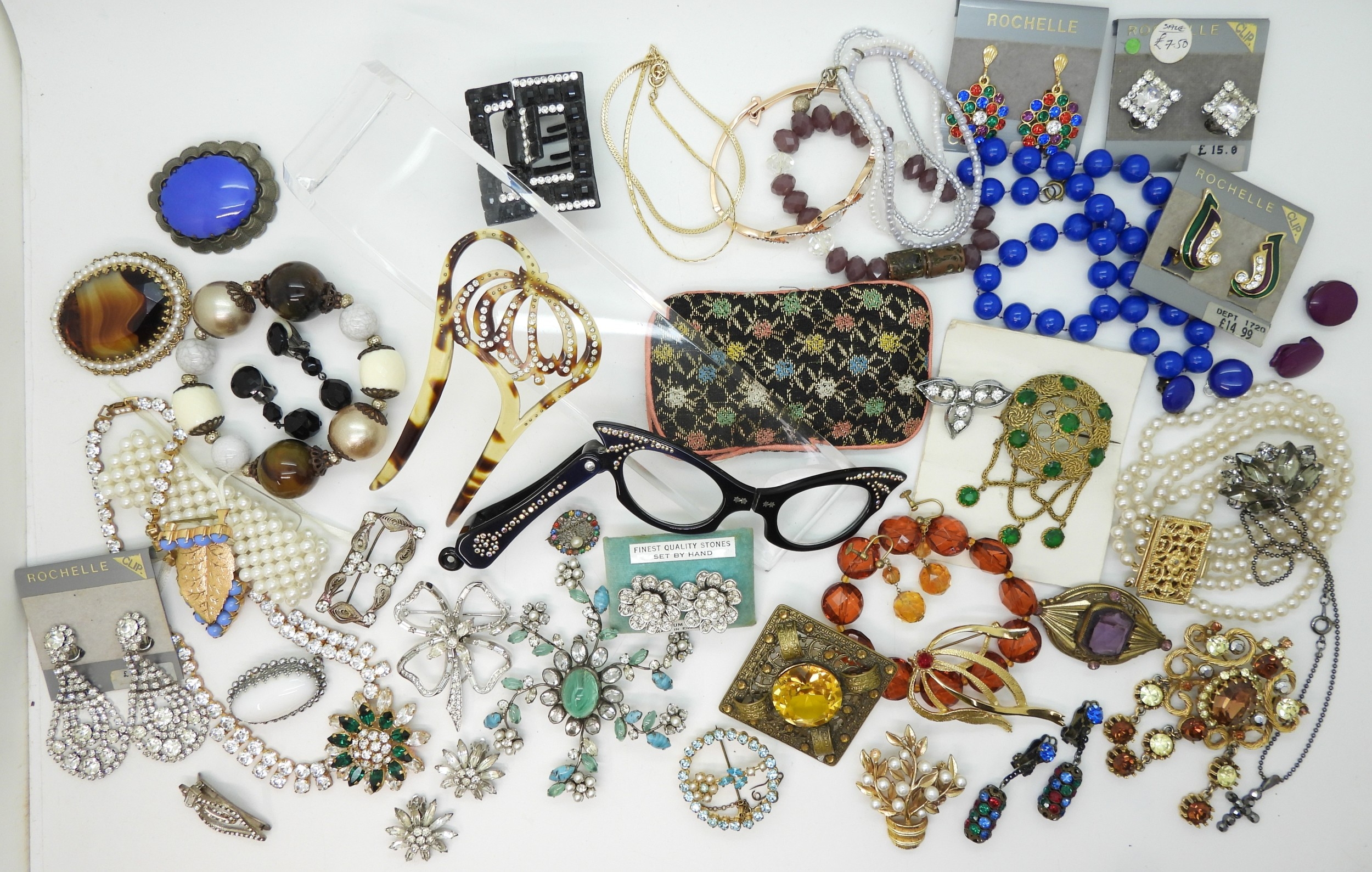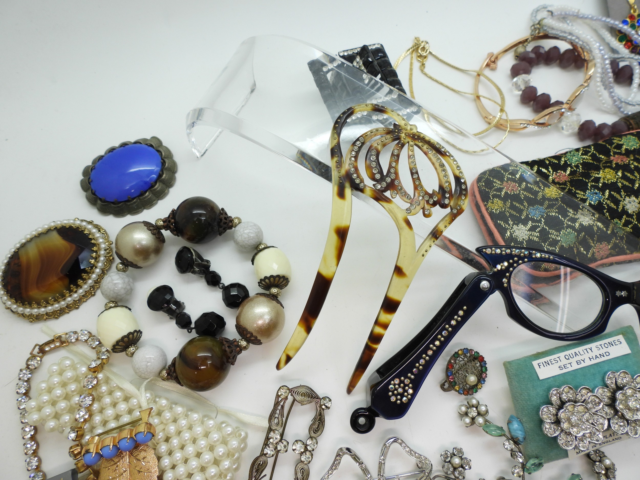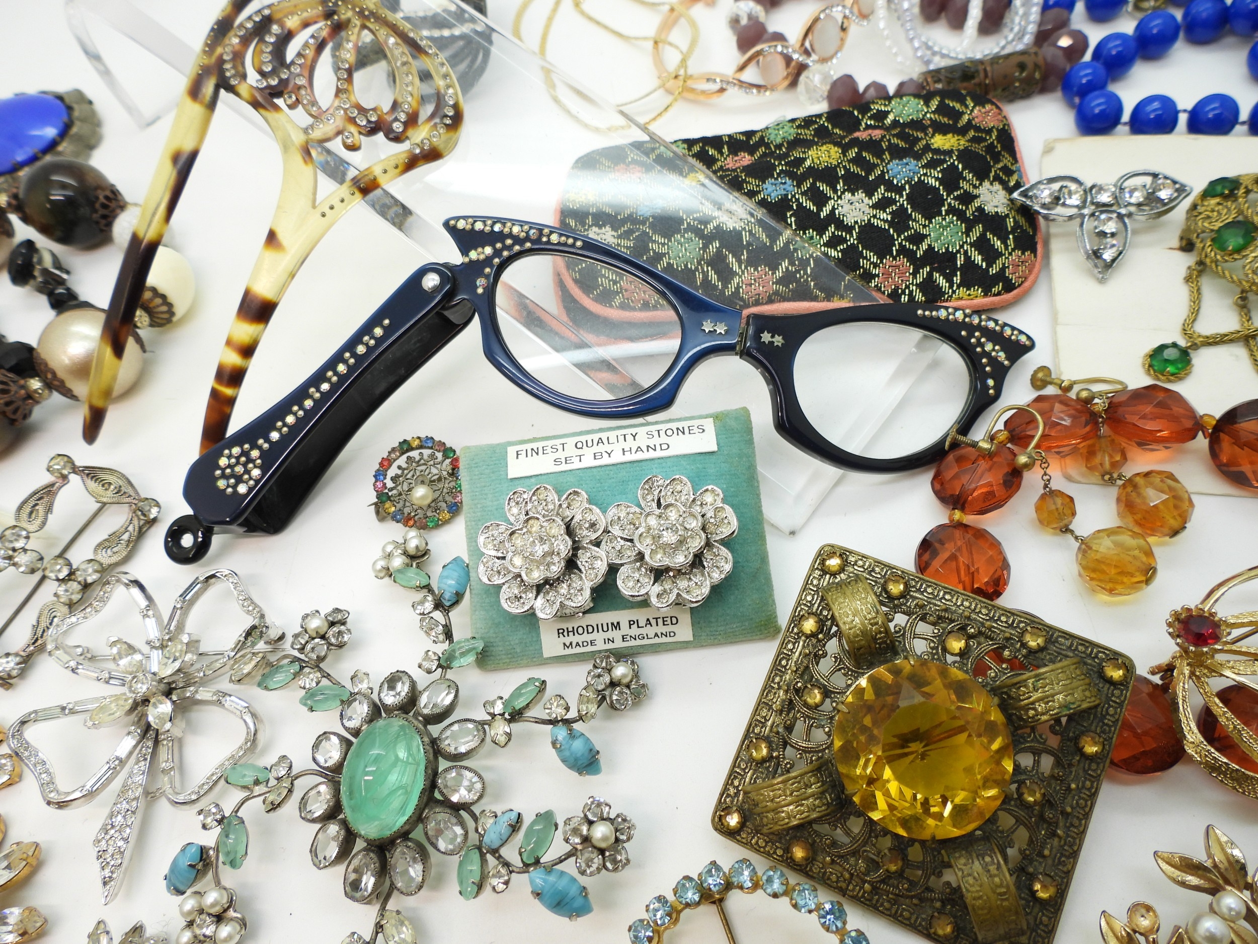 A collection of vintage costume jewellery to include a pair of metallic blue acrylic and diamante 'Cat's eye' lorgnettes 'Francois' Victorian style brooch, diamante hair pin, good diamante, Brooch by Hollywood and other items