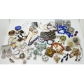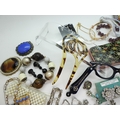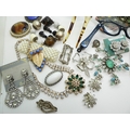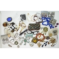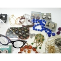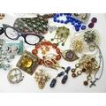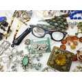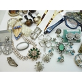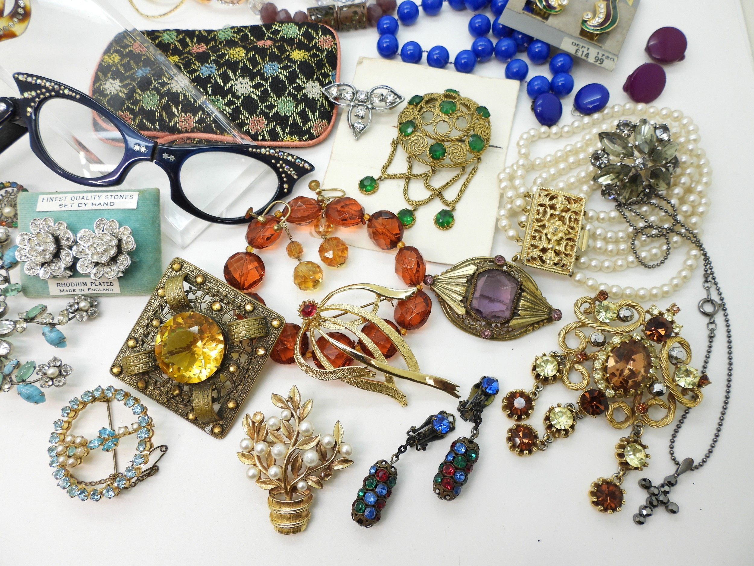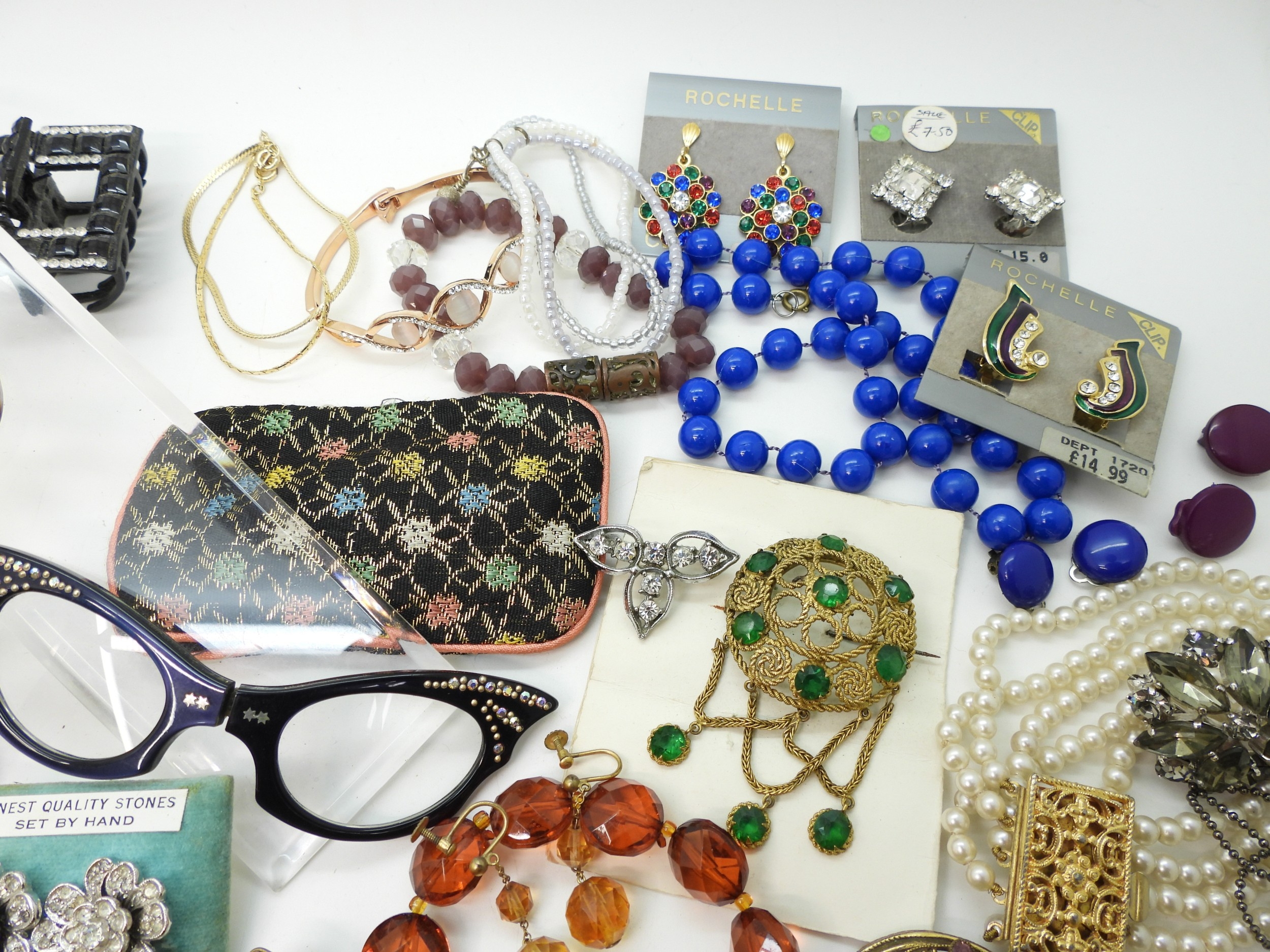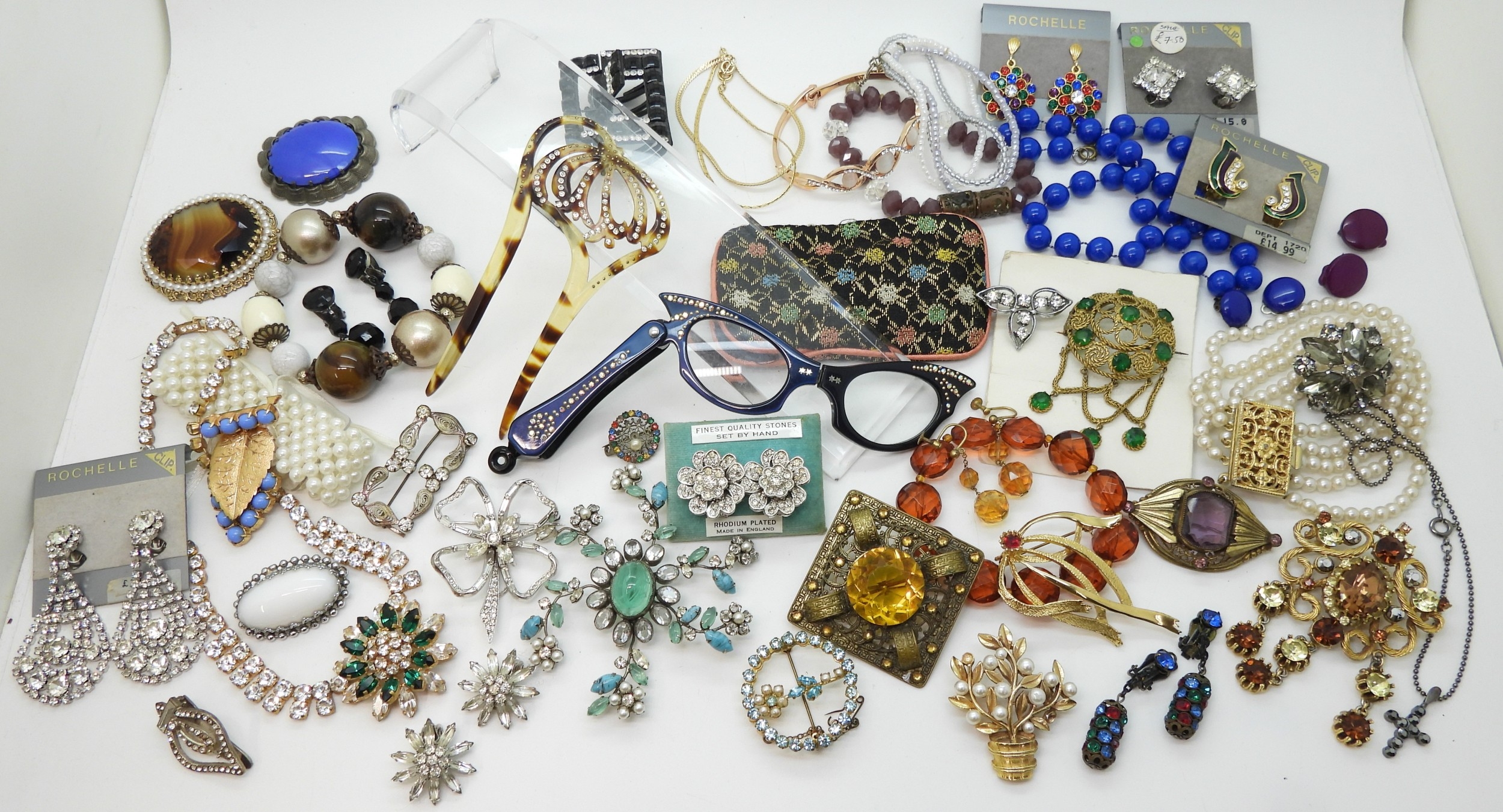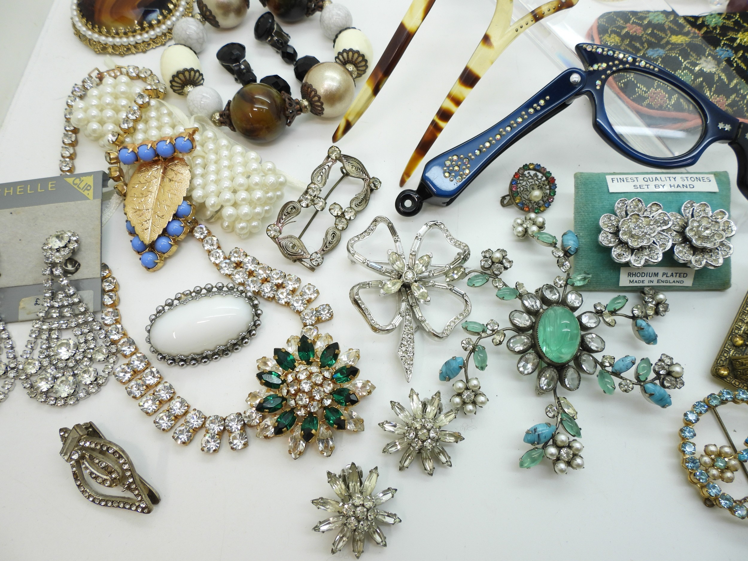 A collection of vintage costume jewellery to include a pair of metallic blue acrylic and diamante 'Cat's eye' lorgnettes 'Francois' Victorian style brooch, diamante hair pin, good diamante, Brooch by Hollywood and other items
