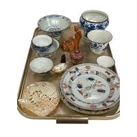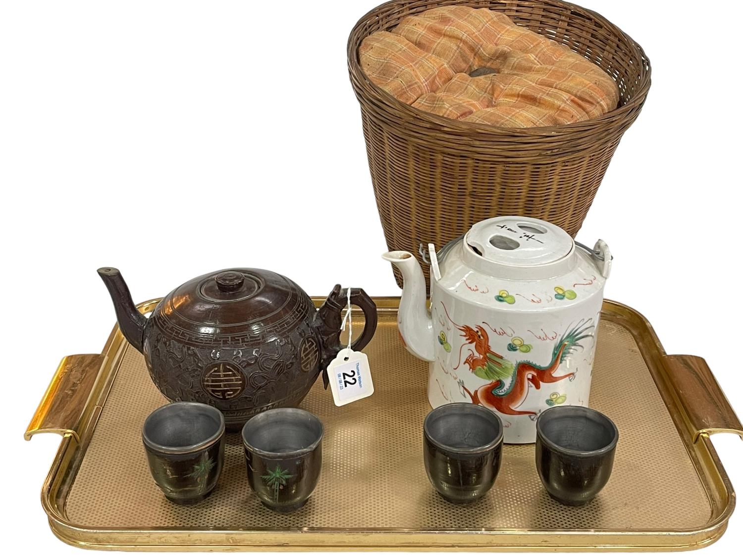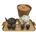 Chinese coconut teapot and four cups and Chinese teapot in wicker basket.