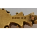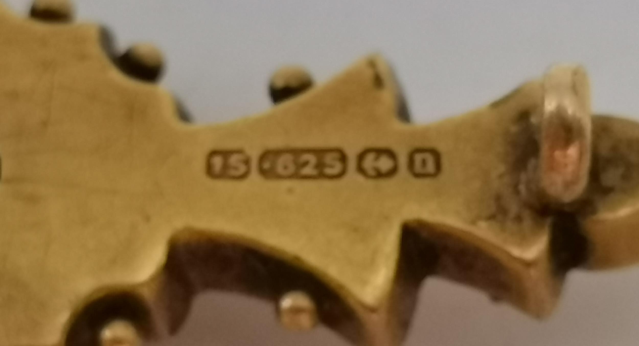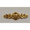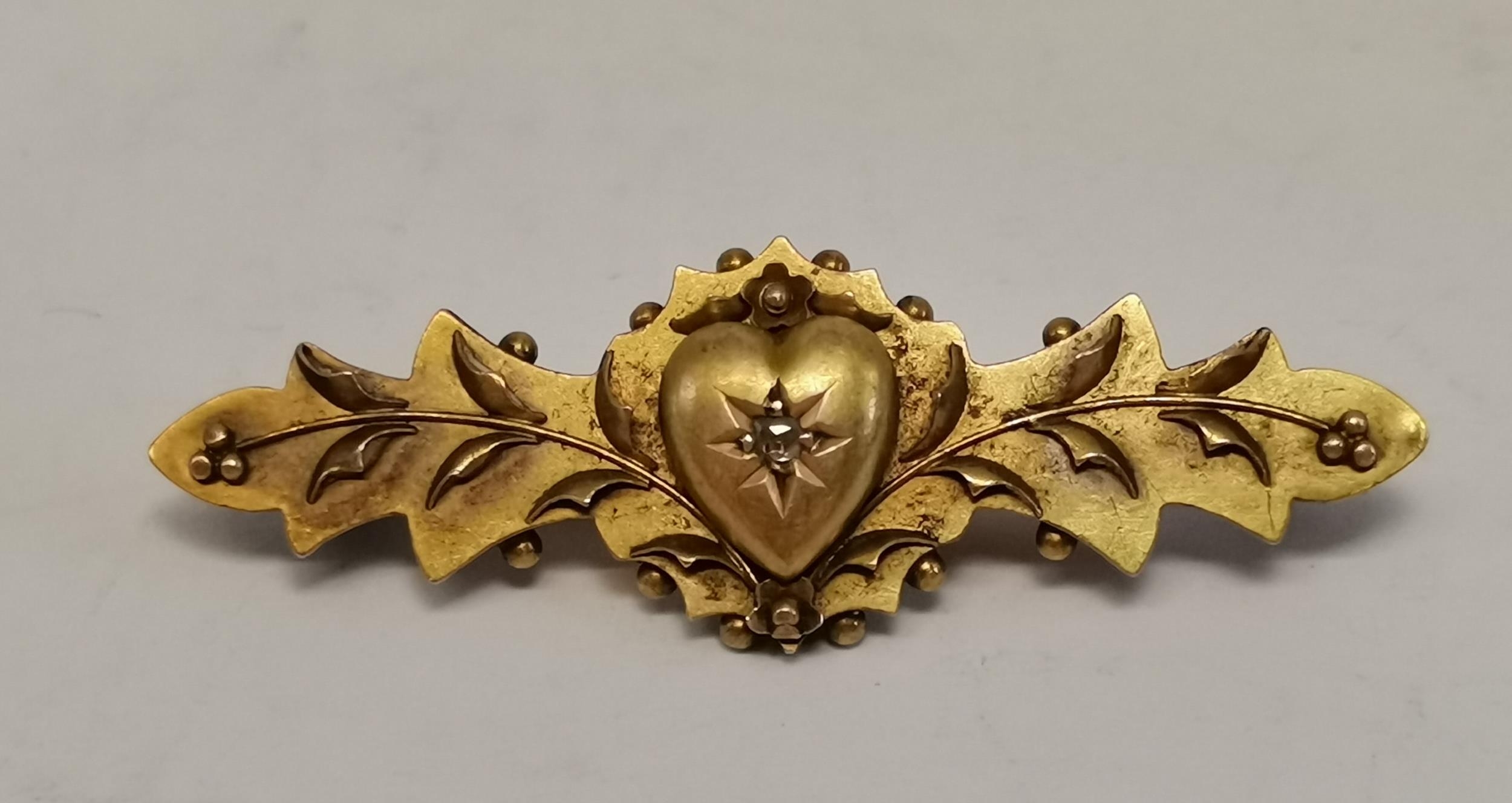An antique 15 carat gold brooch, the central heart set with a white stone, with leaf sprays either side, all to a shaped ground, hallmarked Birmingham 15.625. 42mm wide, 2.6g