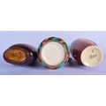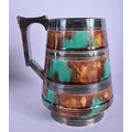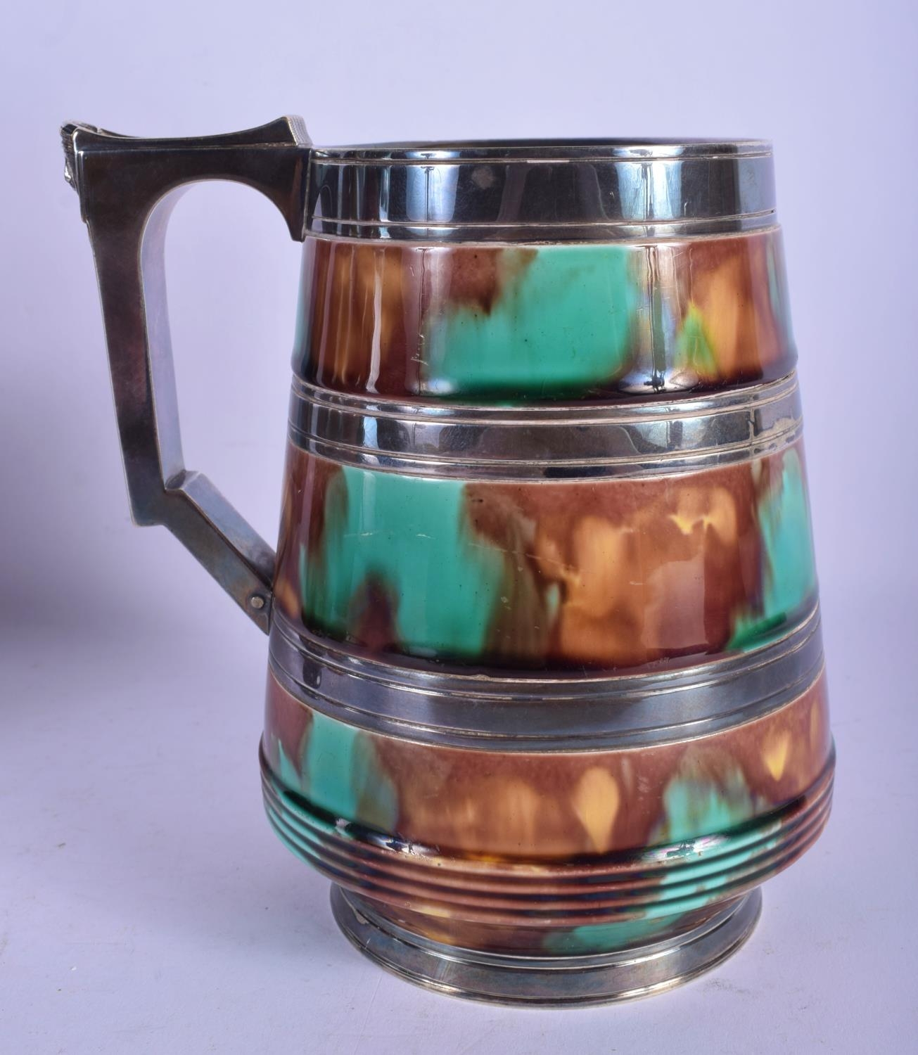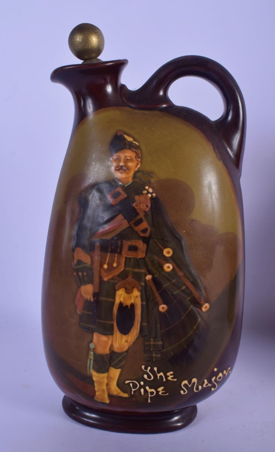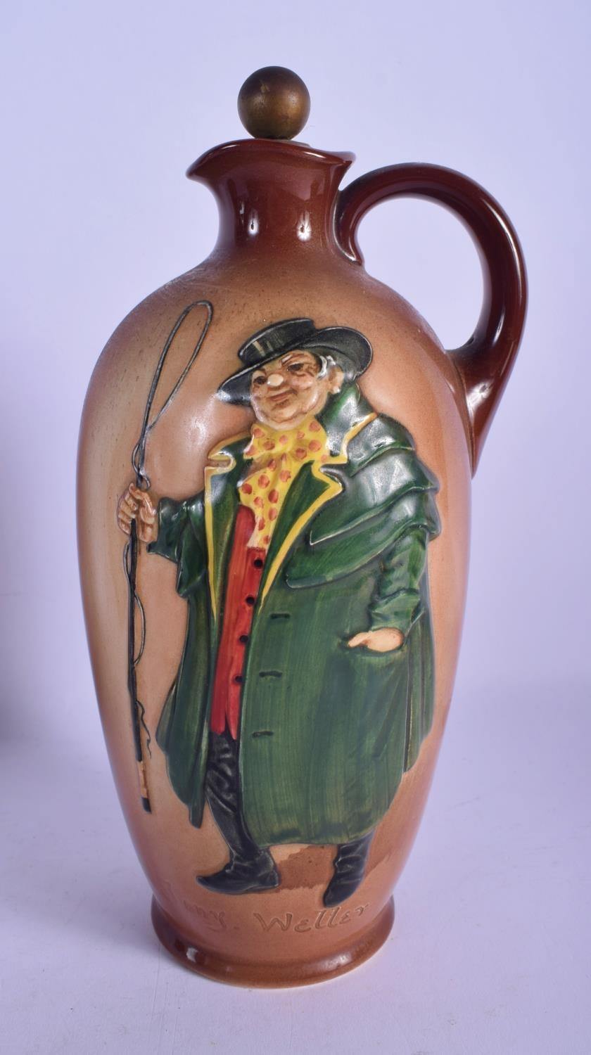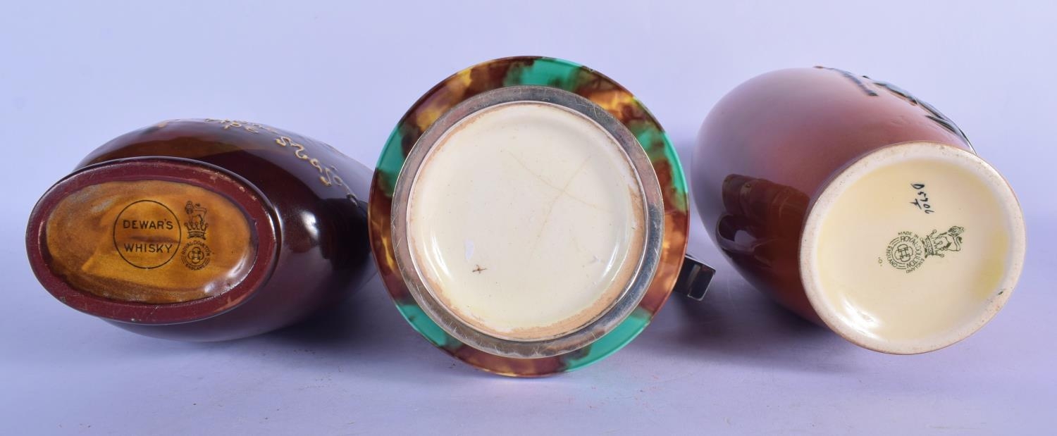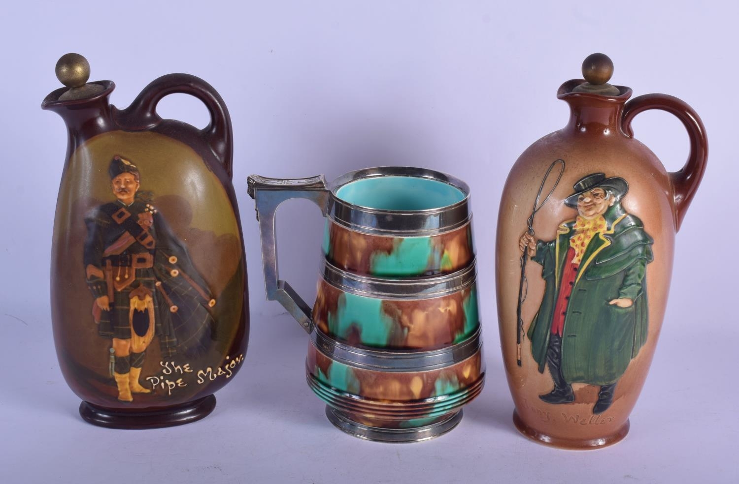 TWO ROYAL DOULTON WHISKEY DECANTERS together with a silver plated majolica jug. Largest 23 cm high. (3)