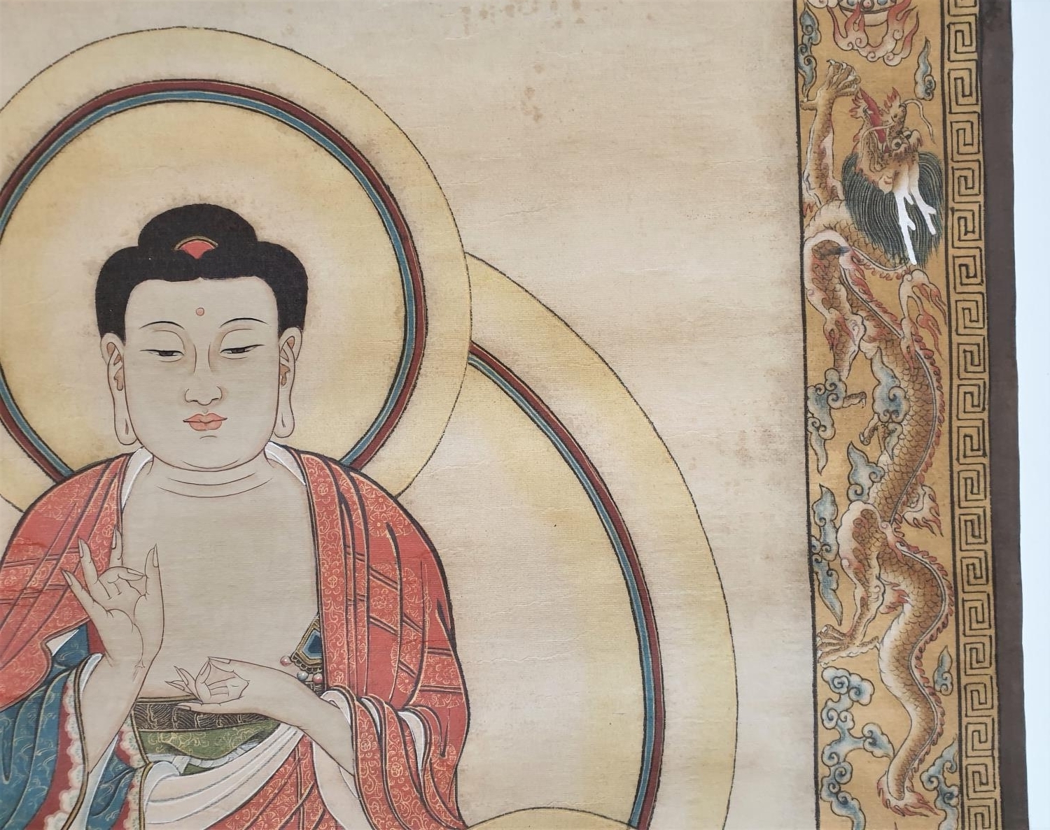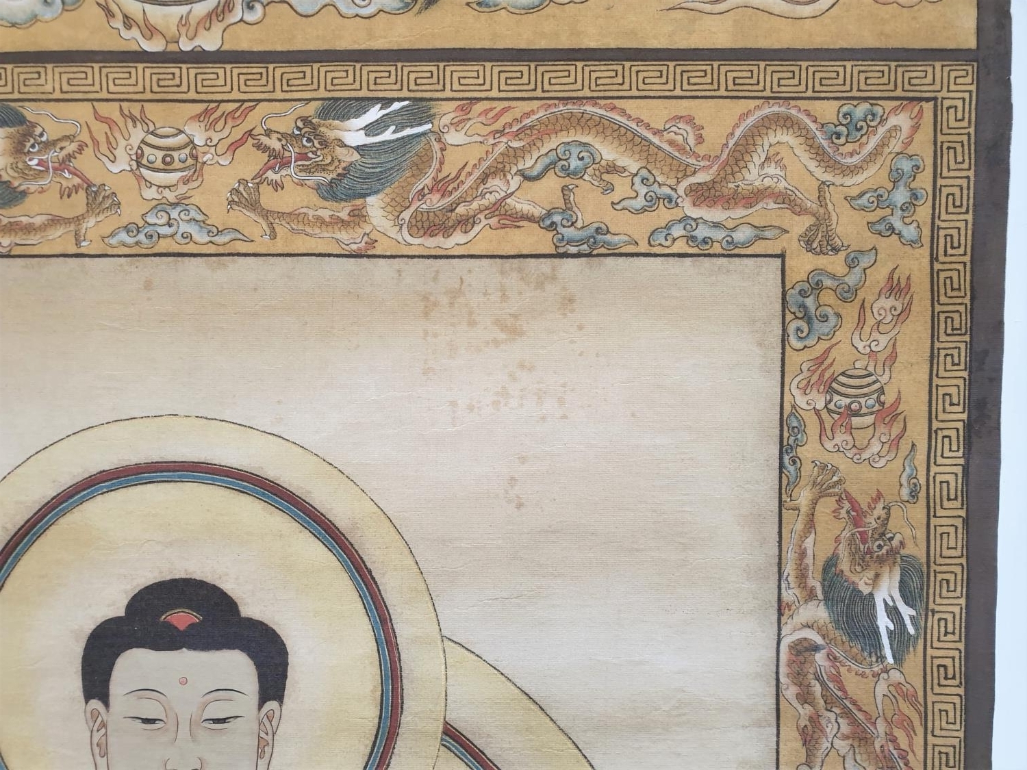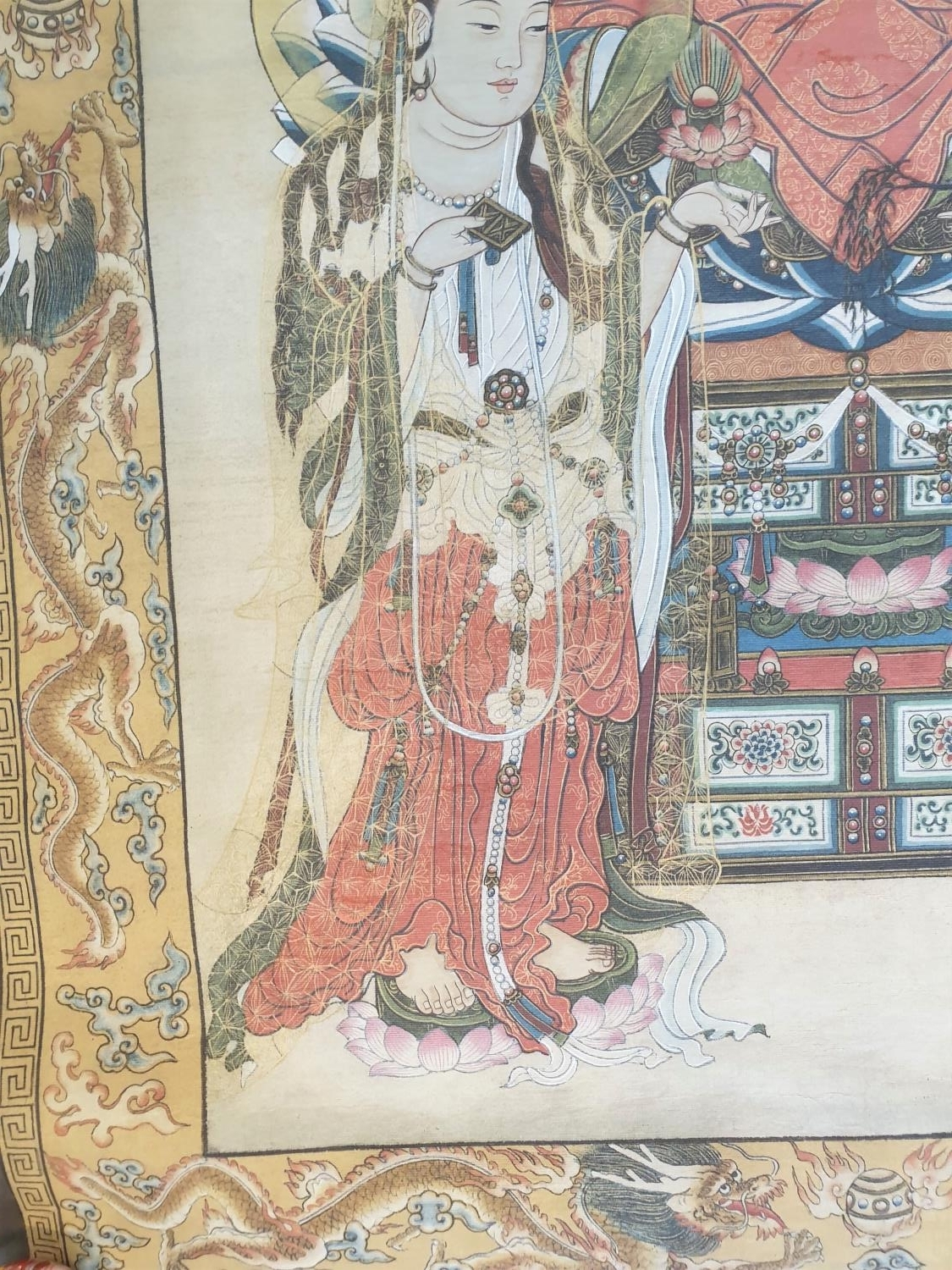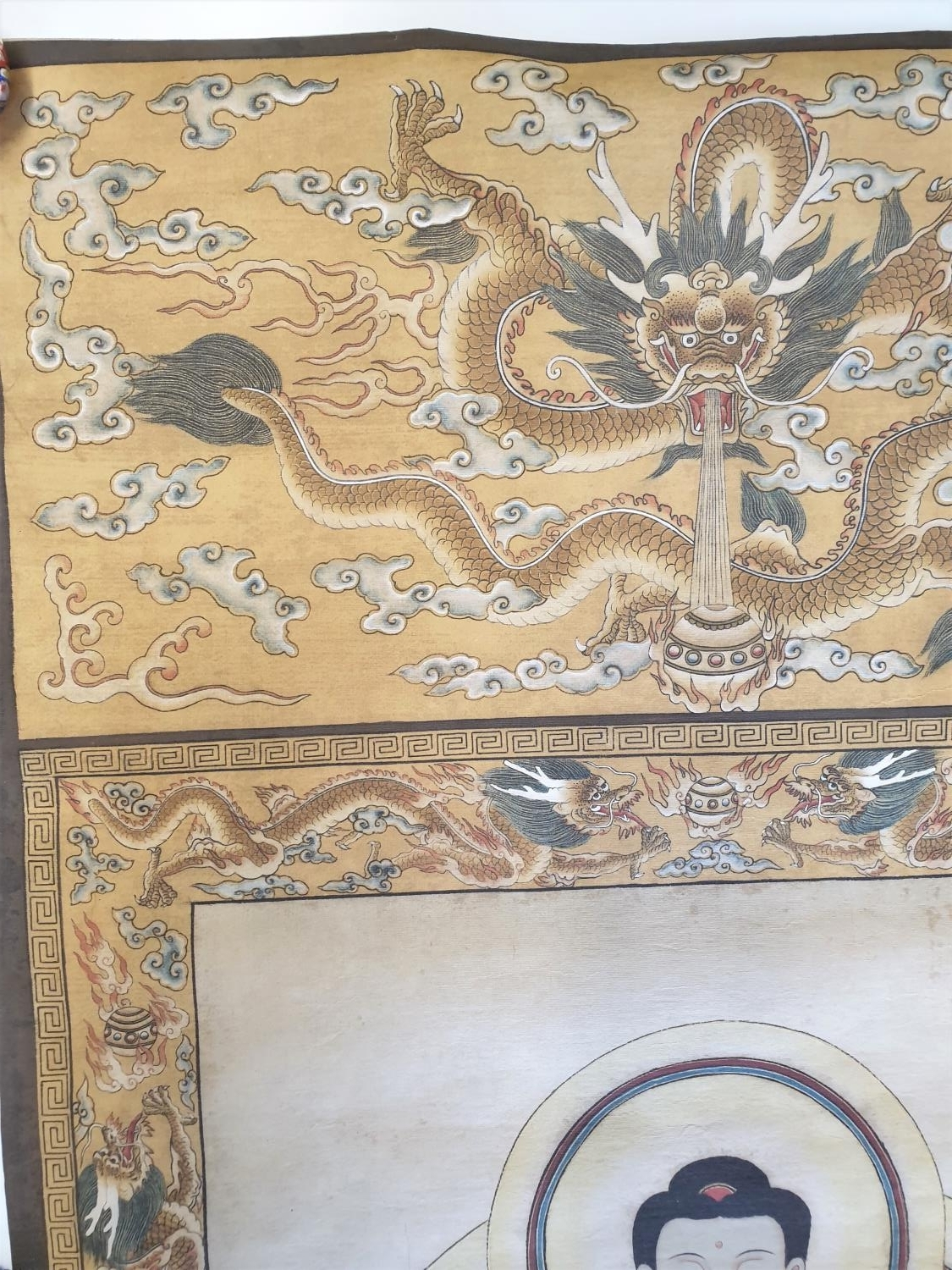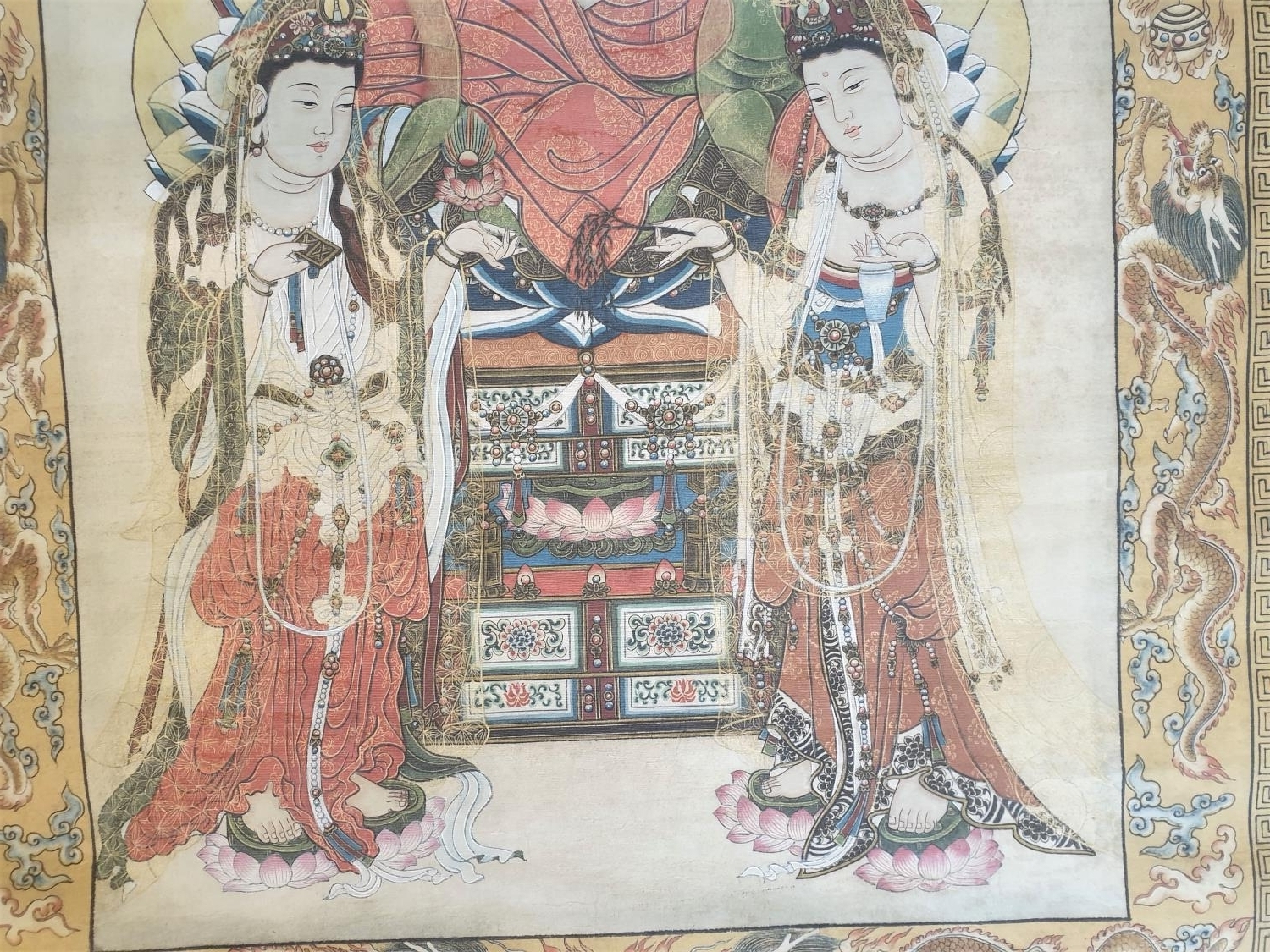 Antique Chinese Scroll Painting showing Figure Of Buddha with maidens With Golden Dragon border 130cm x 63cm