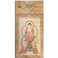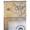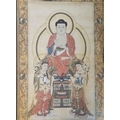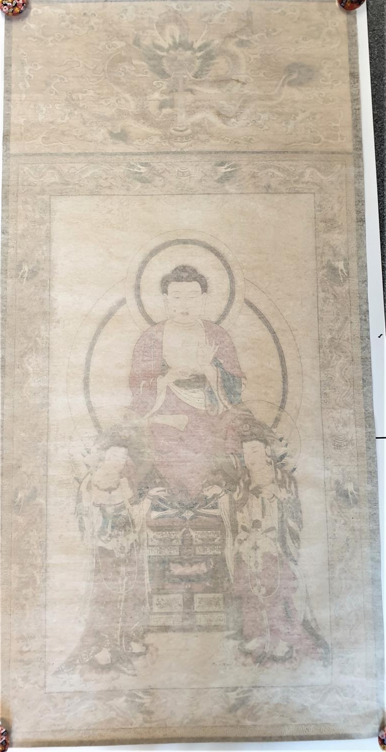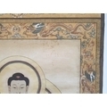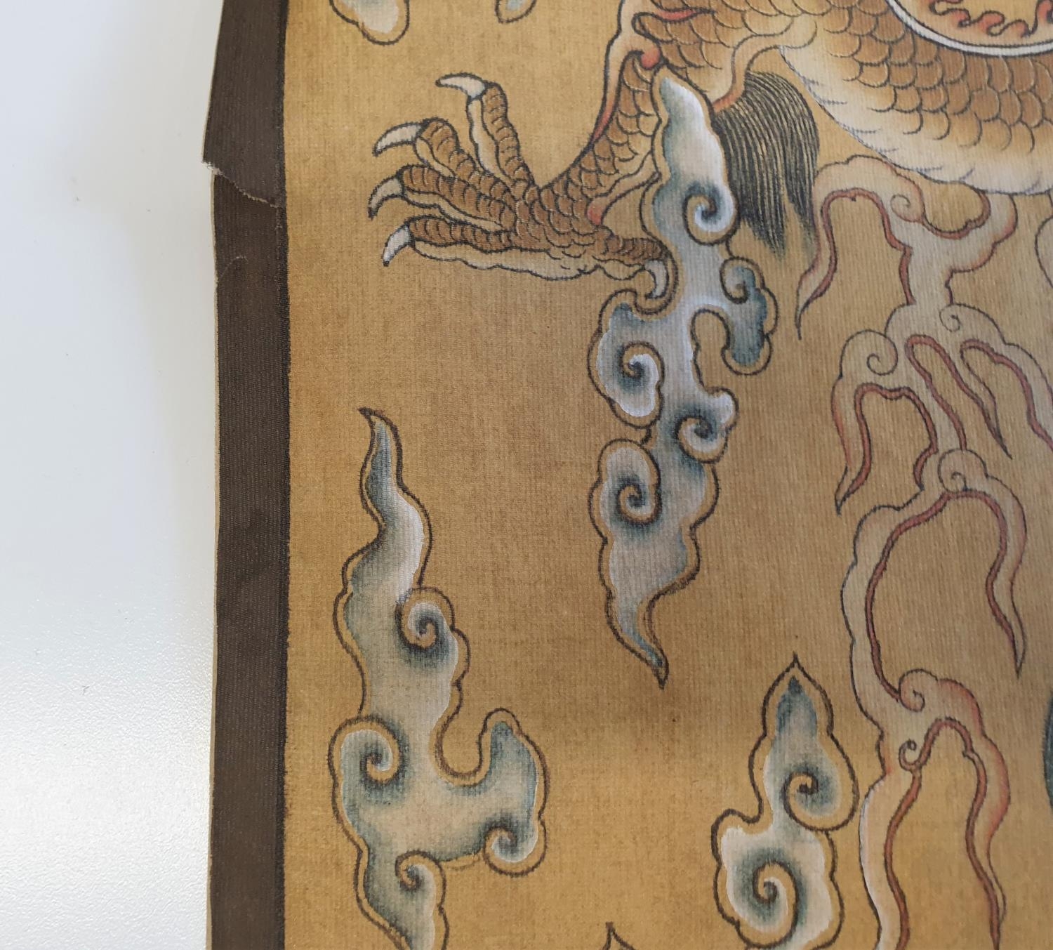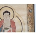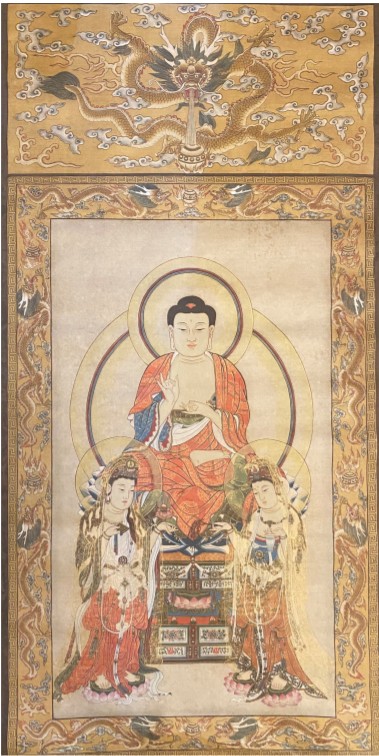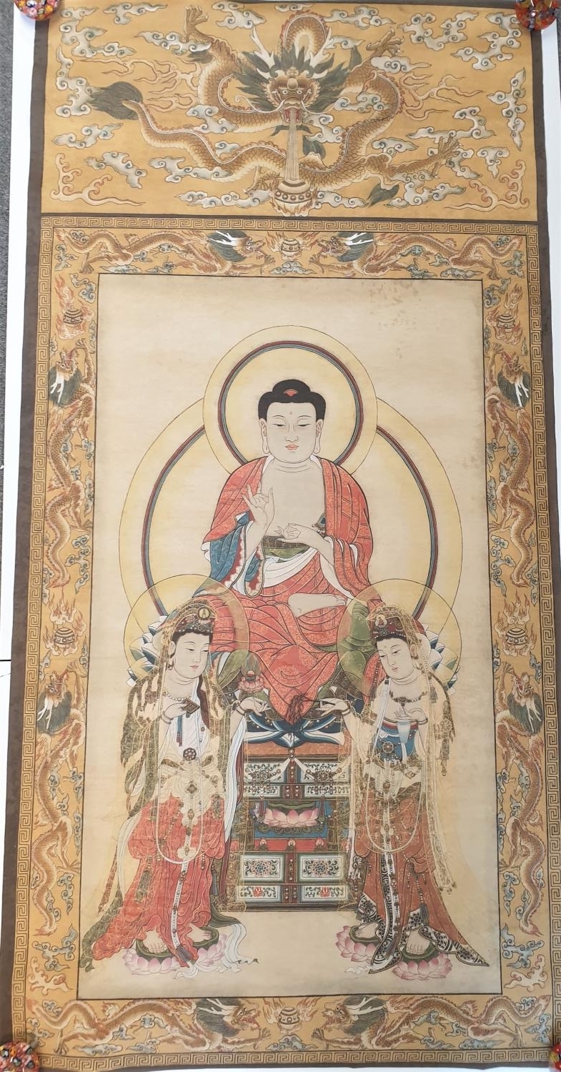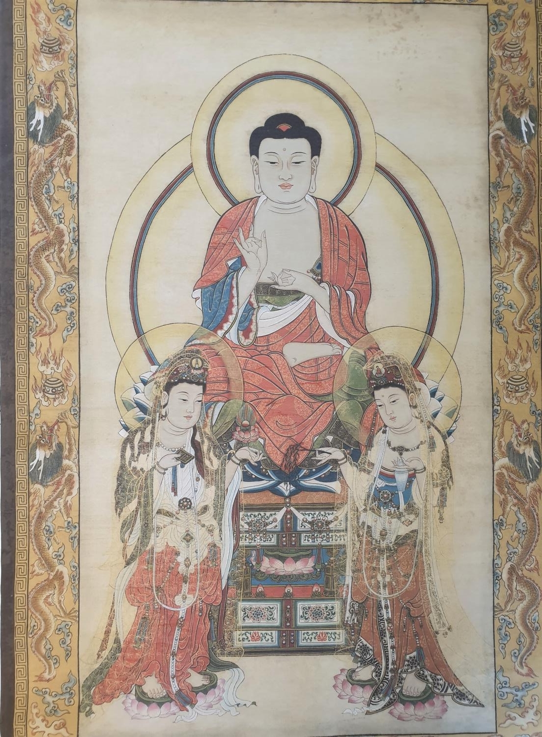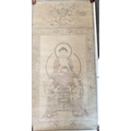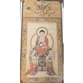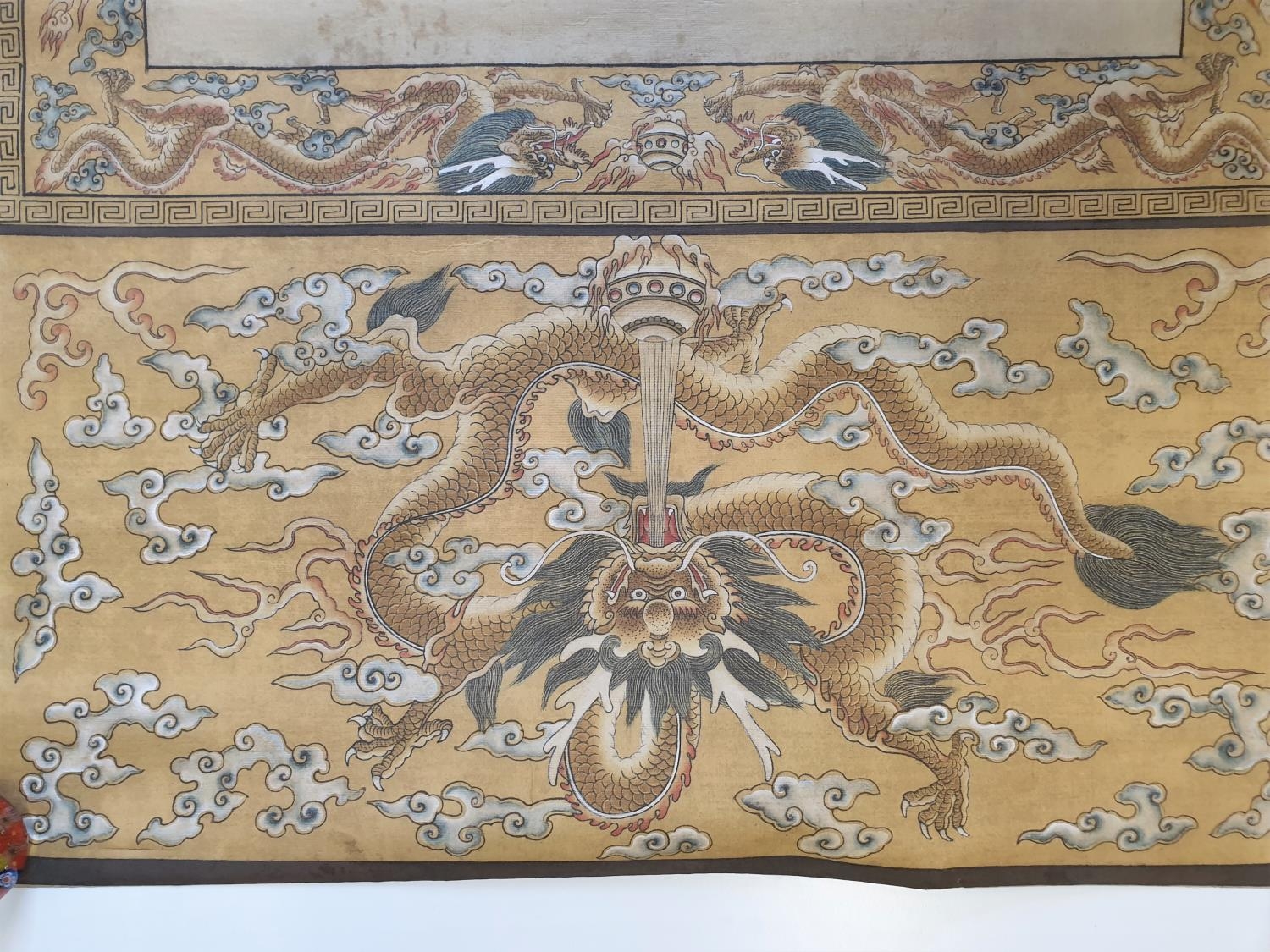 Antique Chinese Scroll Painting showing Figure Of Buddha with maidens With Golden Dragon border 130cm x 63cm