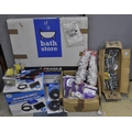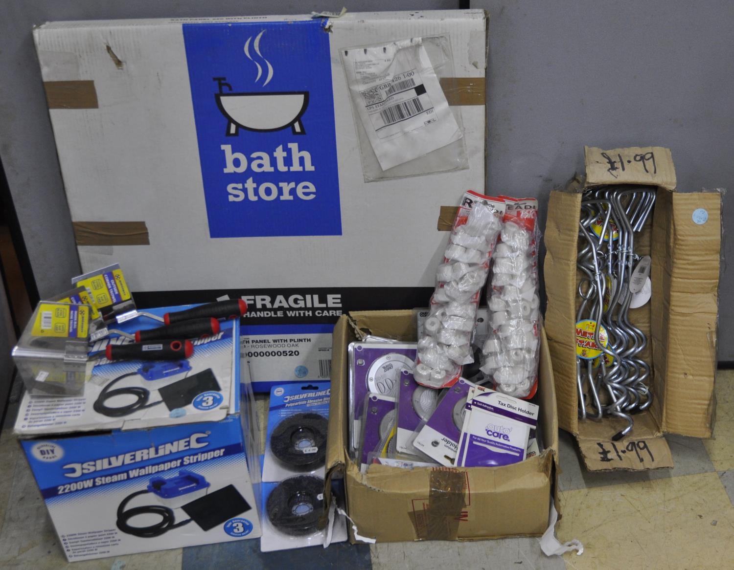BATHSTORE BATH PANEL, SILVERLINE WALLPAPER STRIPPER - INCOMPLETE, ABRASIVE DISCS, METAL STAKES, TAX DISC HOLDERS, ETC
