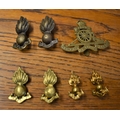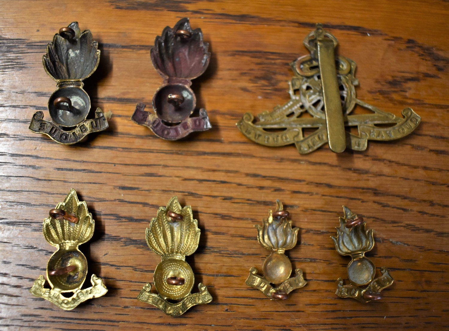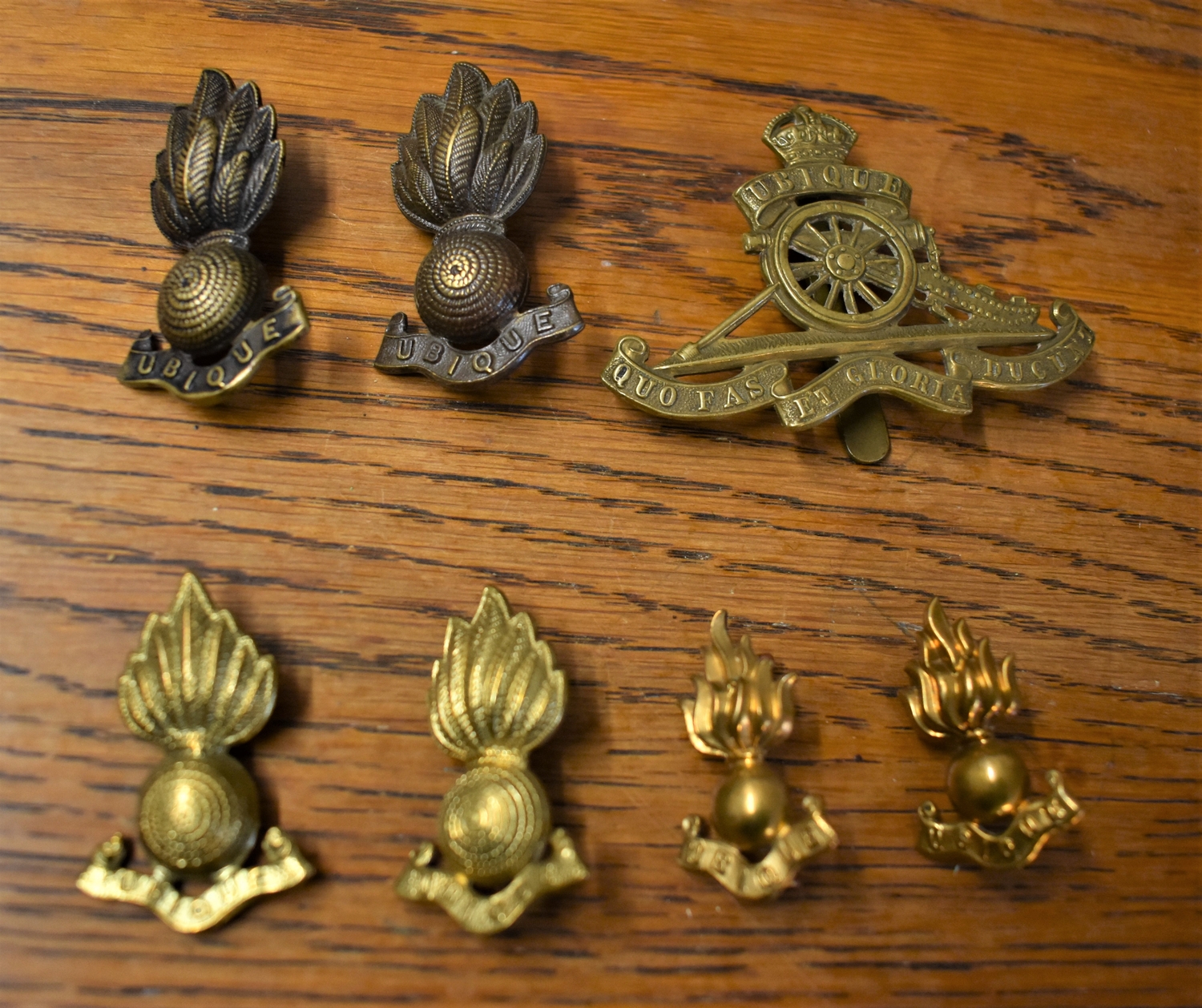 Royal Artillery WWII Cap Badge and three pairs of Officers Collar Badges, a good collection.