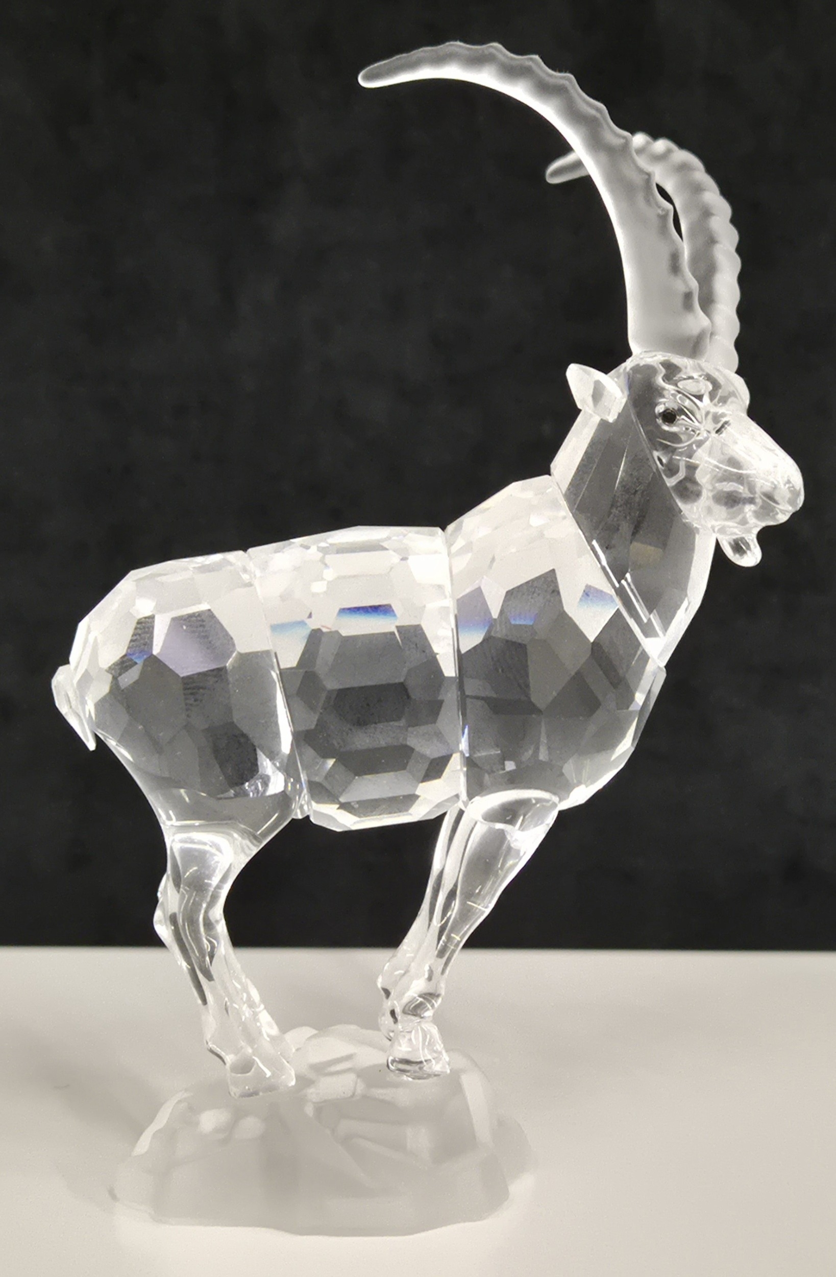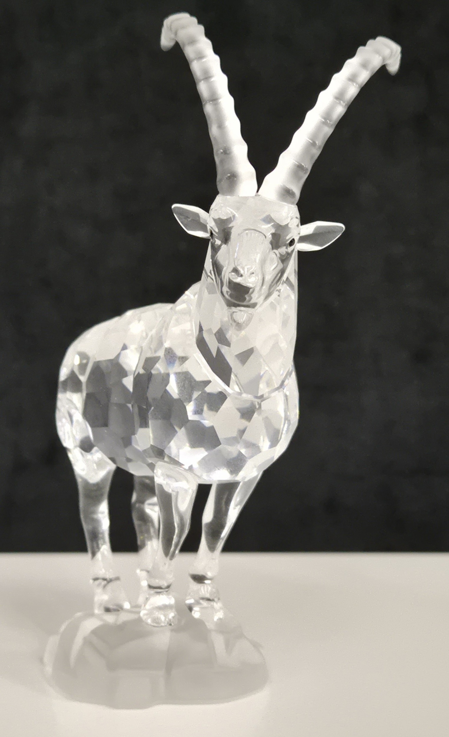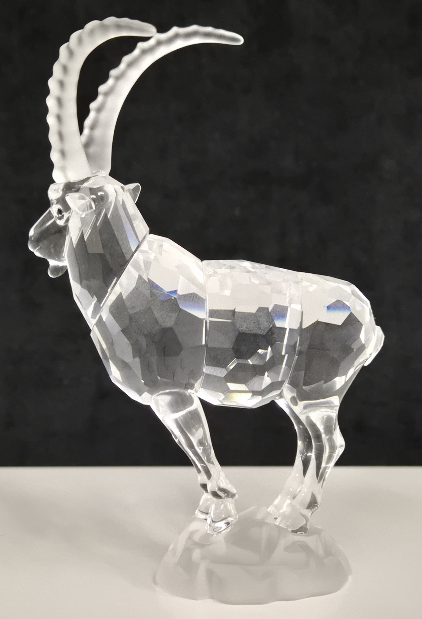 This retired Swarovski crystal Ibex was part of the “Endangered Species” range. The body is made from clear crystal, with the eyes being black, the horns and base comprise frosted crystal.
