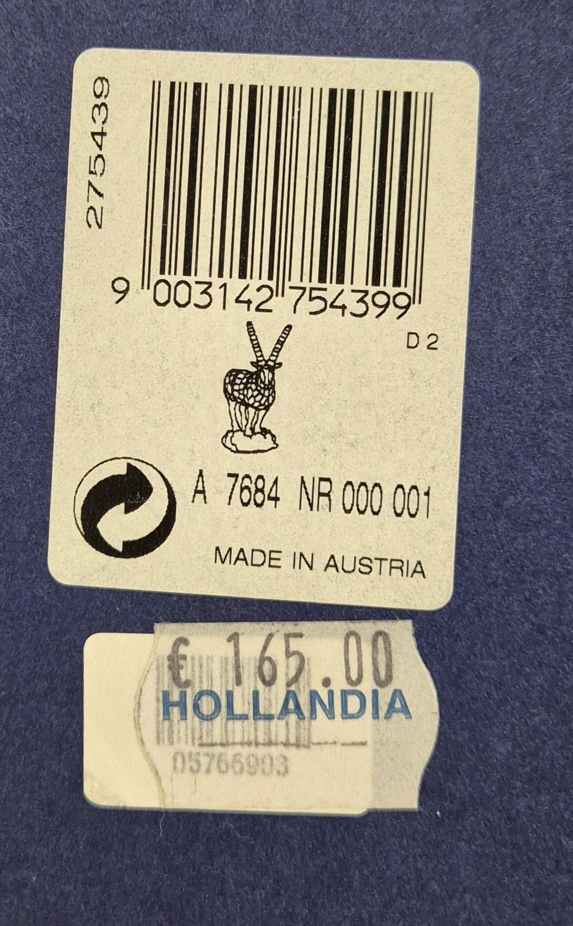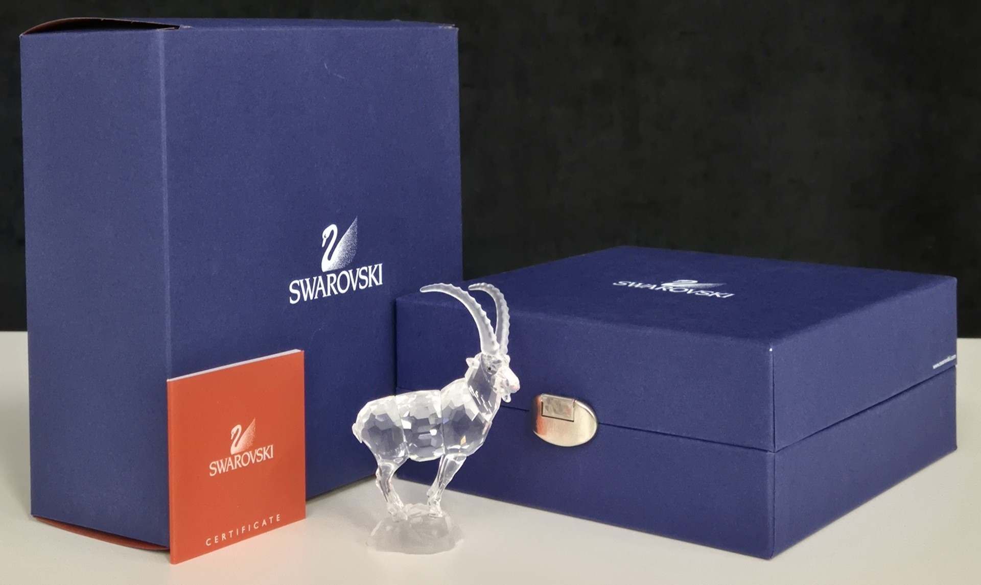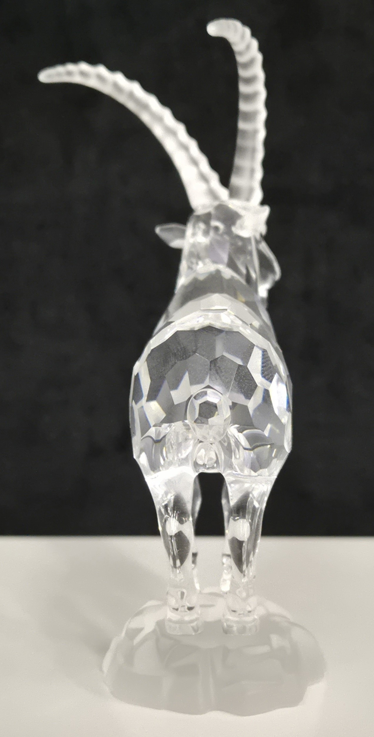 This retired Swarovski crystal Ibex was part of the “Endangered Species” range. The body is made from clear crystal, with the eyes being black, the horns and base comprise frosted crystal.