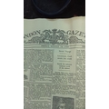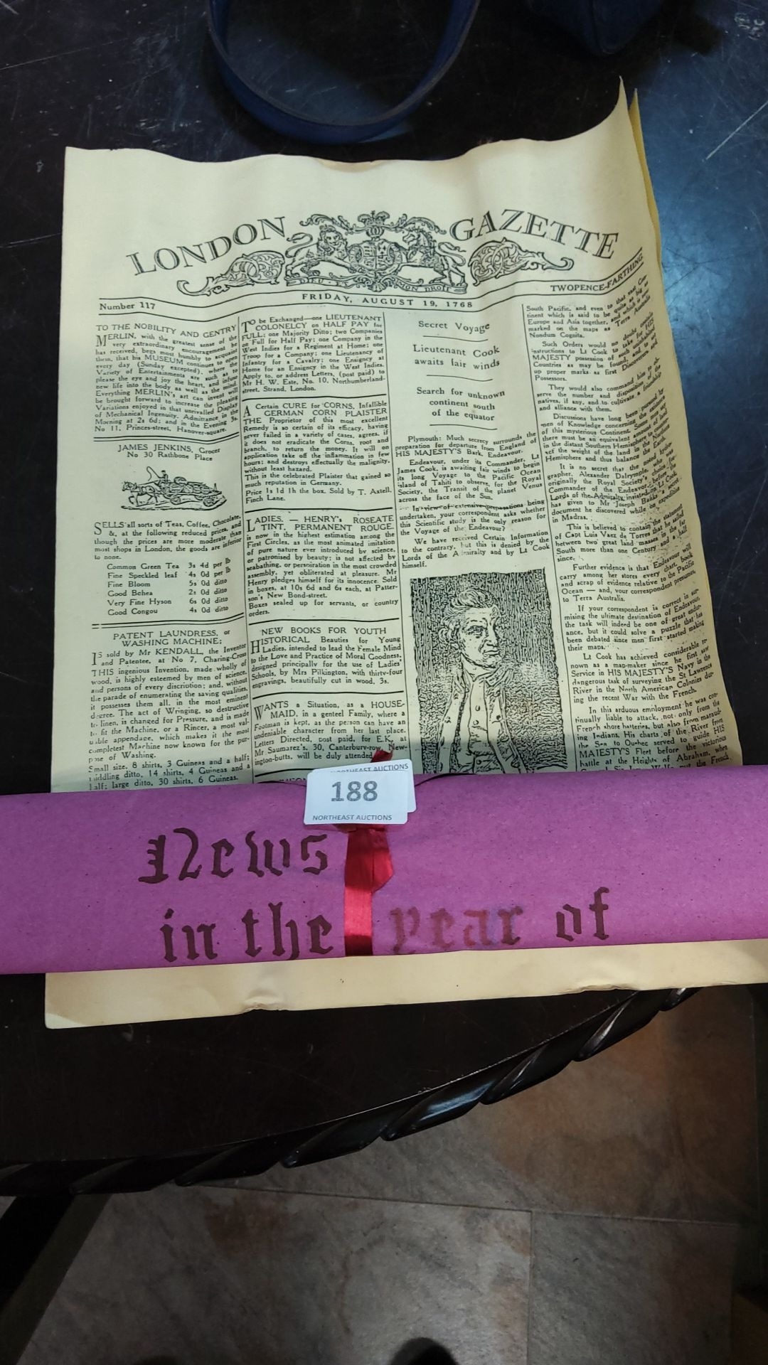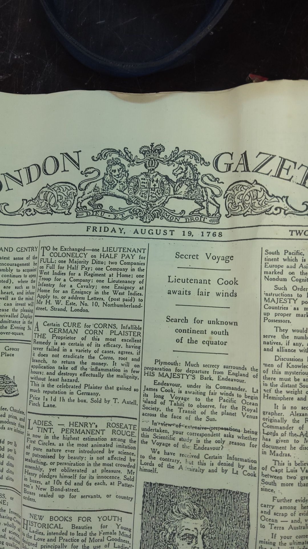 Replica of "London Gazette" from August 19, 1768, featuring an article about Lieutenant Cook's secret voyage. Decorative historical printing.