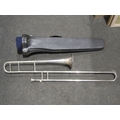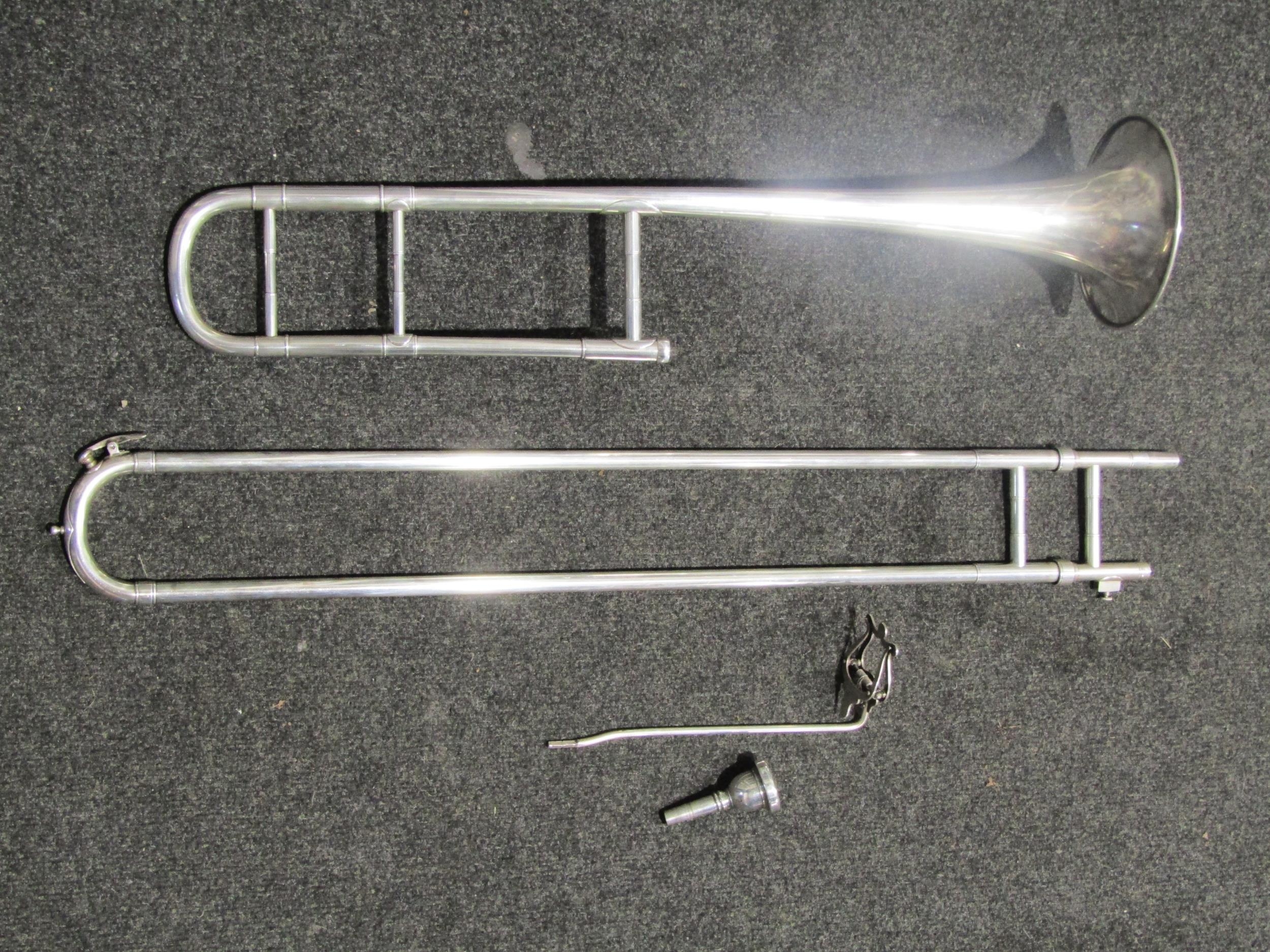 A British Band Instrument Co. Ltd. 'The Regent' Plated trombone, serial no. 148436 in a Hawkes & Son case. Case a/f