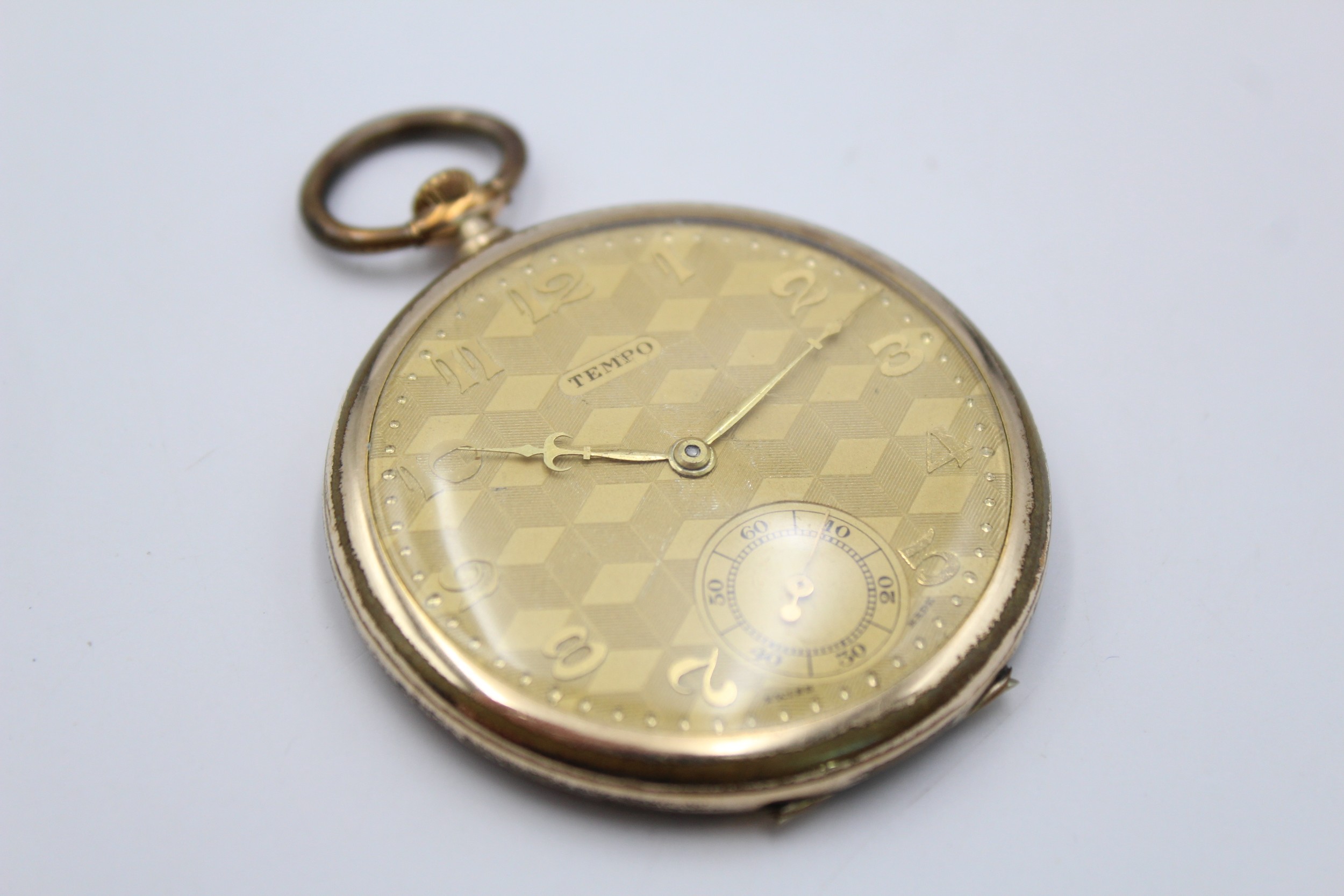 Vintage Gents TEMPO Rolled Gold Open Face POCKET WATCH Hand-Wind WORKING w/ Slimline Case, Textured Harlequin Design Dial Signed Tempo No Code On Case or Movement Dimensions - 5cm x 5.5cm In vintage condition Signs of use & age Gold rubbing to caseback edge See photographs