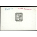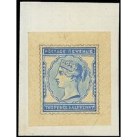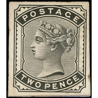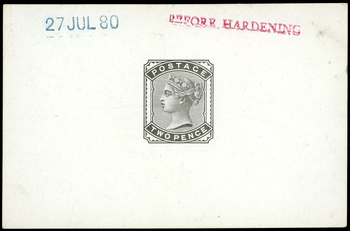 1880 2d rose. Very fine die-proof printed in black on white glazed card (92x61mm) dated ’27 JUL 80’ in blue and endorsed ‘BEFORE HARDENING’ in red. SG168. Cat. £1600