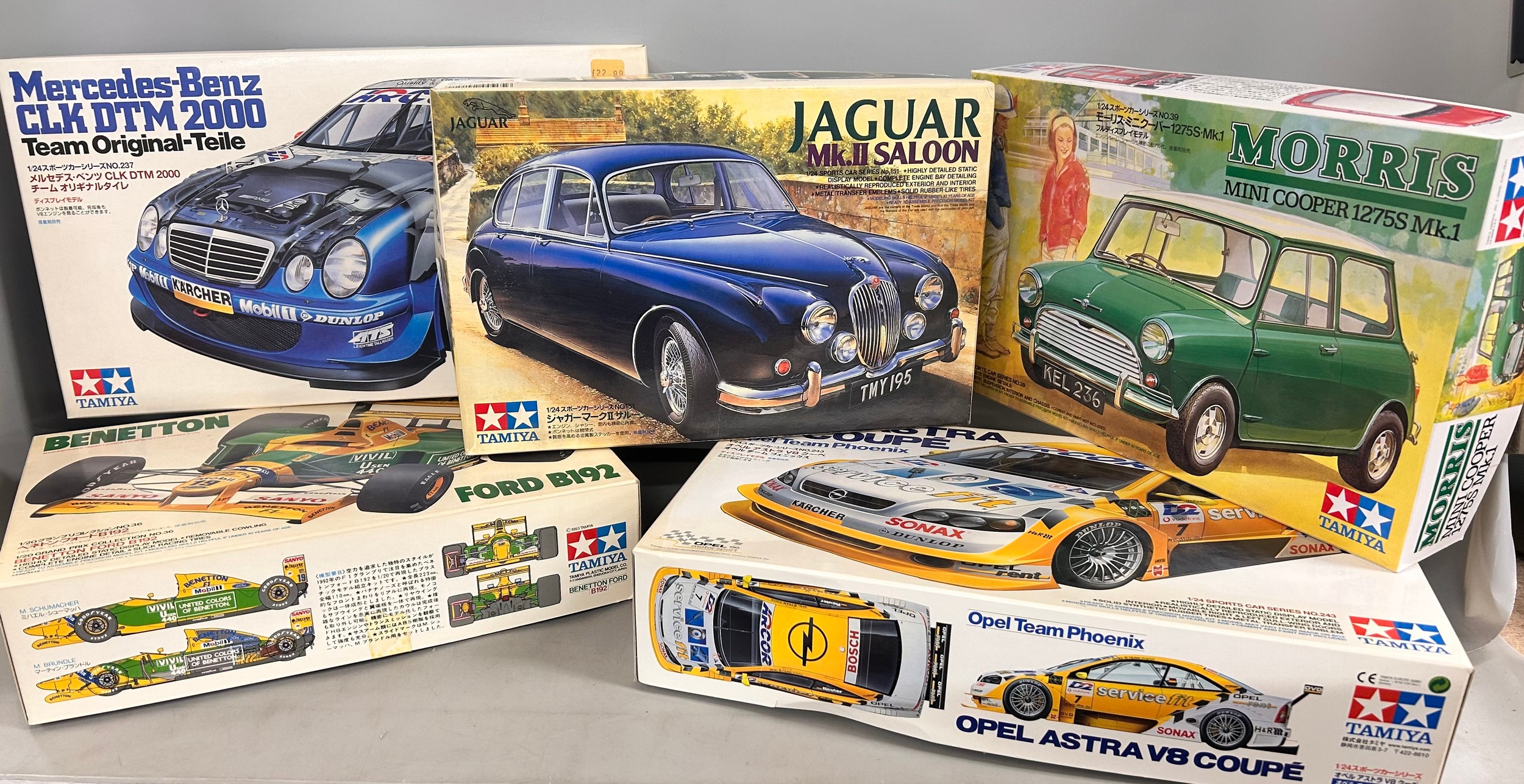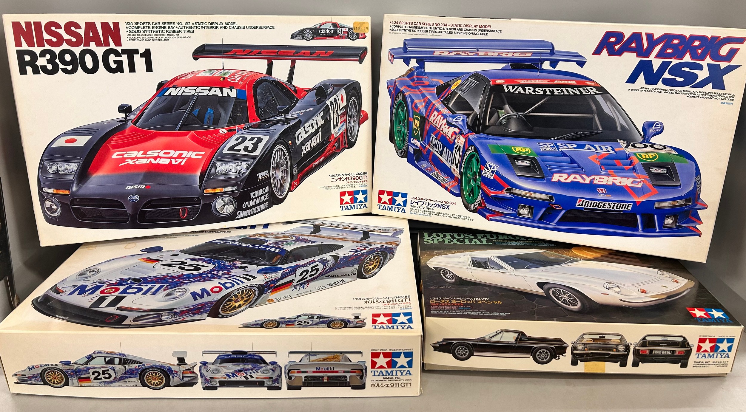 Nine Tamiya model cars with boxes, all built