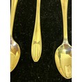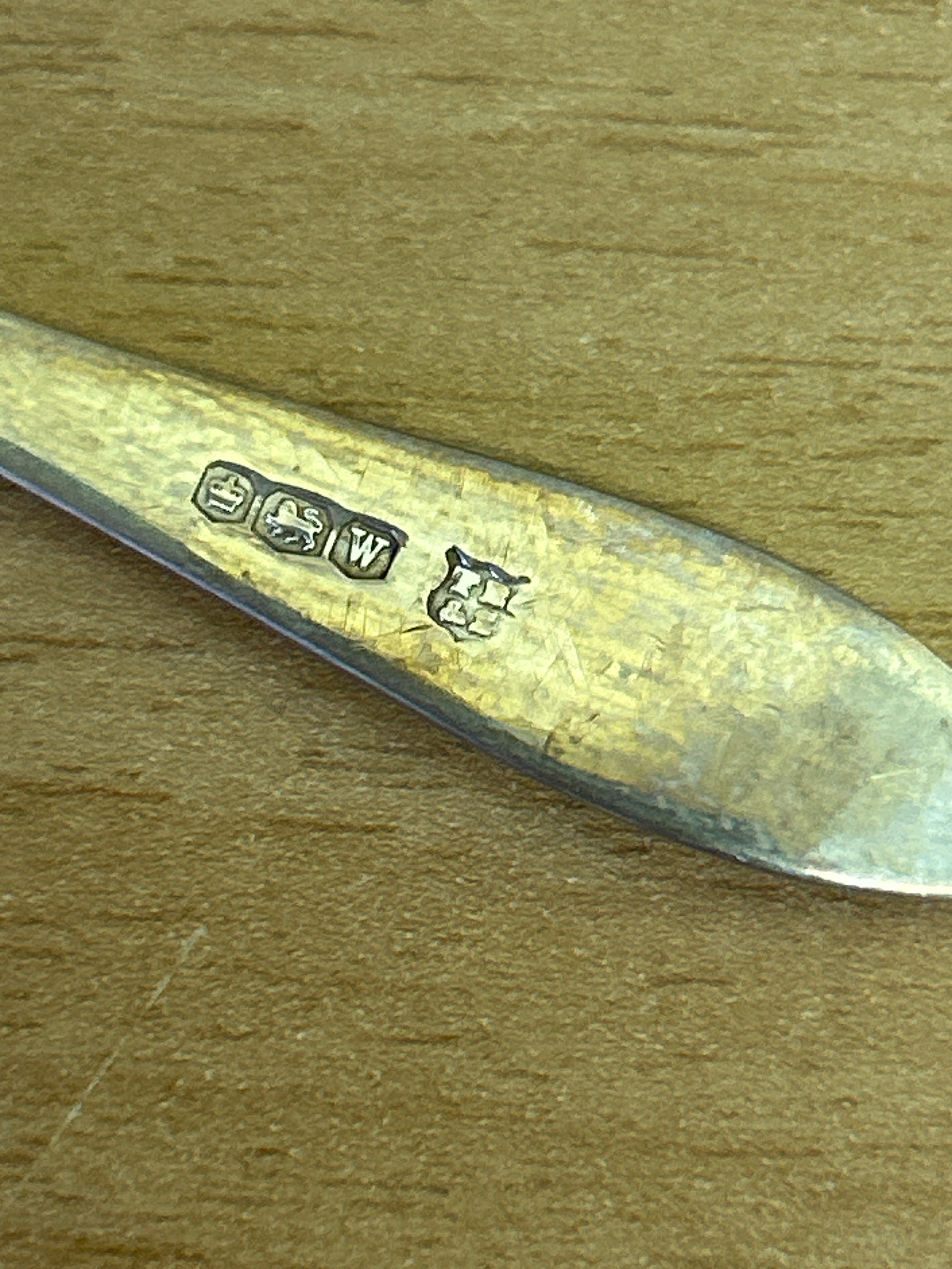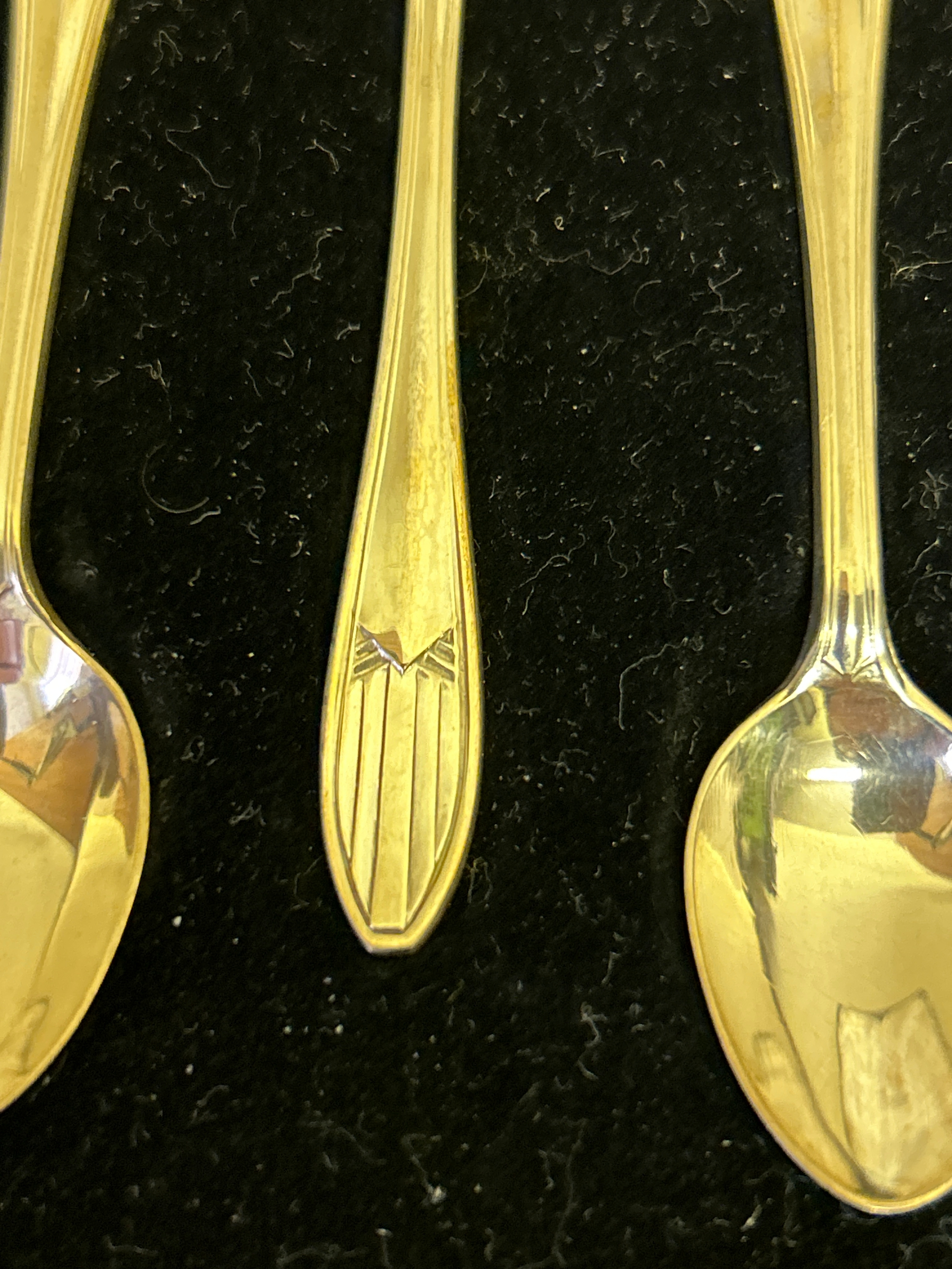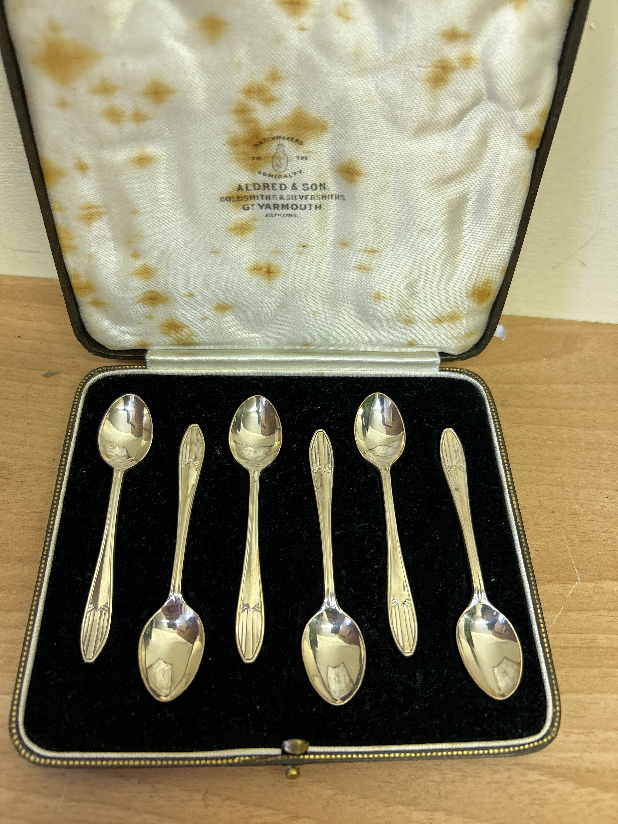 A boxed set of six Art Deco Sterling silver coffee or demitasse spoons, Sheffield 1939, Thomas Bradbury & sons. Original retailers box, Aldred & Sons, Great Yarmouth. 45 grams