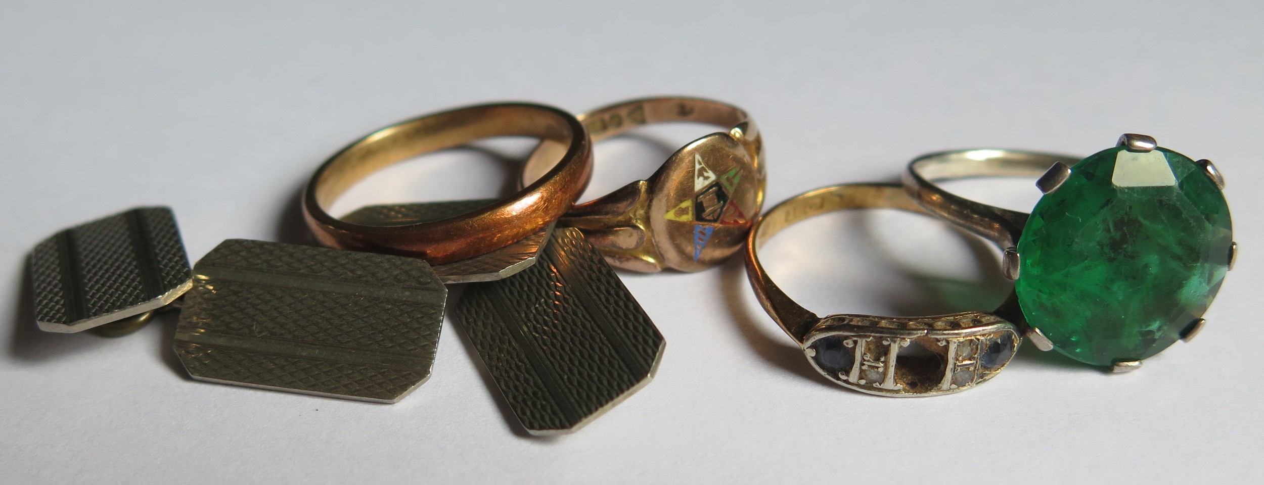 A Damaged 18ct Gold Ring (2.24g), 9ct signet ring (2.14g), yellow metal band (4.06g), pair of cufflinks and a paste ring