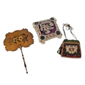 Featuring a bird motif in seed and bugle beads, a Victorian fixed screen fan, the scalloped wooden leaf hand painted with pansies and a small needlepoint reticule with green velvet trim and corded tassels, typical age related wear.