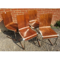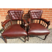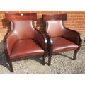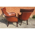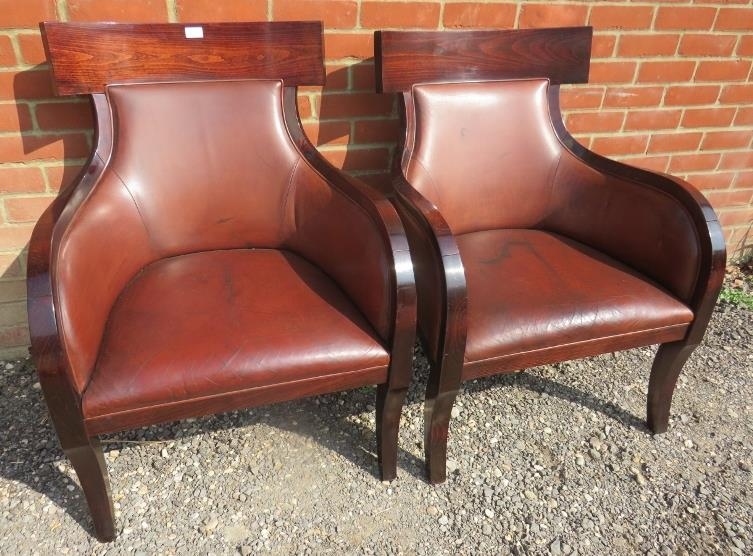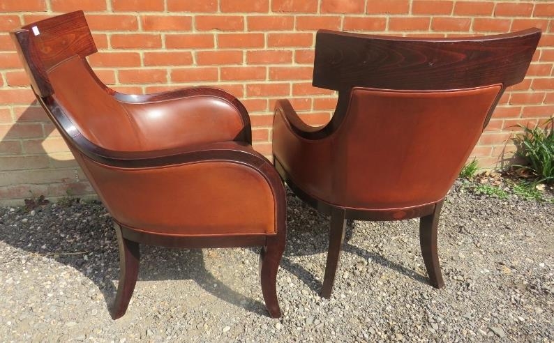 A pair of contemporary richly coloured fruitwood armchairs in the French Empire taste, upholstered in tobacco brown leather, on sabre legs.
