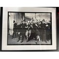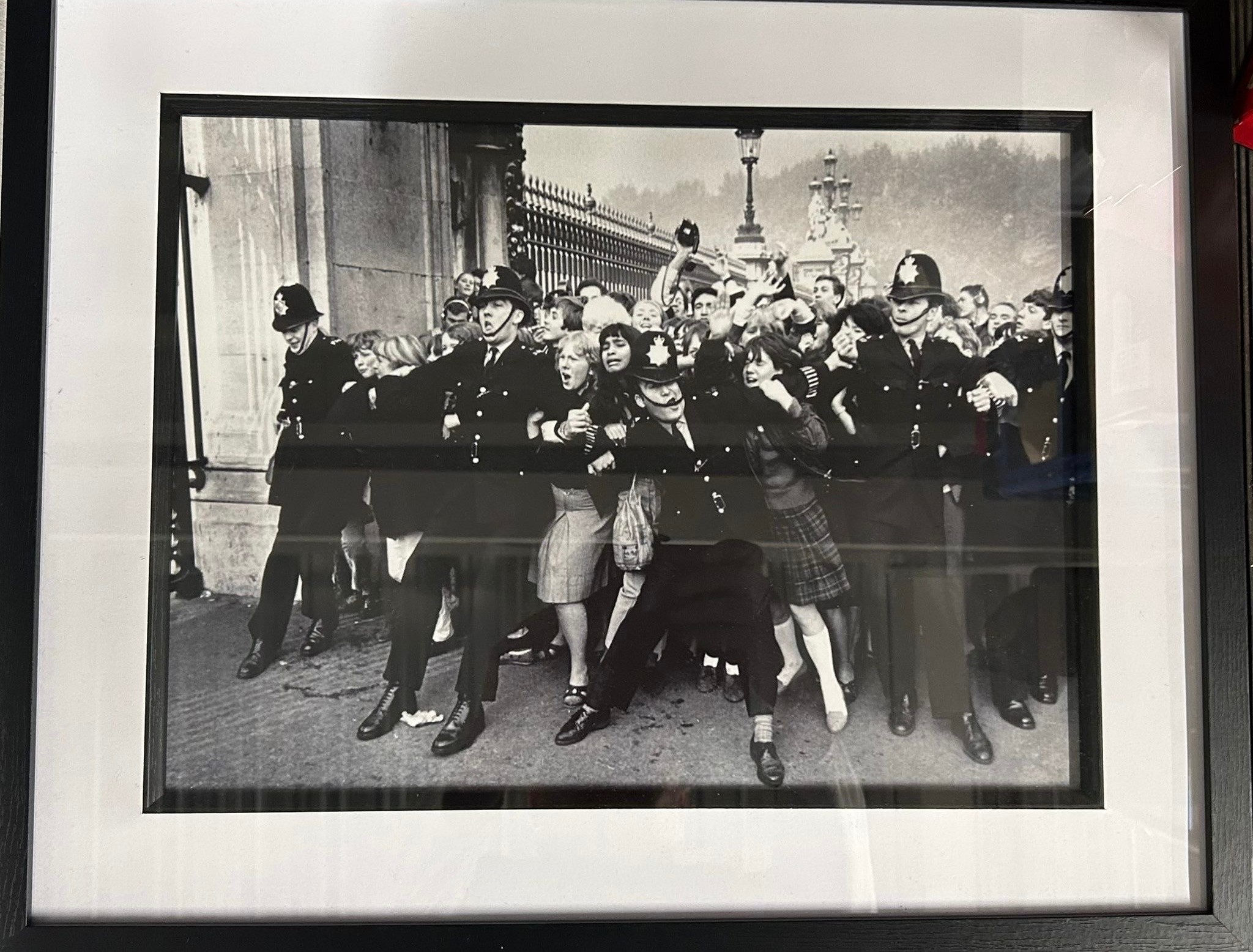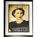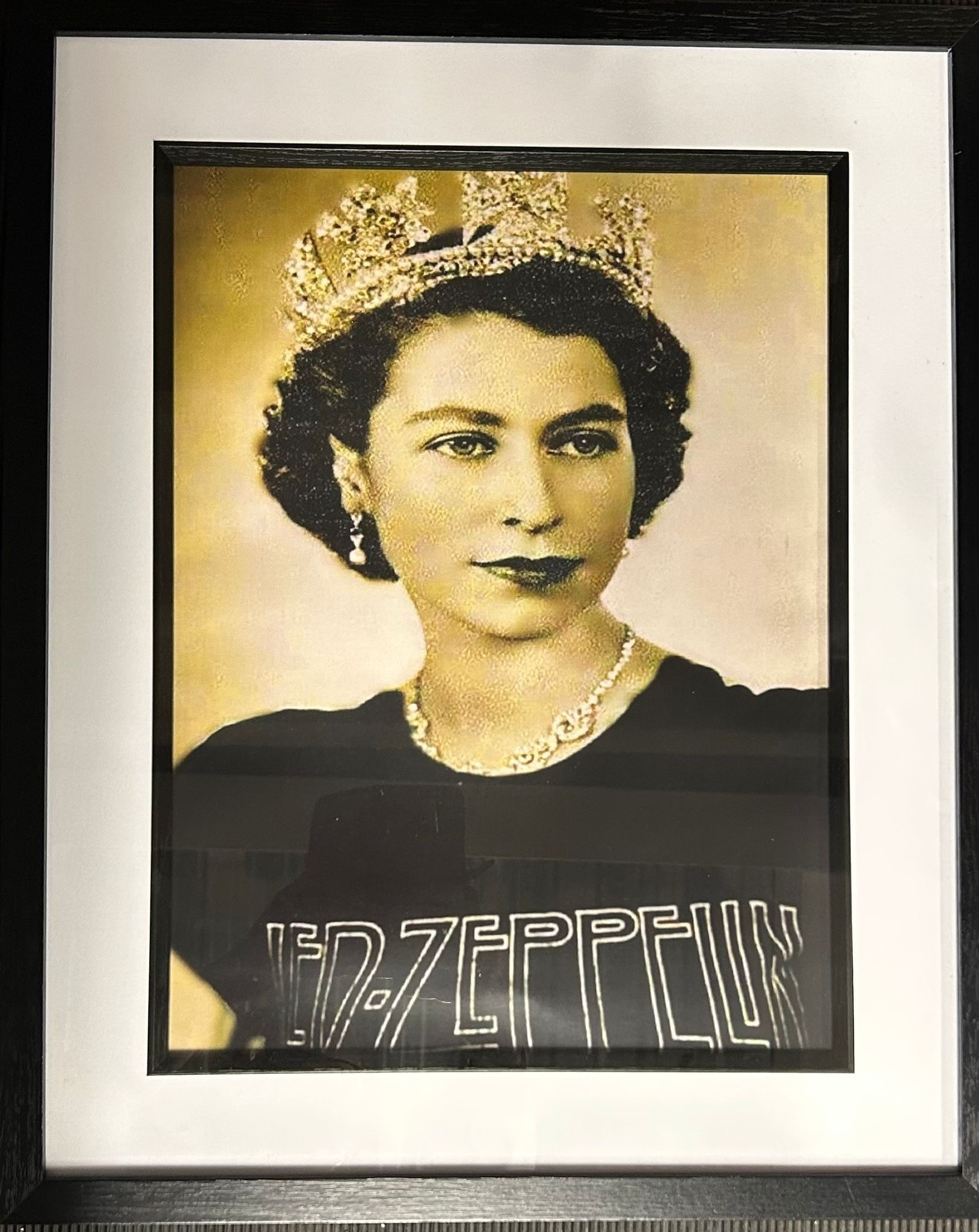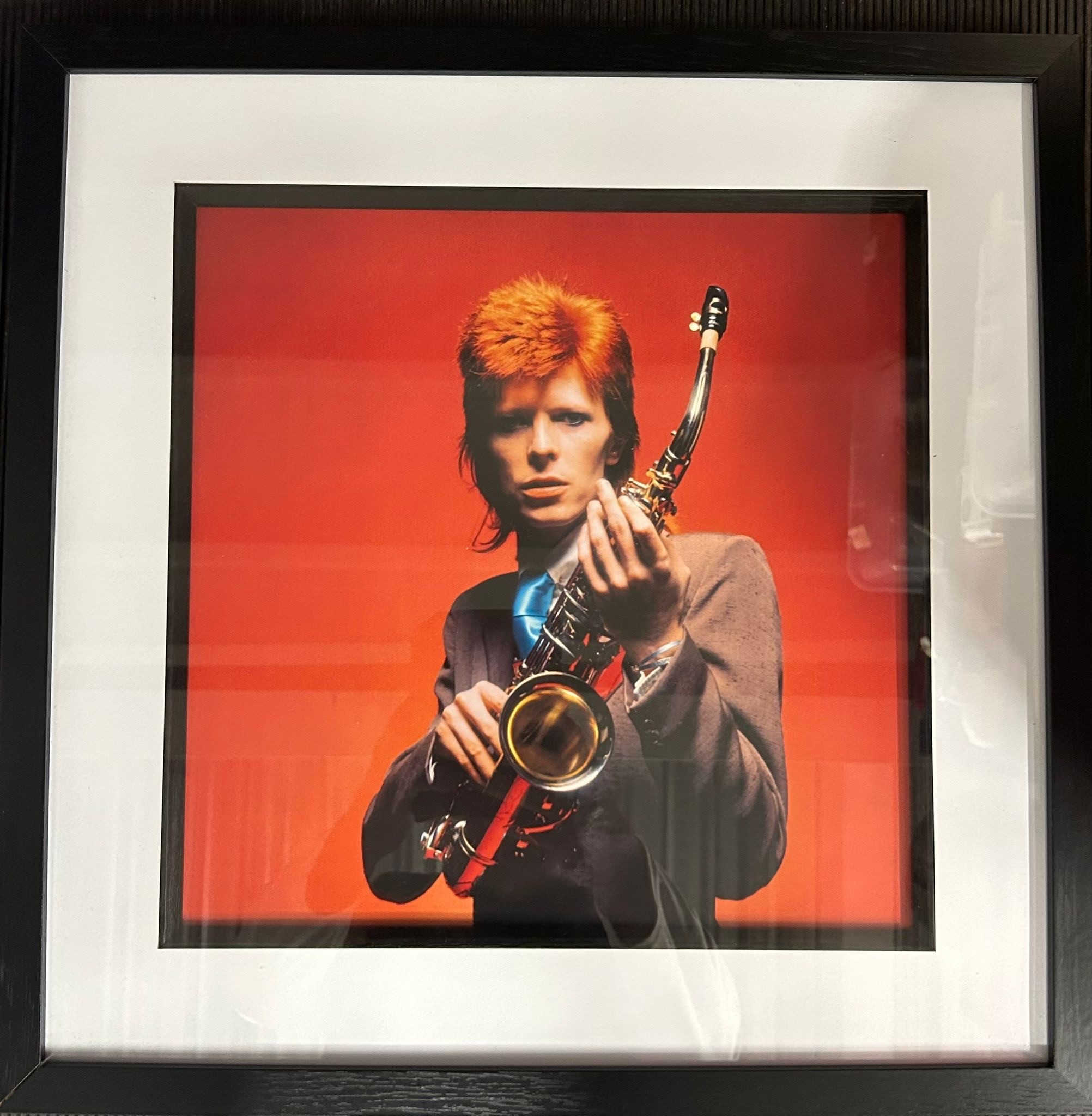 3 pictures; David Bowie portrait holding Sax red, London 1973 17" x 17" - Queen Elizabeth 2nd featured in a humorous mashup artwork wearing a Led Zeppelin t-shirt 21" x 17" - A framed print by Fin Costello of The Police restraining crowd 21" x 17".