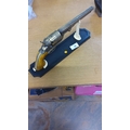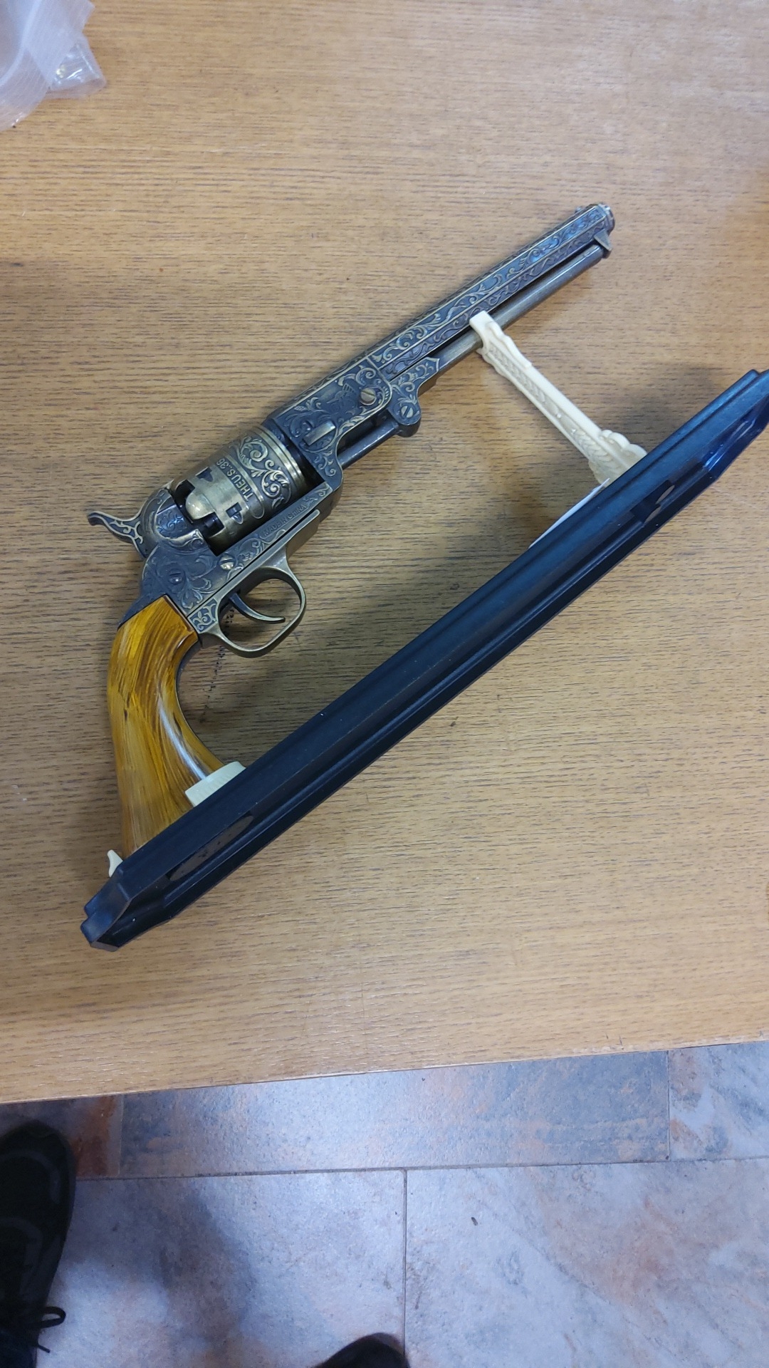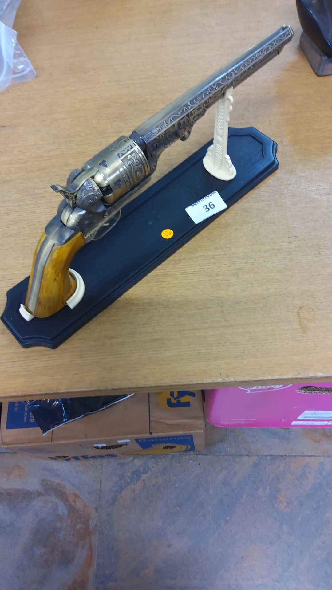 Decorative die-cast model of a Colt-style percussion revolver, late 20th century, with engraved barrel and cylinder, brass-tone frame and wood-effect grip, mounted on display plinth.