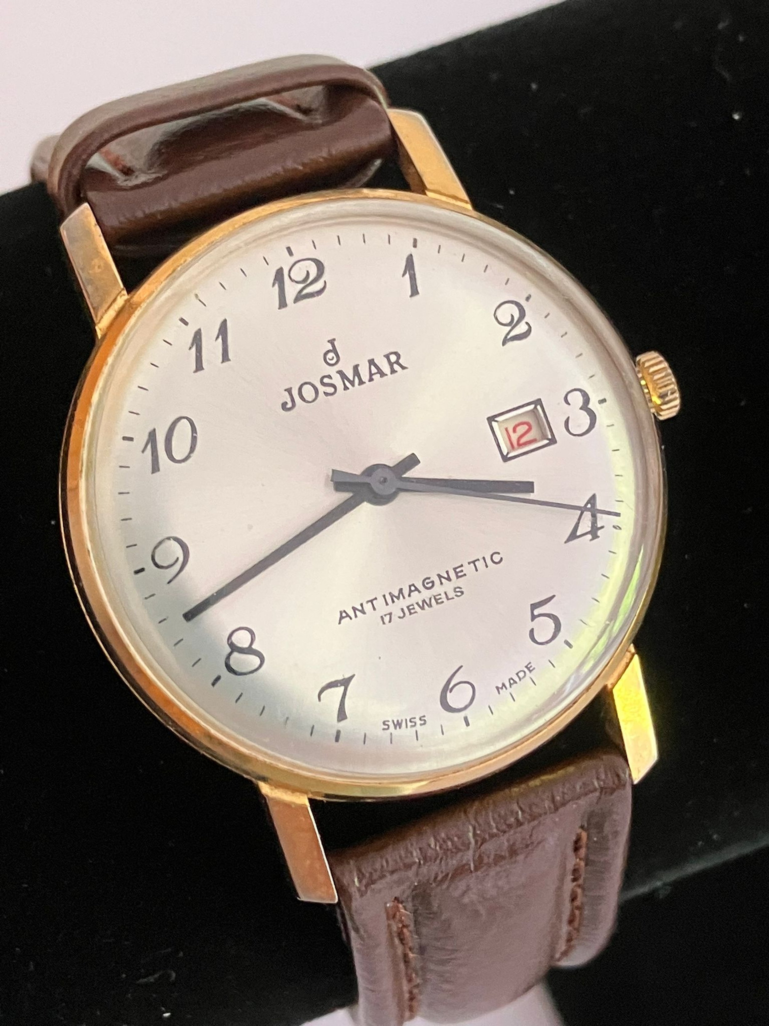 Gentleman’s rare Vintage 1960’s ‘JOSMAR’ WRISTWATCH. Finished in Gold Tone. 17 Jewels. Anti-magnetic.Swiss Made. Quality brown leather strap. Manual winding in full working order. Incredible condition, please see pictures.