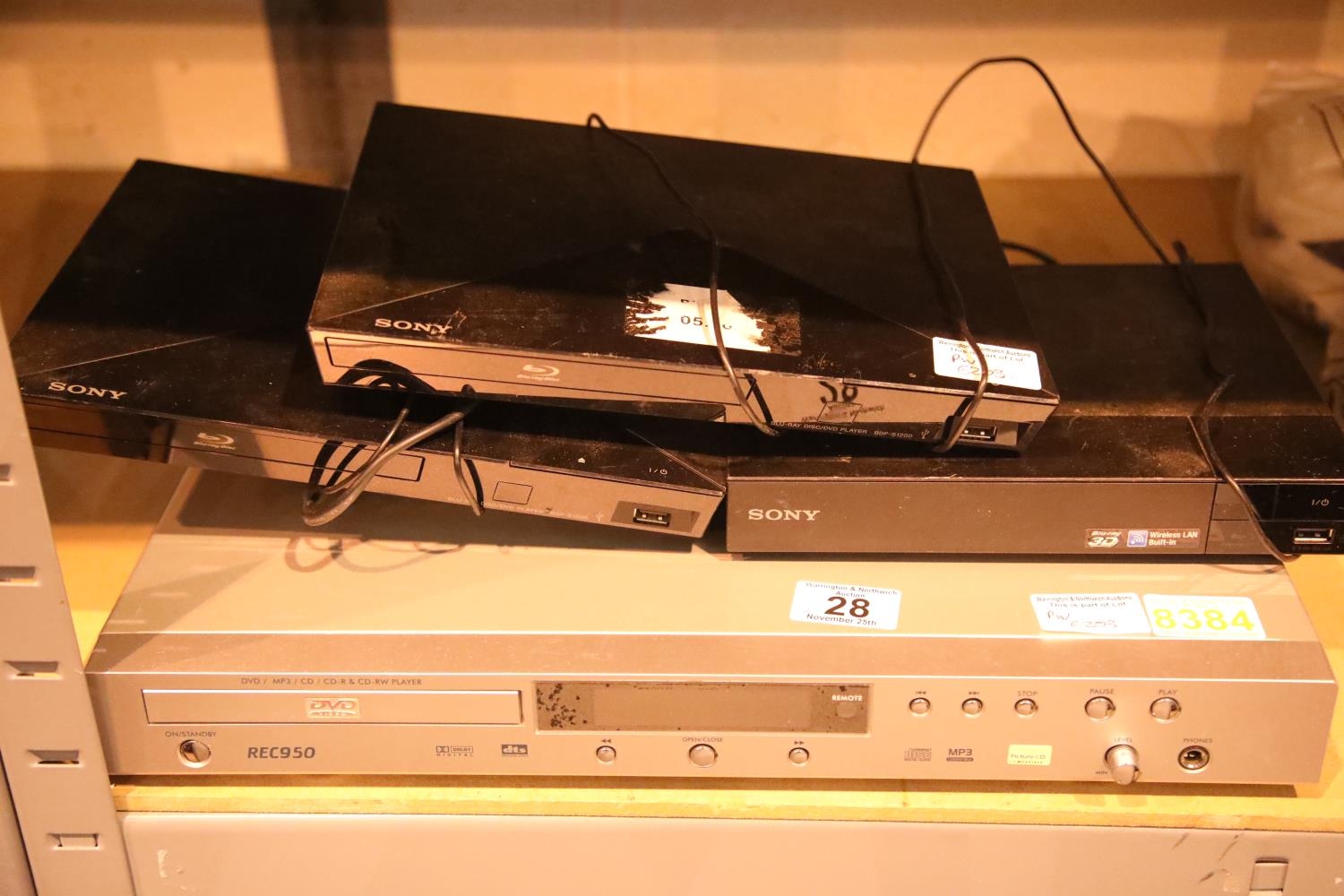 Three Sony Blu Ray and DVD players, and an REC 950 DVD player with remote. Not available for in-house P&P