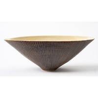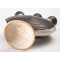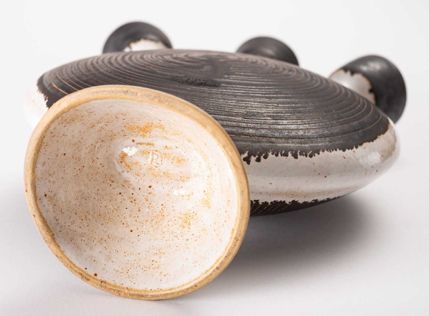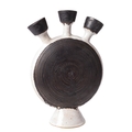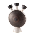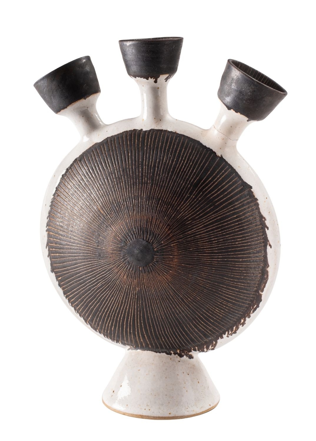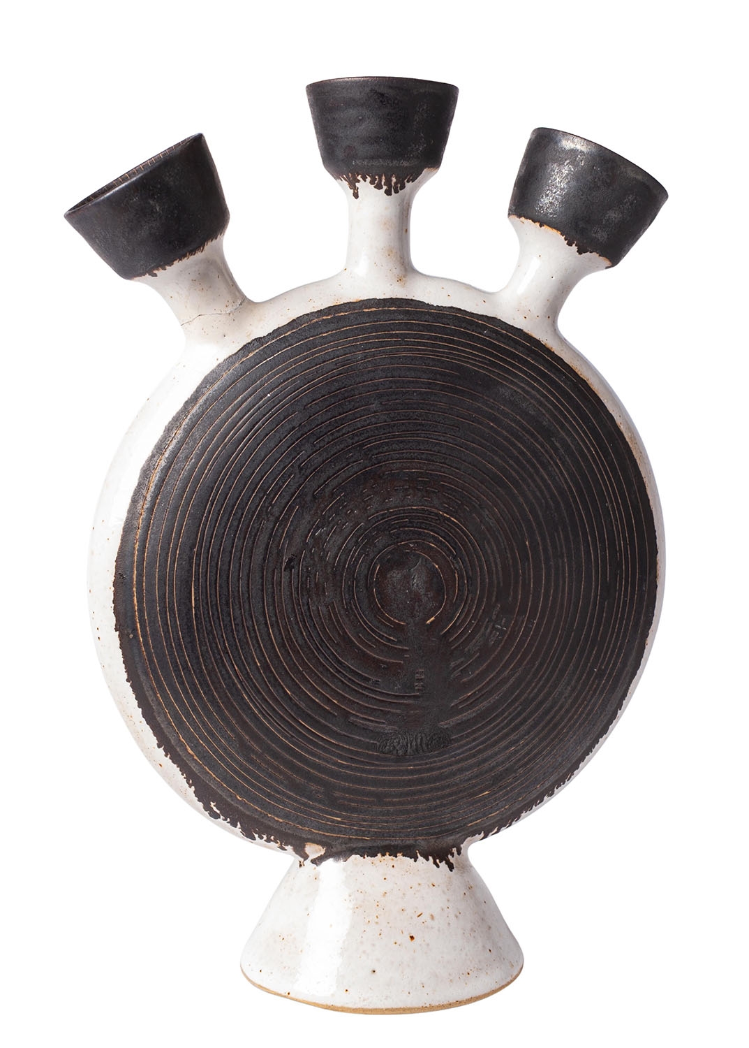*Dame Lucie Rie DBE [1902-1995] a stoneware composite bottle, the disc shaped body with triple necks, the off white body with central circular manganese panel with sgraffito decoration, radiating on one side and concentric verso, impressed personal seal, 29cm high, [clean glue repair to one neck].
